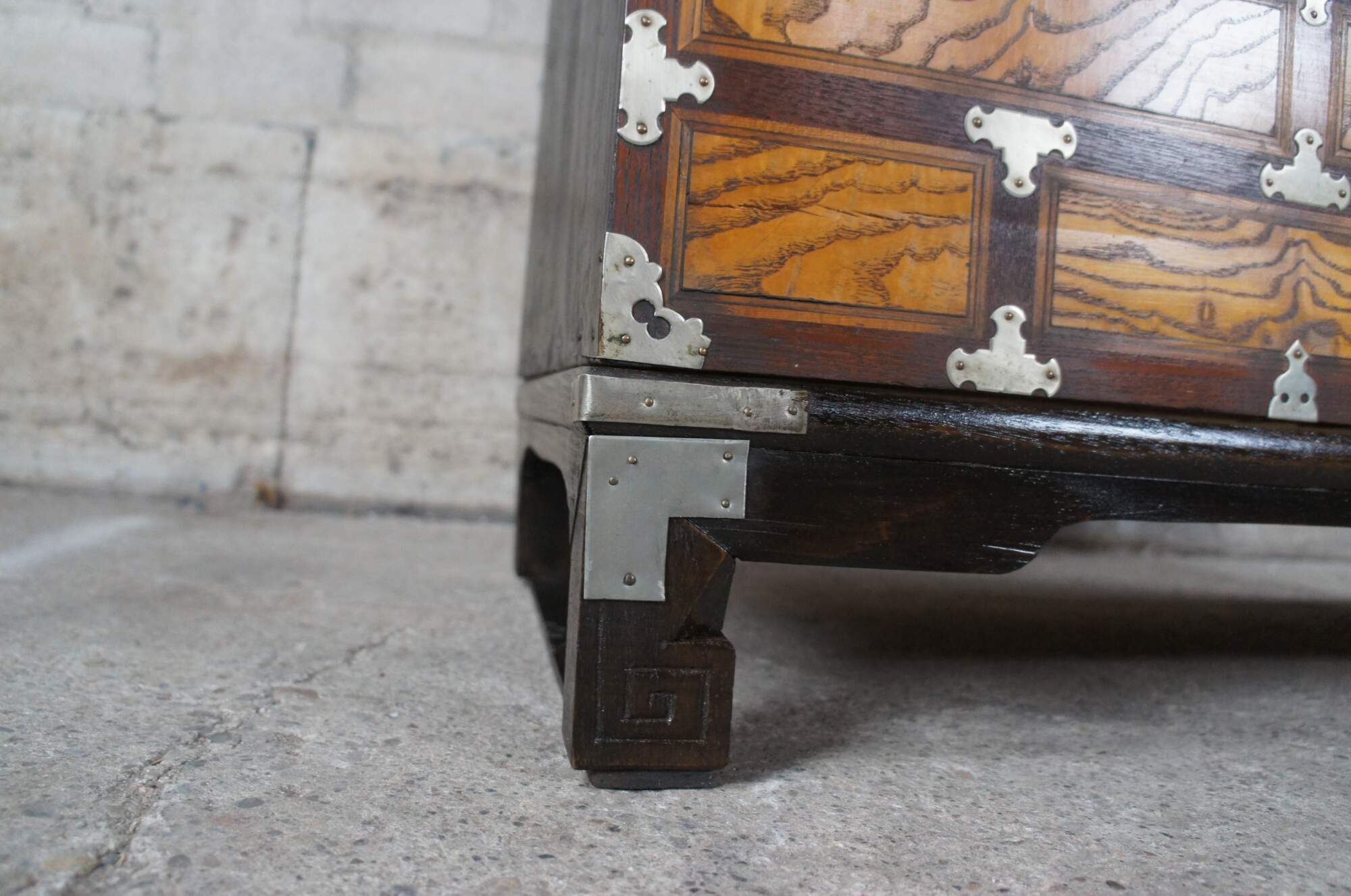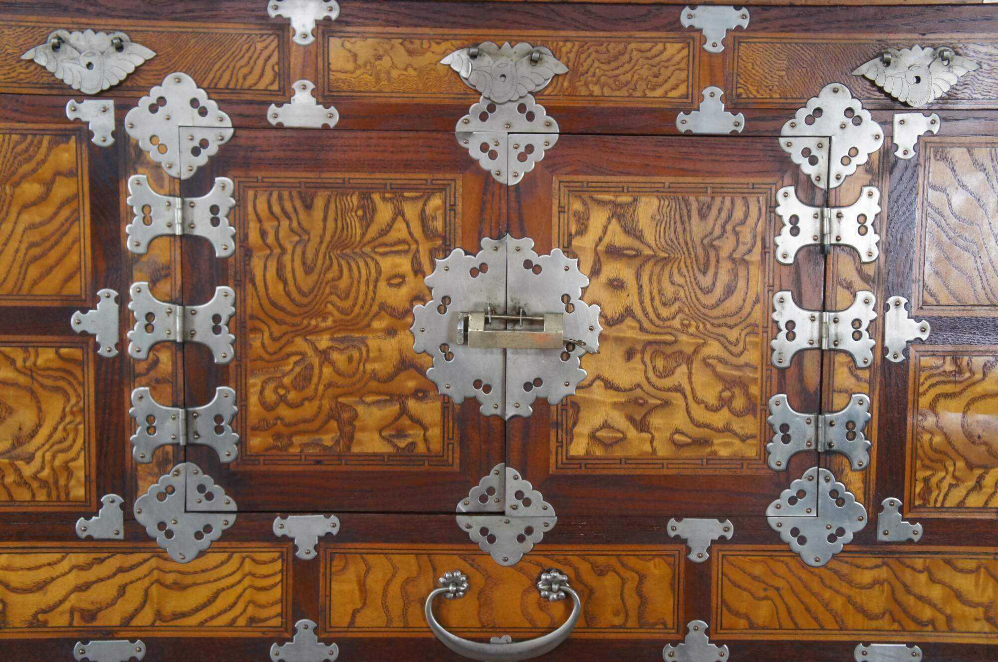 Korean Bandaji chest or trunk featuring elm frame with brass accents. The Korean name bandaji (literally meaning ""half closing"") derives from the hinged door in the front of this chest. This type of chest was one of the most essential, and most commonly found, pieces of furniture in a Korean household. Clothes, documents and valuables would be stored inside while folded blankets would be placed on top during the day (which explains why it is called a ""blanket chest"" in English). This chest, with its richly decorated fittings and extensive metalwork, was produced in the northern provinces of the Korean peninsula,