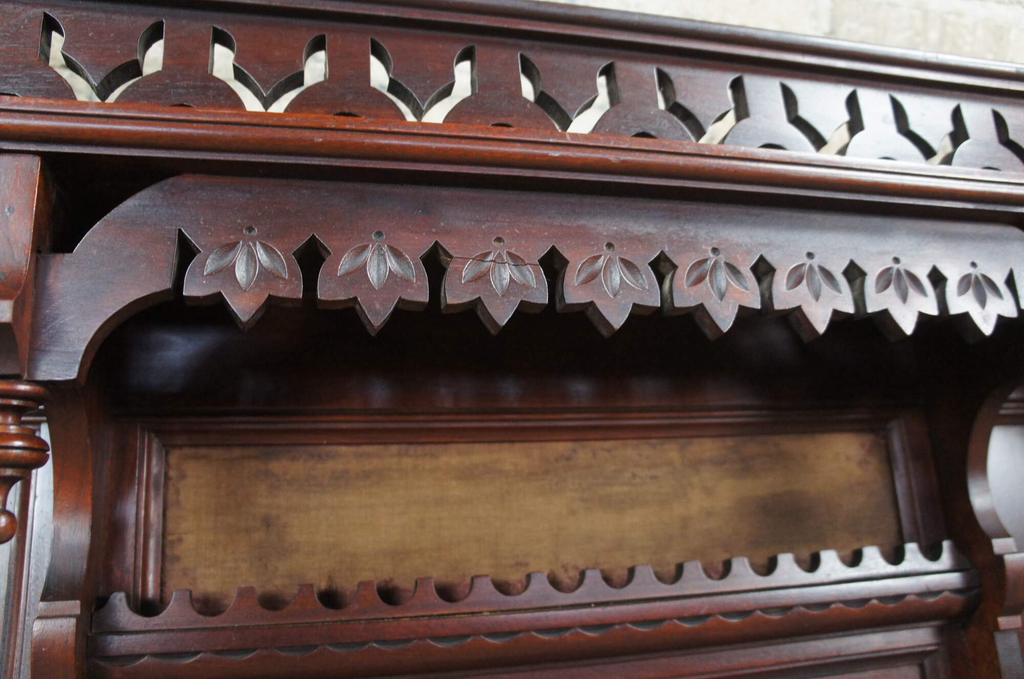 An antique Victorian backsplash. Made from walnut with pierced and carved backsplash with a turned column support. This piece most likely came from an old pump organ, but works well with the right sized buffet, sideboard or server.