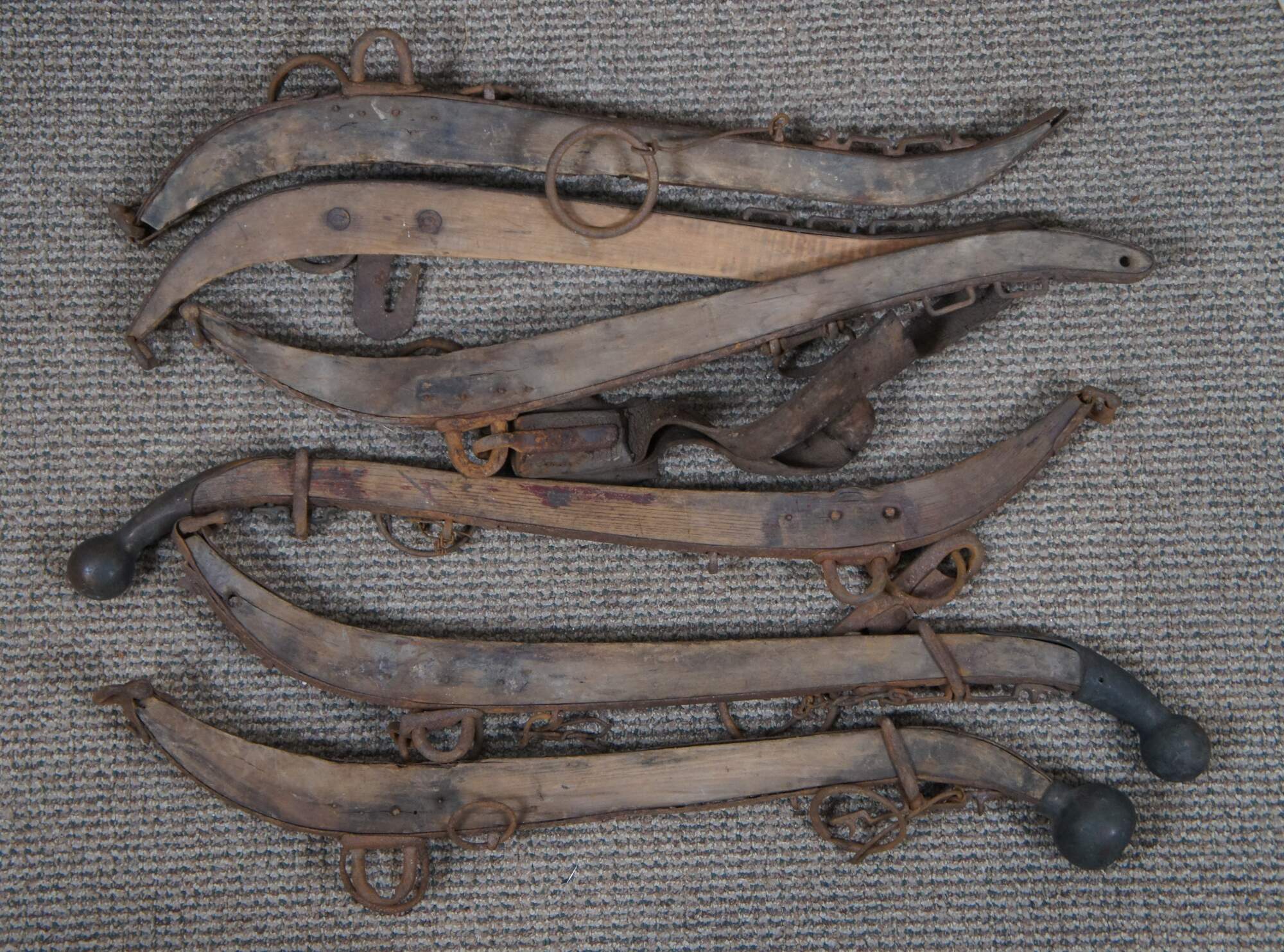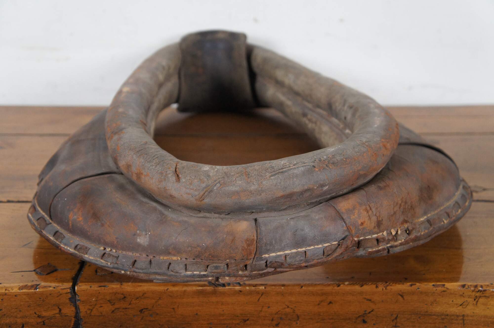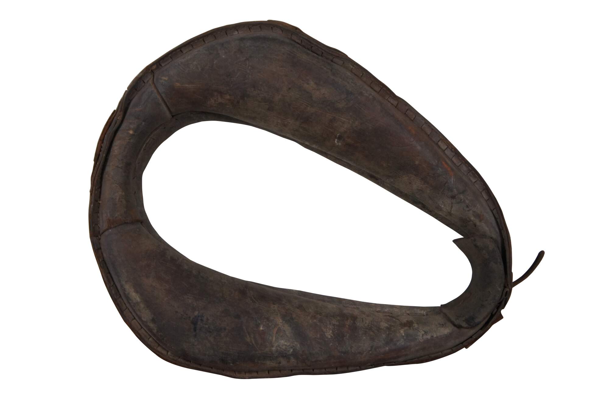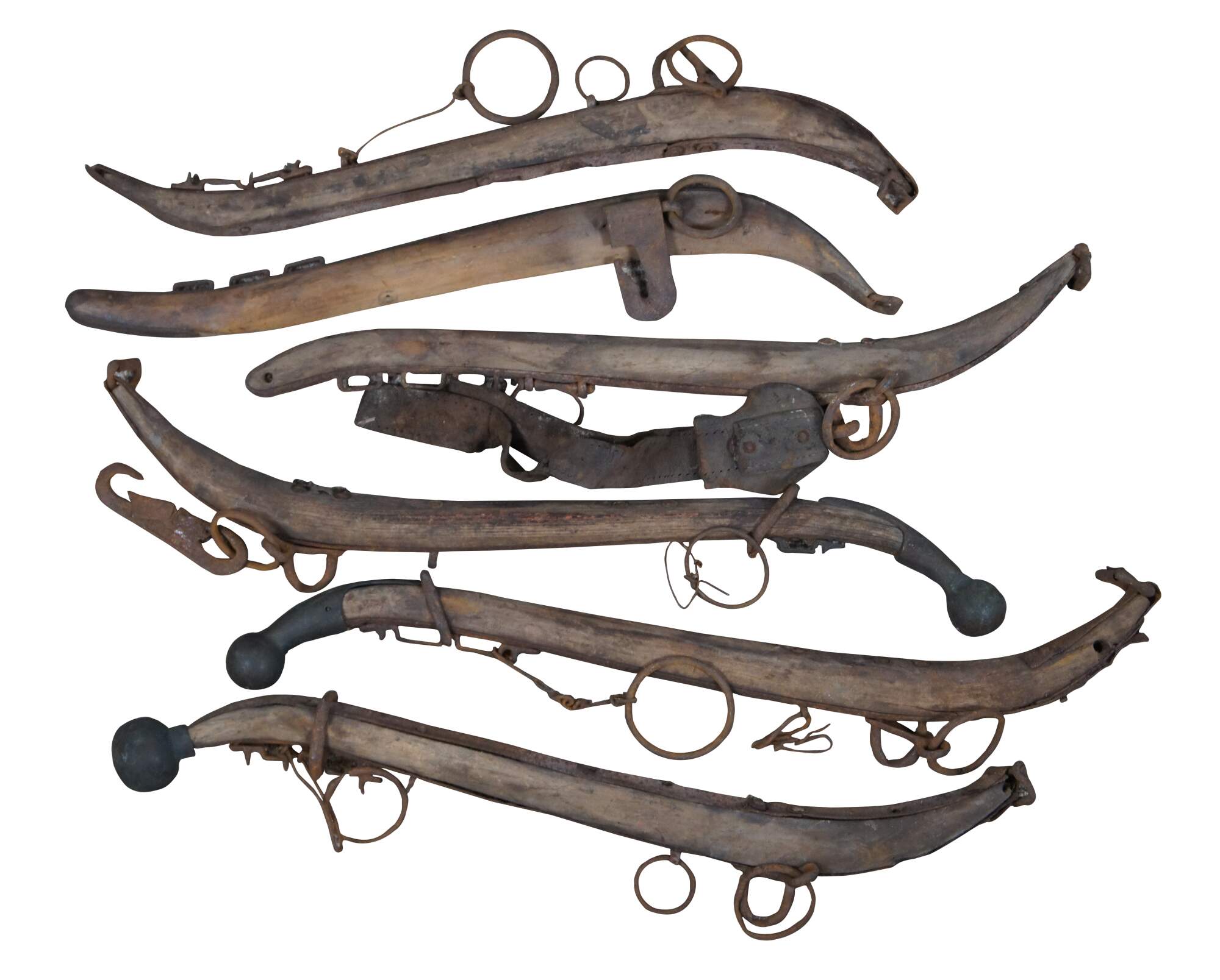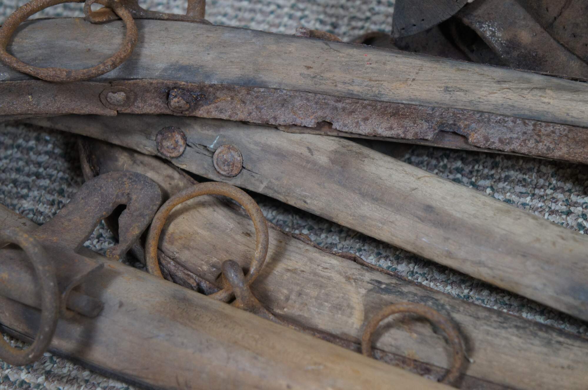 Lot of antique (plus one vintage/modern) pieces of horse tack including: One antique leather plow collar / yoke for a horse or mule. Six antique wood and iron hames, three with iron / metal balls caps. One vintage un-dyed leather English style (?) girth with simple tooled details. One antique snaffle bit. One antique iron horseshoe for luck.