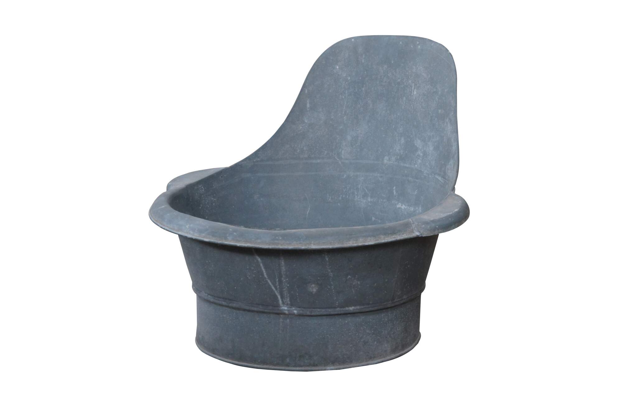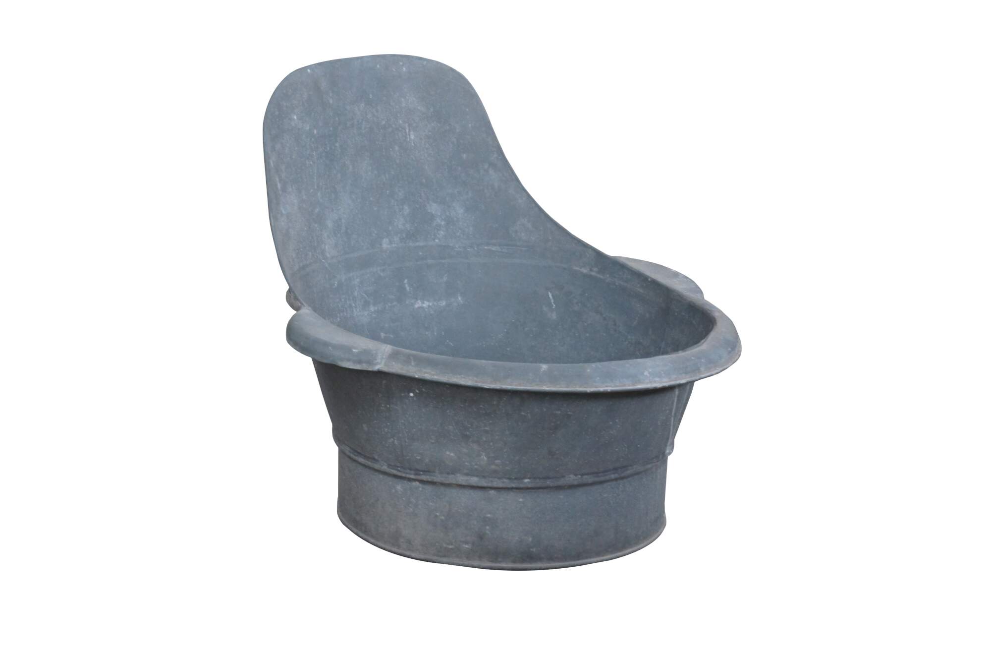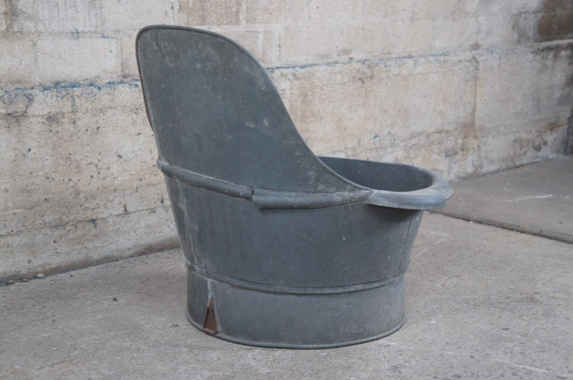 Primitive antique sit in bath or wash tub. Made of galvanized metal featuring back and arm rests