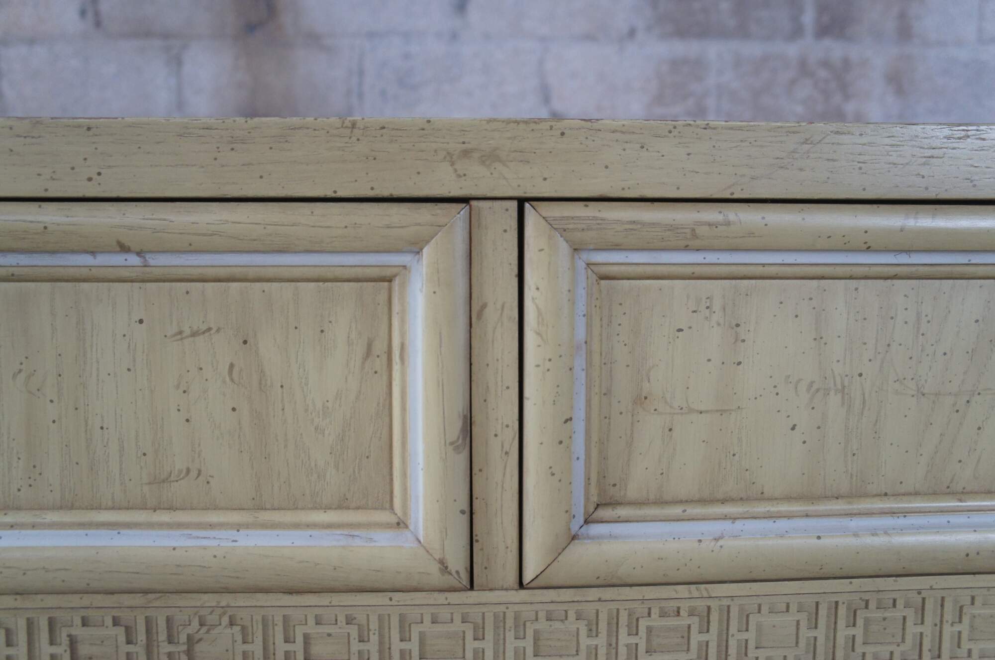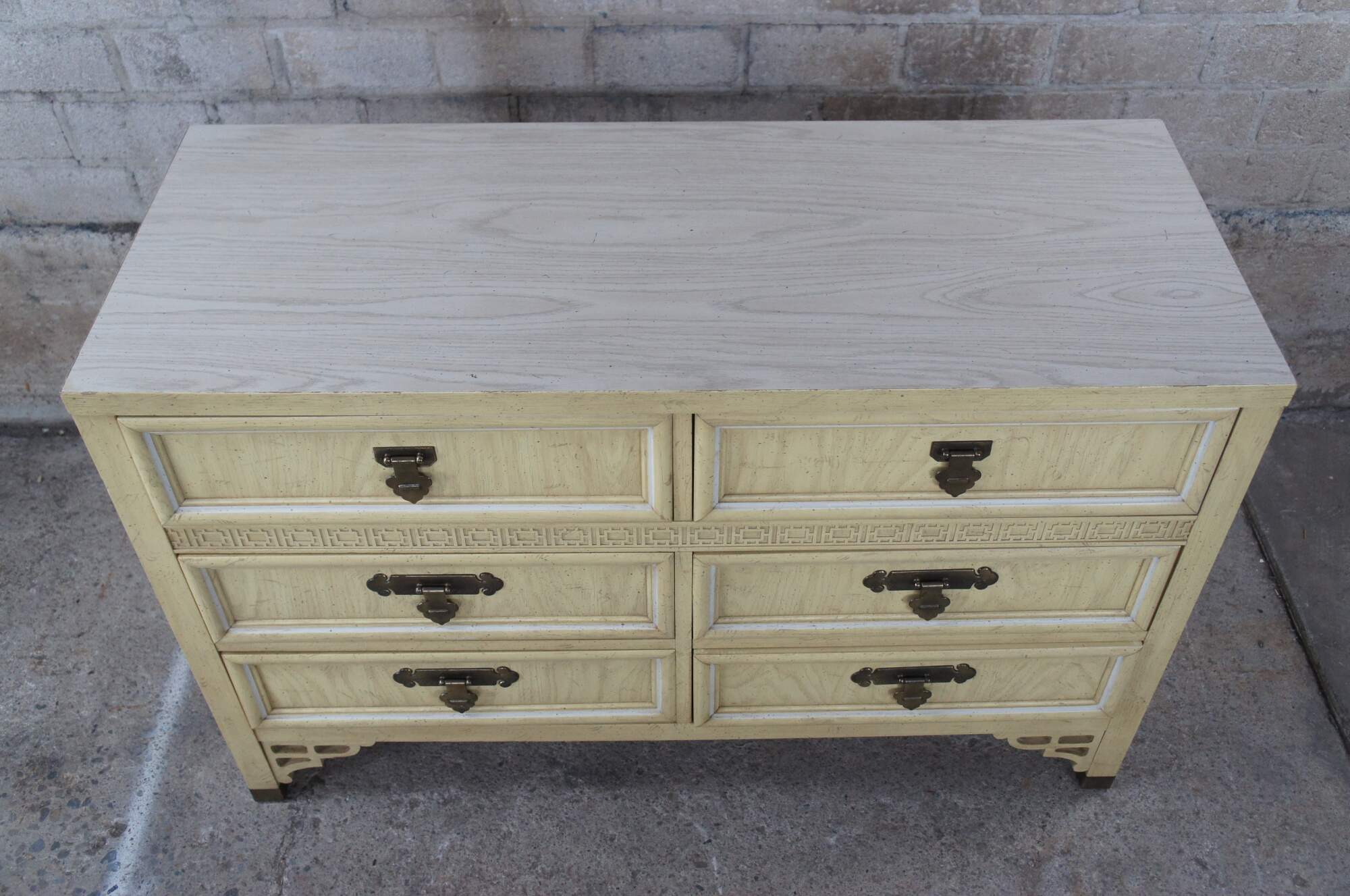 Mid 20th Century pickled oak Campaign chest of drawers by Dixie. Part of their Shangri La Chinoiserie collection. Features six dovetailed drawers, fretwork and brass hardware. Naturally distressed. Marked double dresser 322-506 along the back