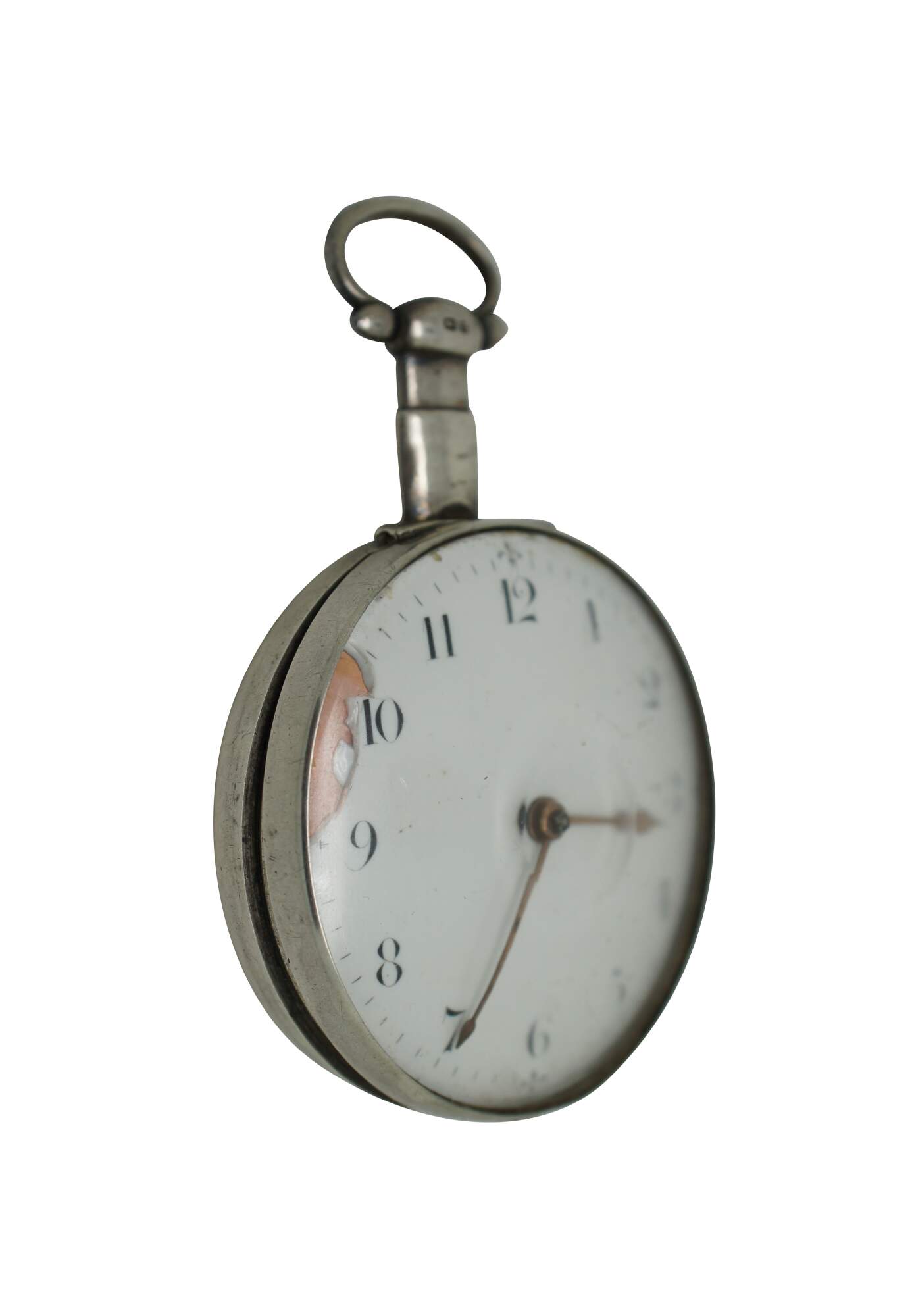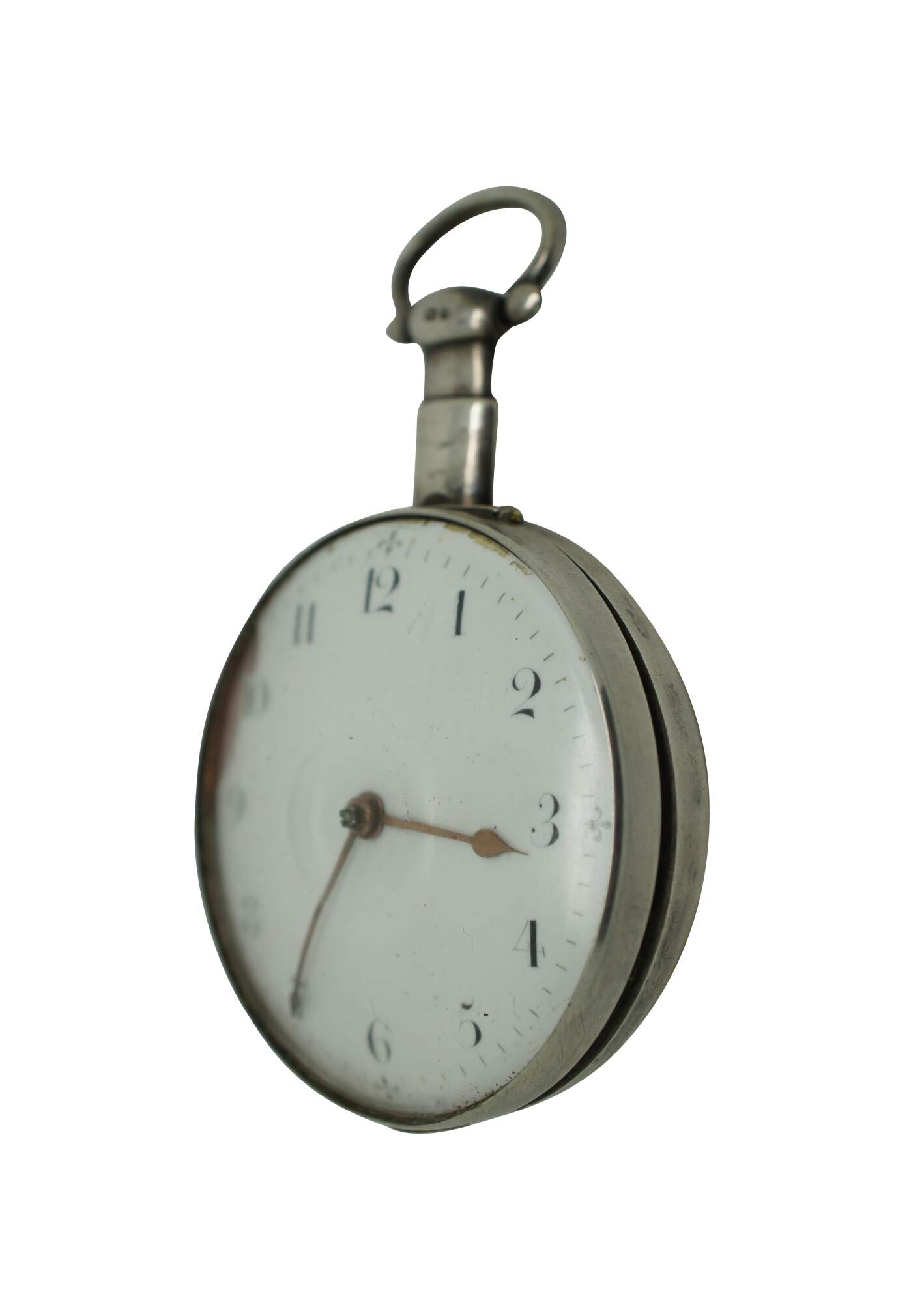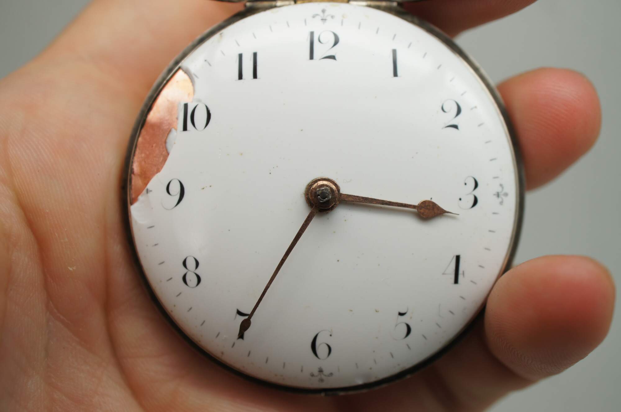 Antique early 19th century pocket watch. Sterling silver case with glass front. Swivel panel on reverse reveals key hole for winding. White porcelain face with copper hands, Arabic numeral and fleur de lis accents at the quarter hours. City mark and date letter indicate it was made in London, England, 1814.
