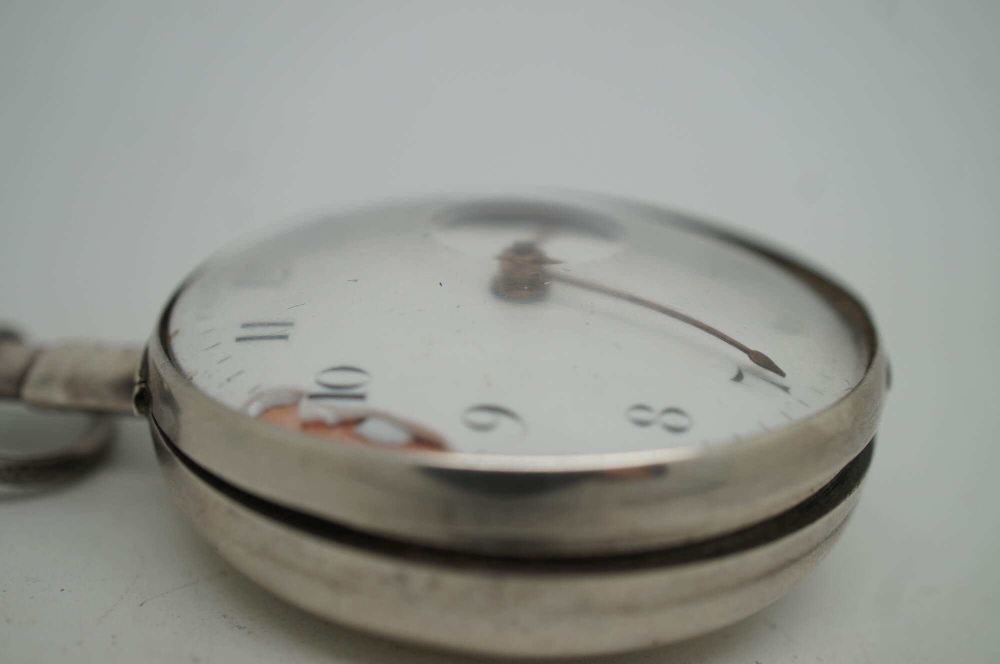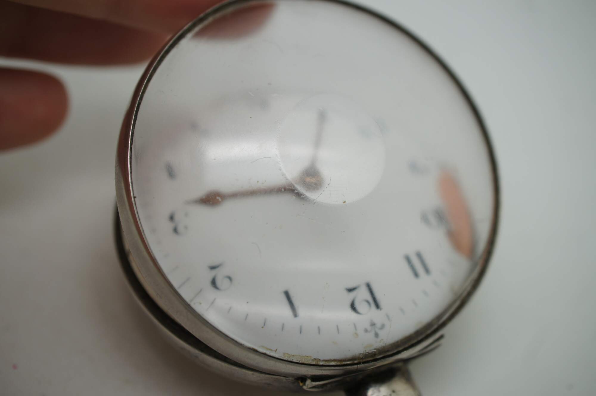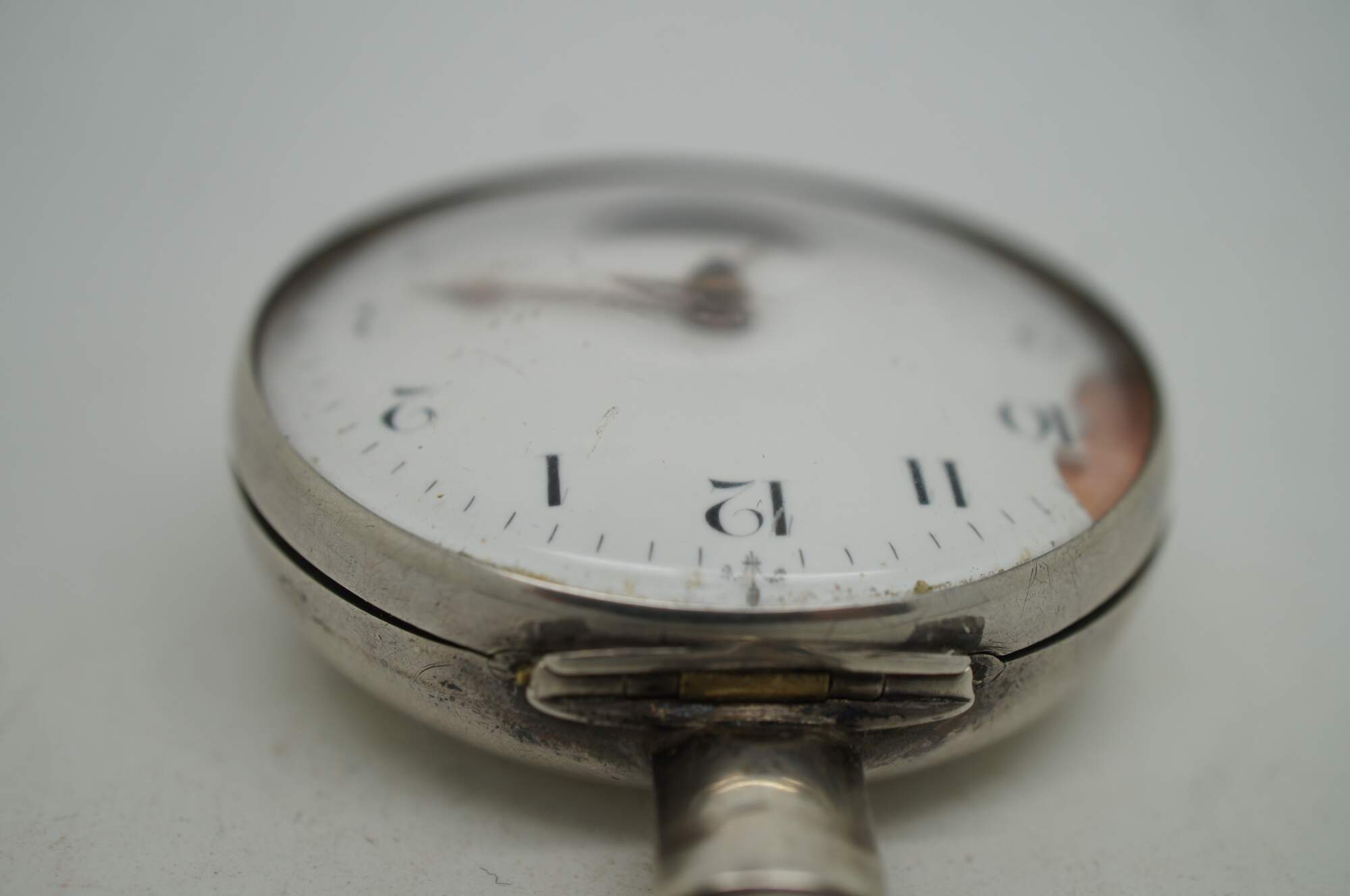 Antique early 19th century pocket watch. Sterling silver case with glass front. Swivel panel on reverse reveals key hole for winding. White porcelain face with copper hands, Arabic numeral and fleur de lis accents at the quarter hours. City mark and date letter indicate it was made in London, England, 1814.