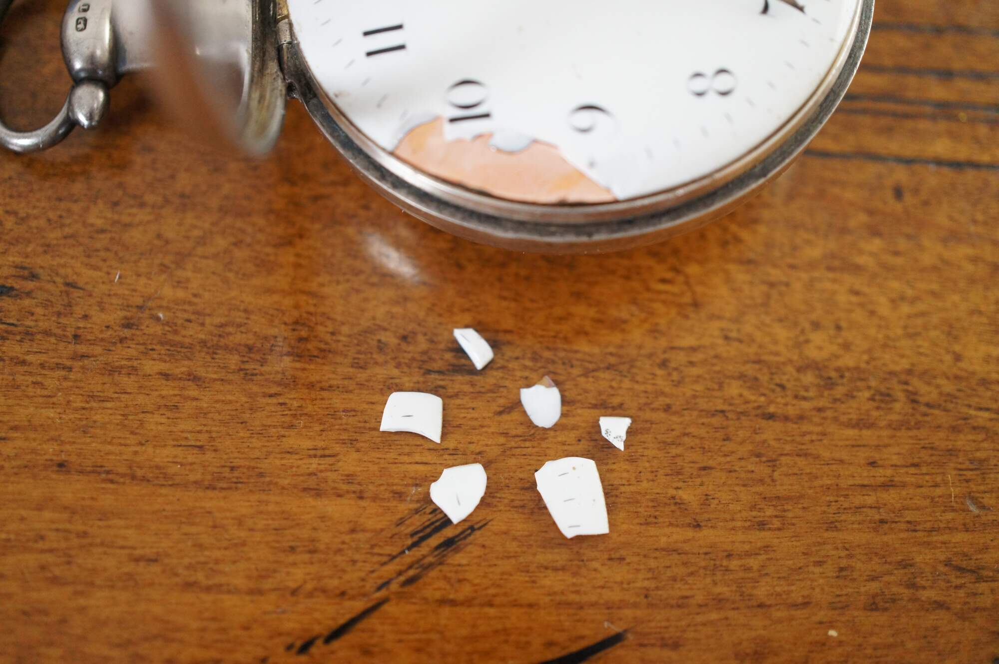 Good Overall – No key; Light tarnish/wear to case; broken/chipped section on face; front glass needs to be popped back in frame