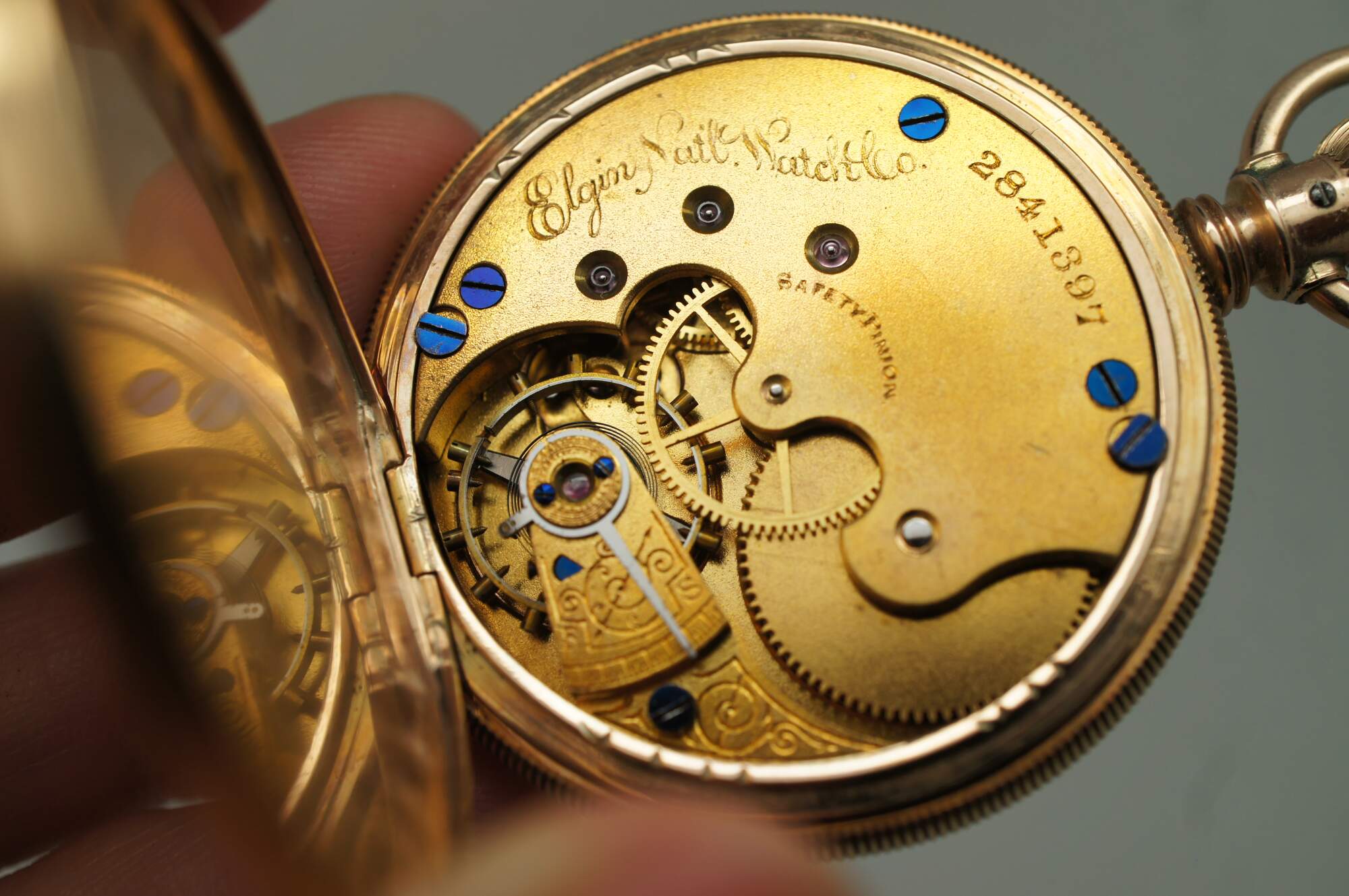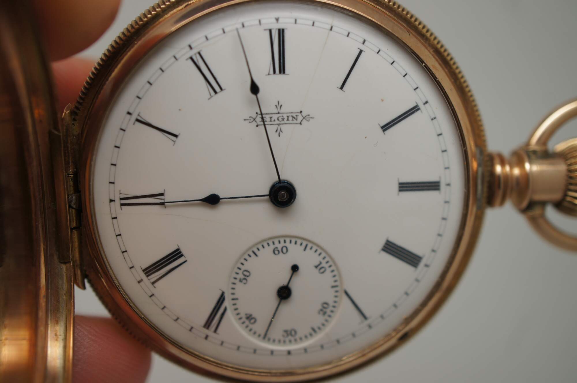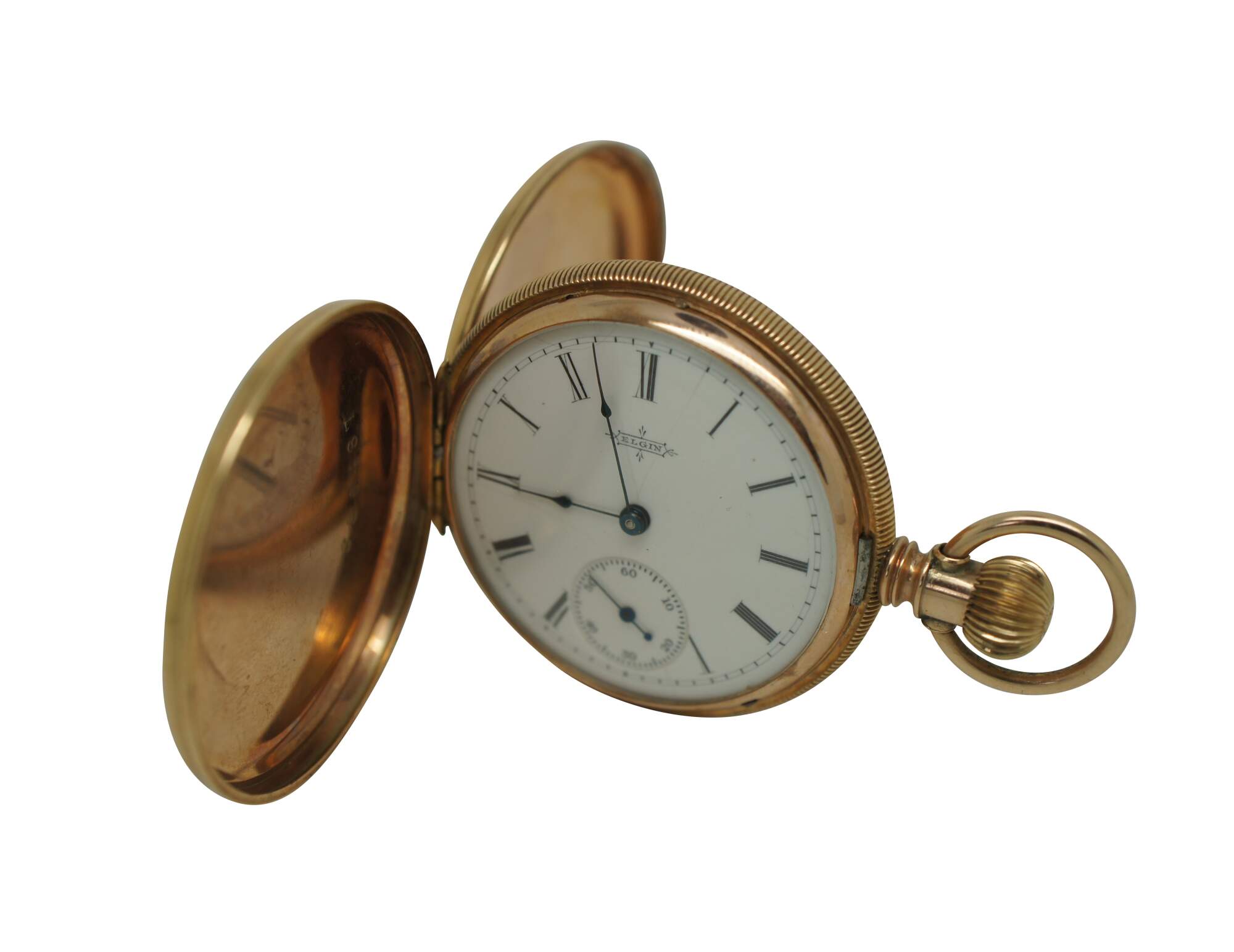Antique late 1880’s hunt pocket watch by Elgin National Watch Company. White porcelain face with black Roman numerals; second counting sub-dial with Arabic numerals. Case etched with an art nouveau foliate motif around a pair of rabbits on one side and personalized with the name May on the other.