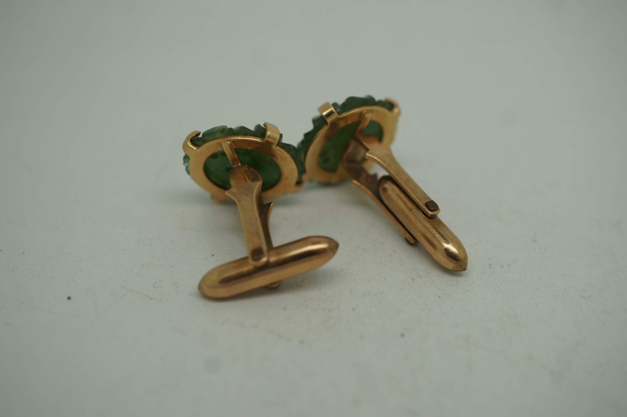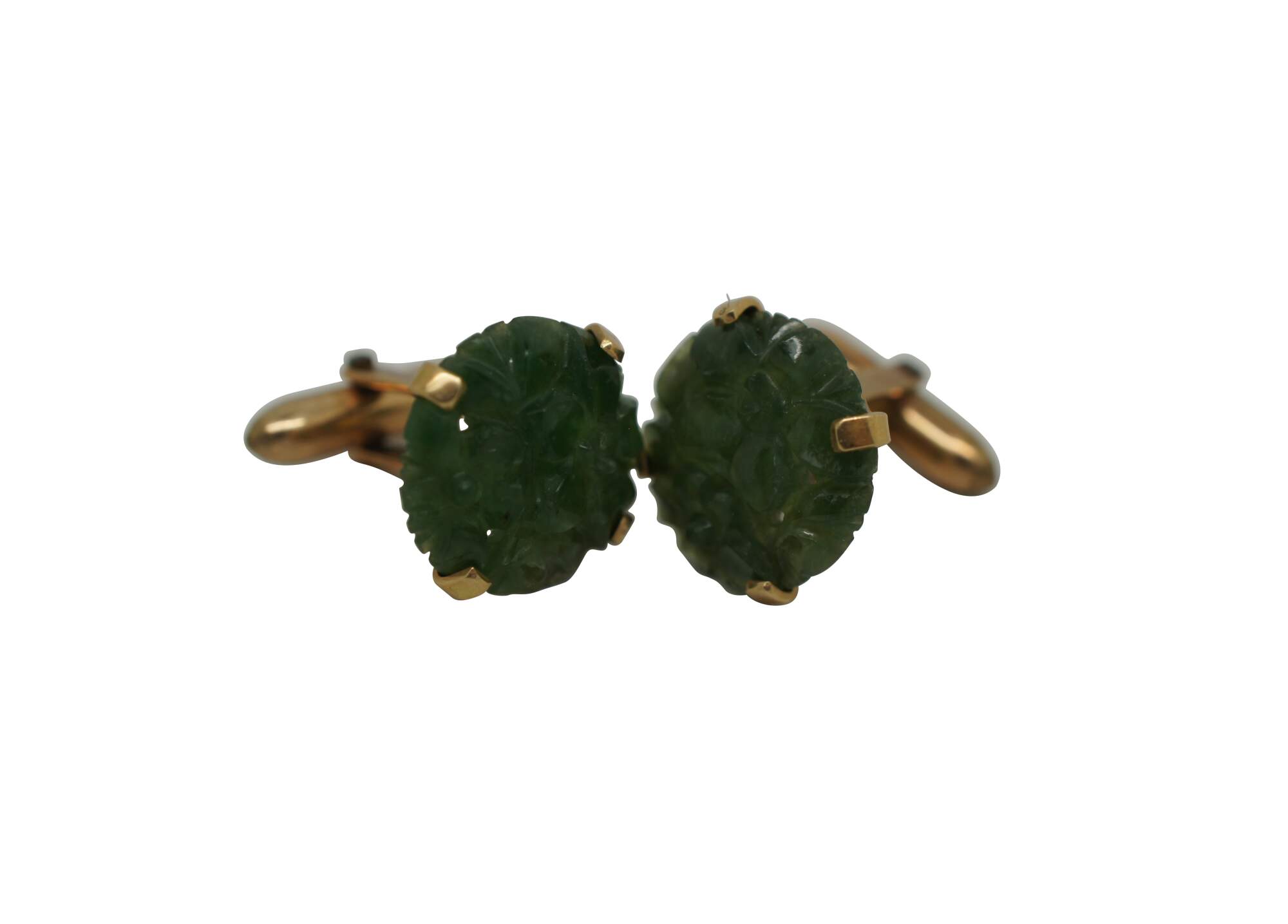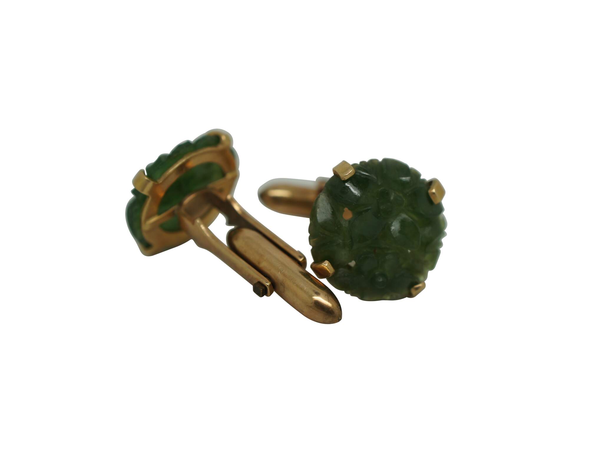 Vintage 10k yellow gold and carved jade flower cufflinks.