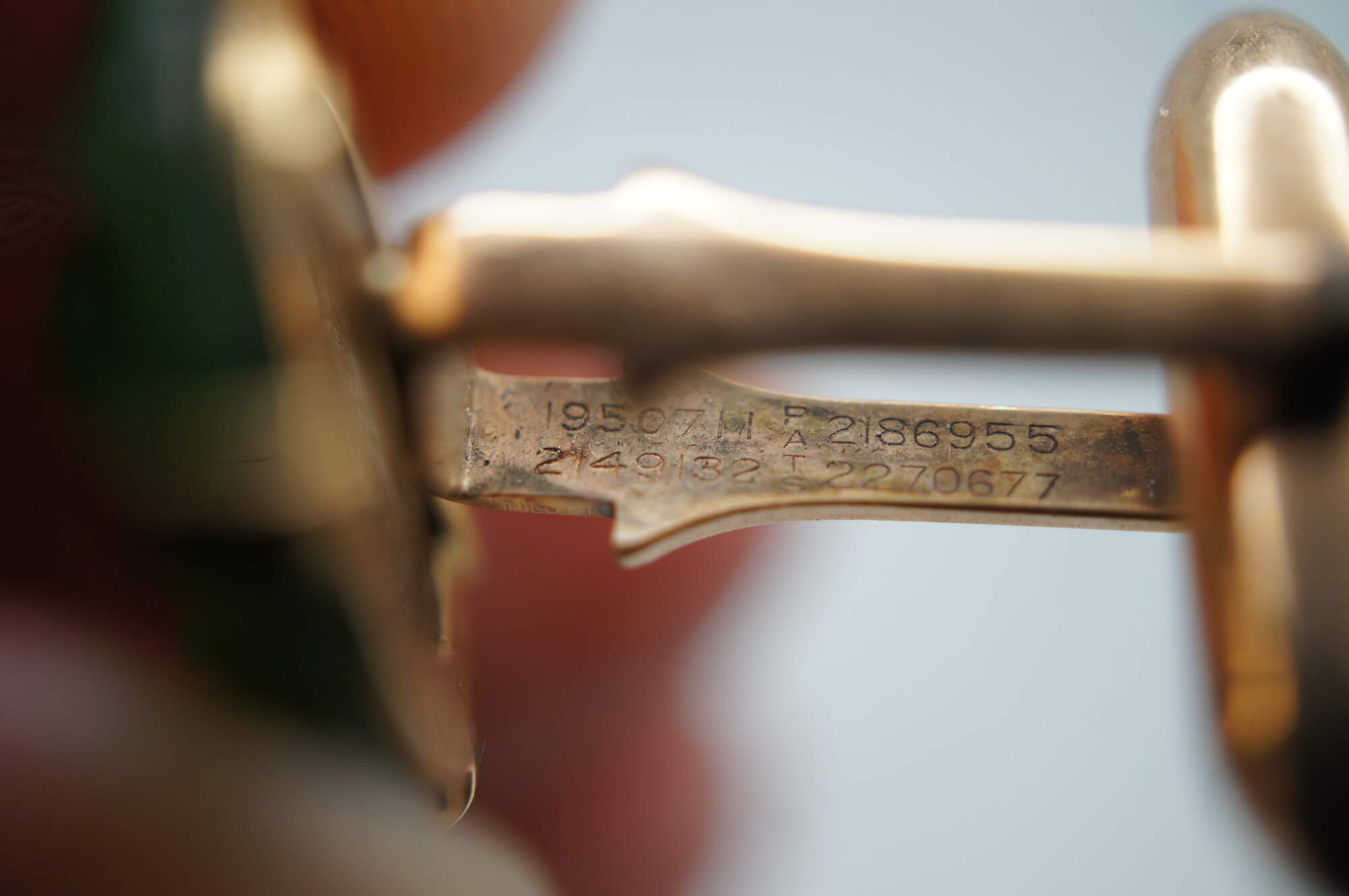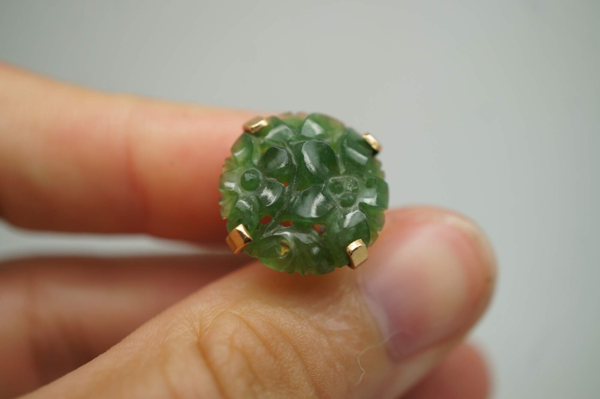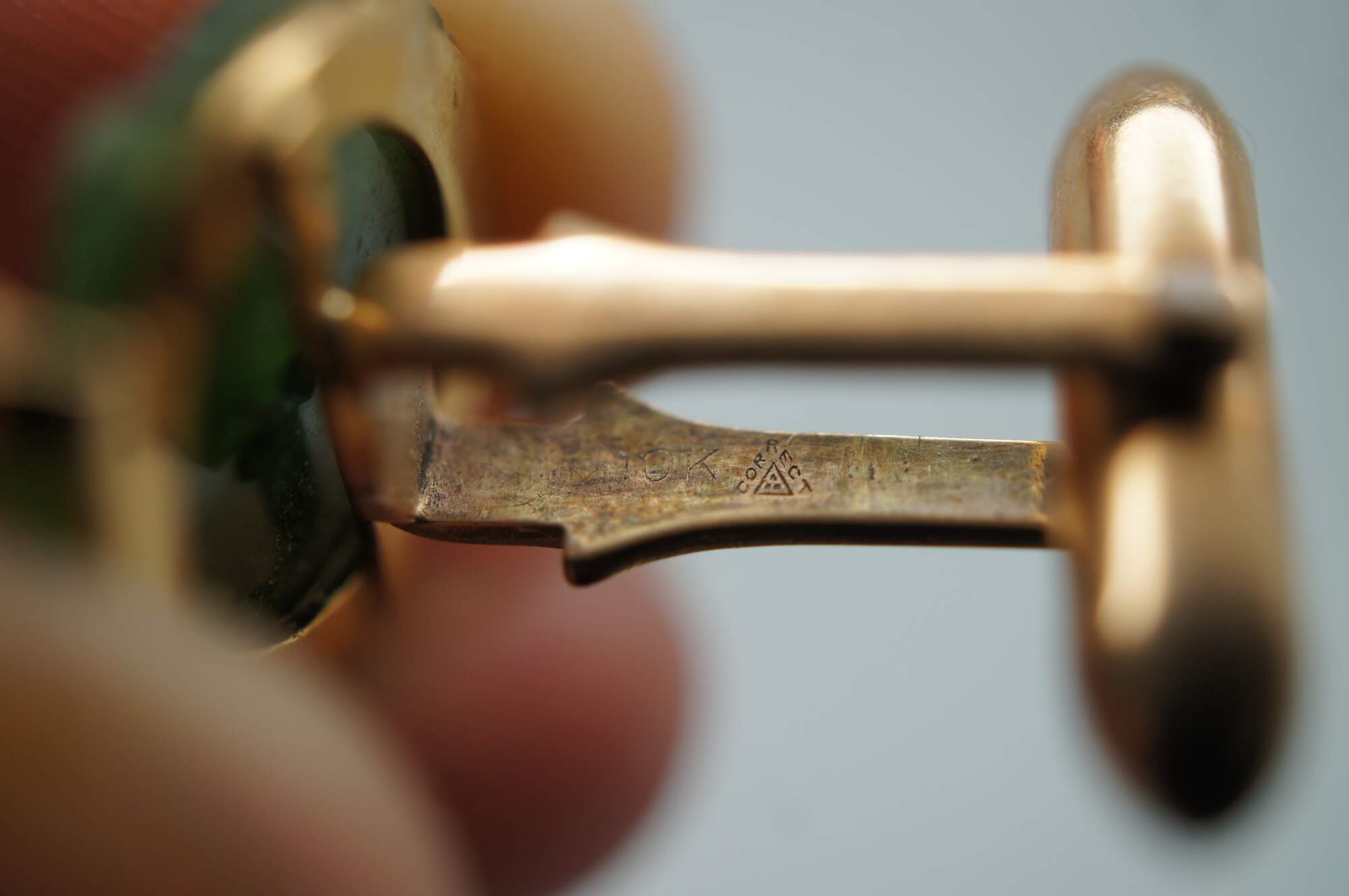Vintage 10k yellow gold and carved jade flower cufflinks.