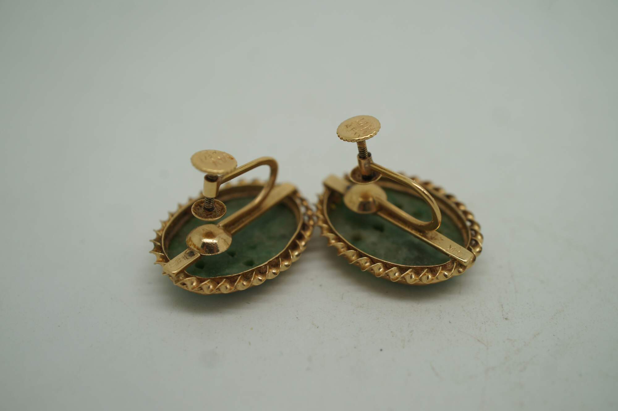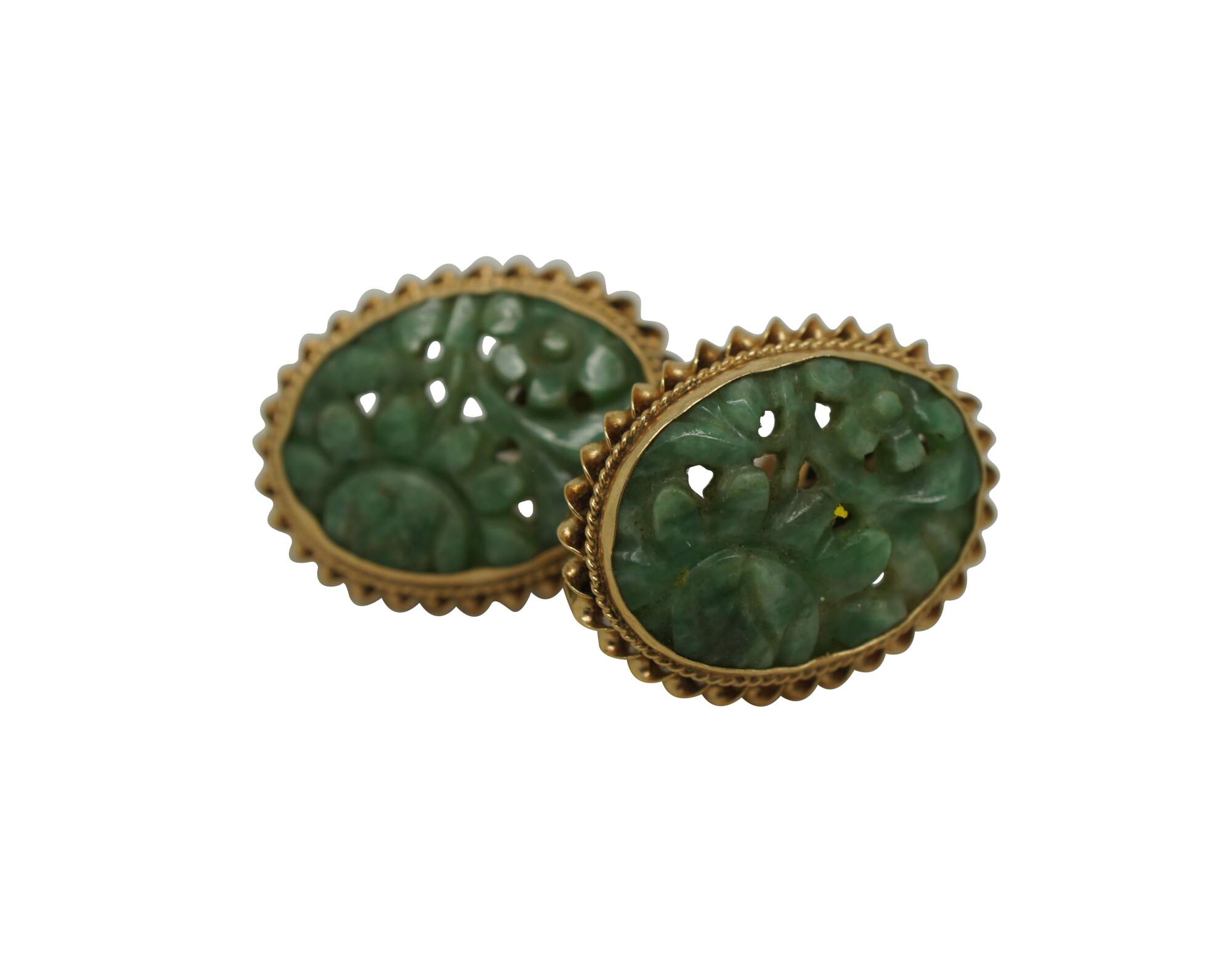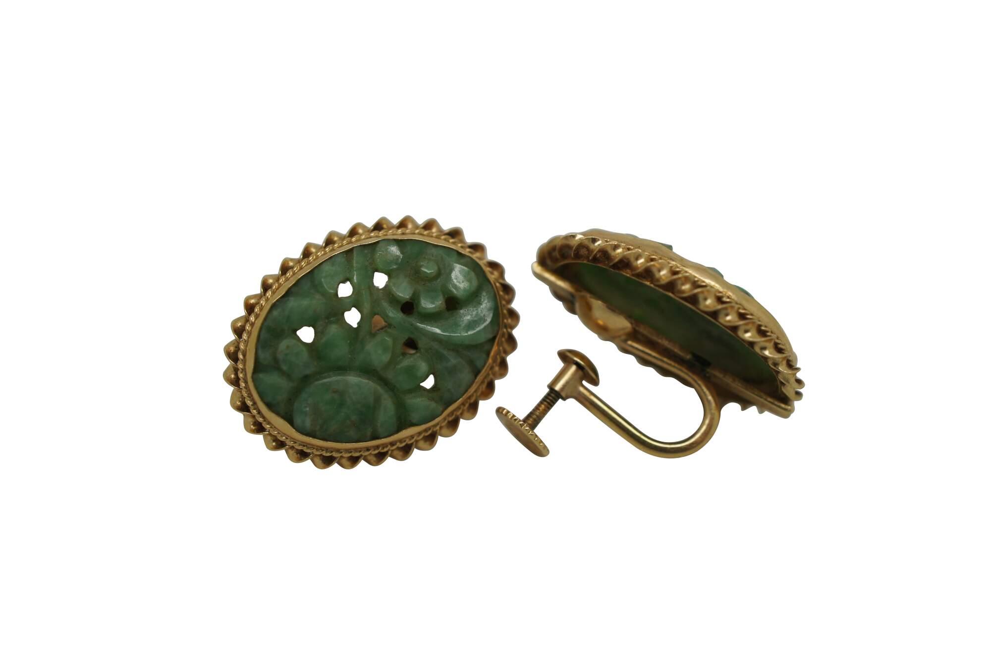 Vintage 14k yellow gold and jade flower earrings featuring a screw back with barley twisted oval form and carved reticulated flowers.