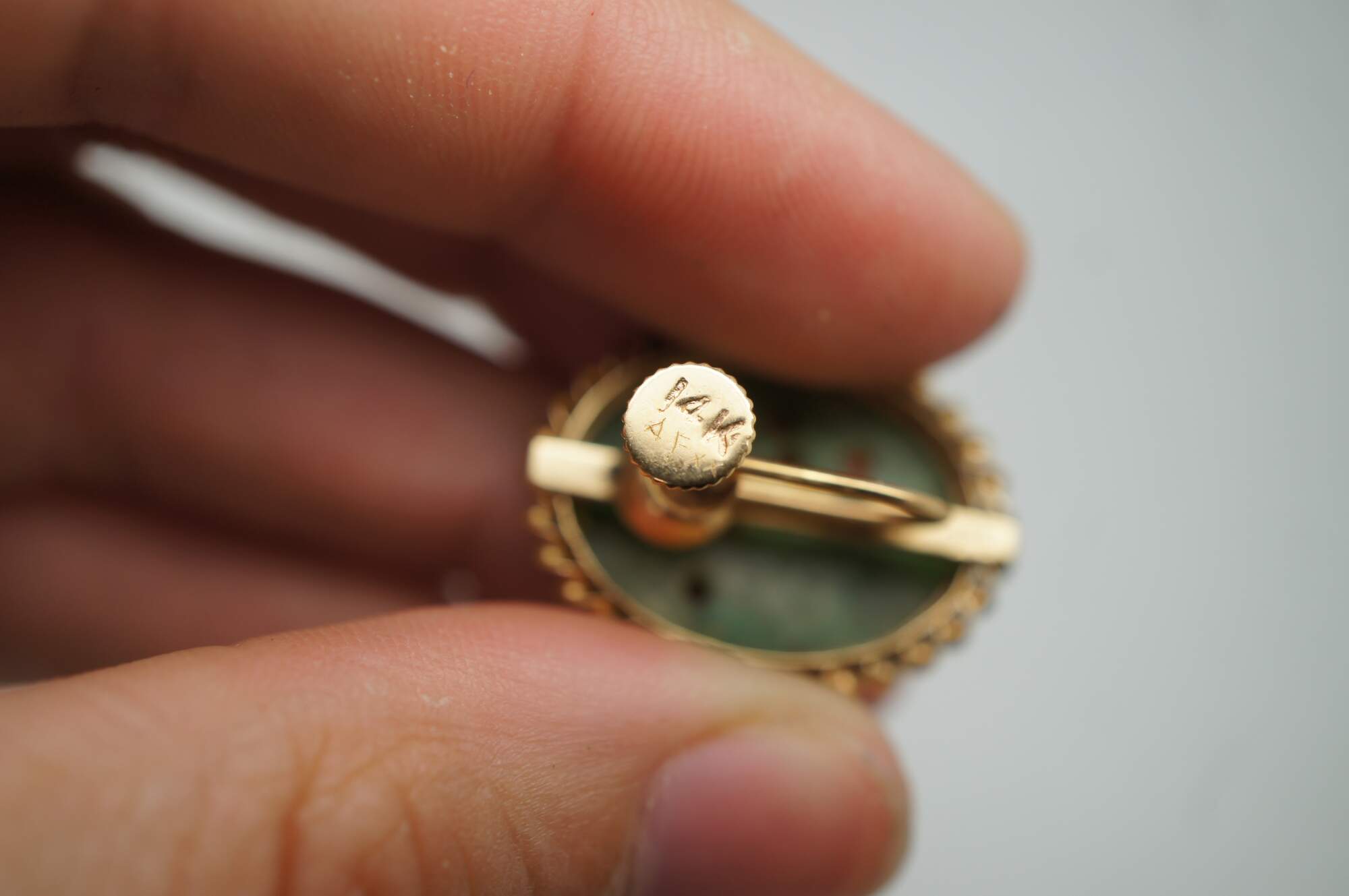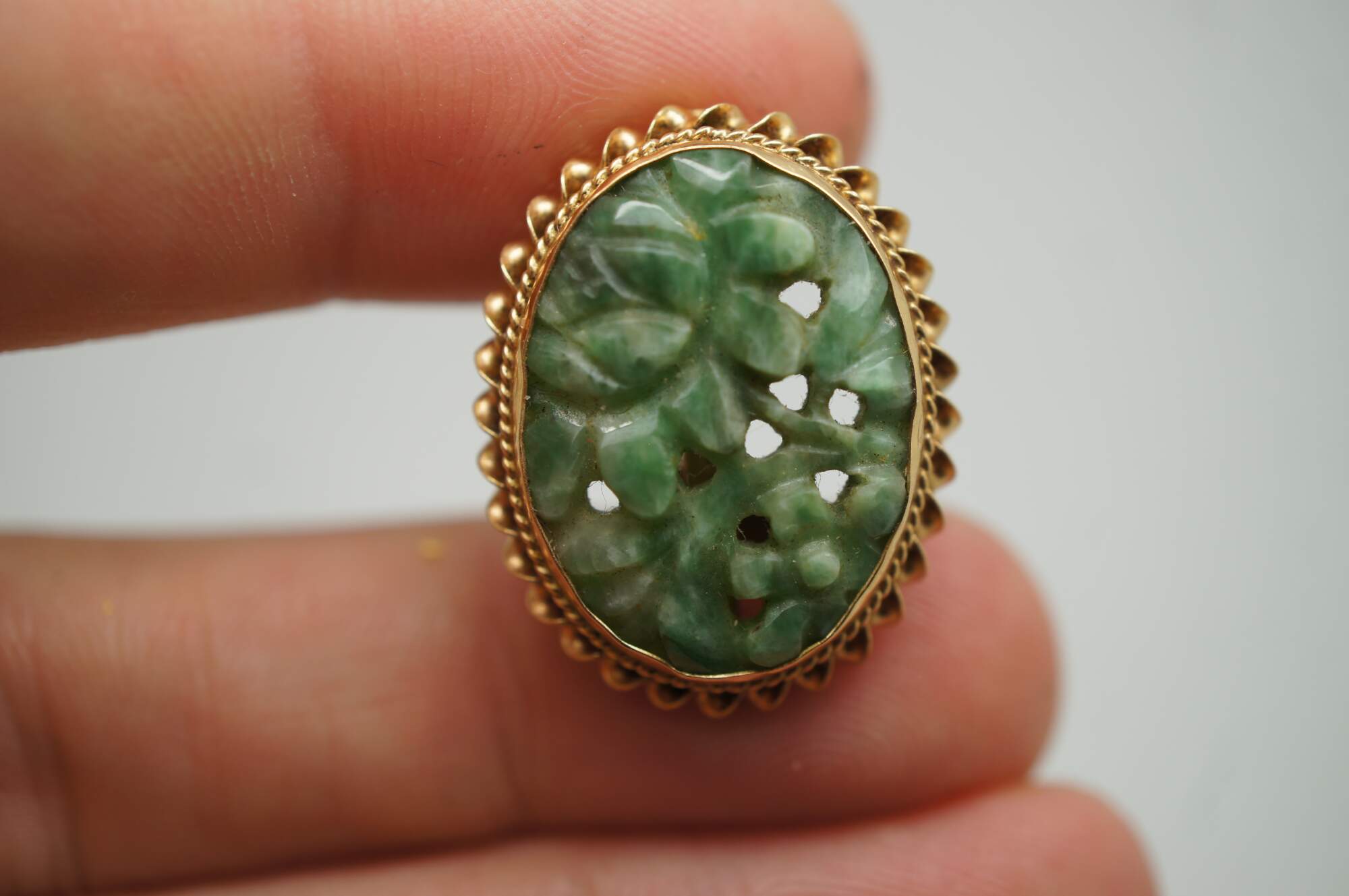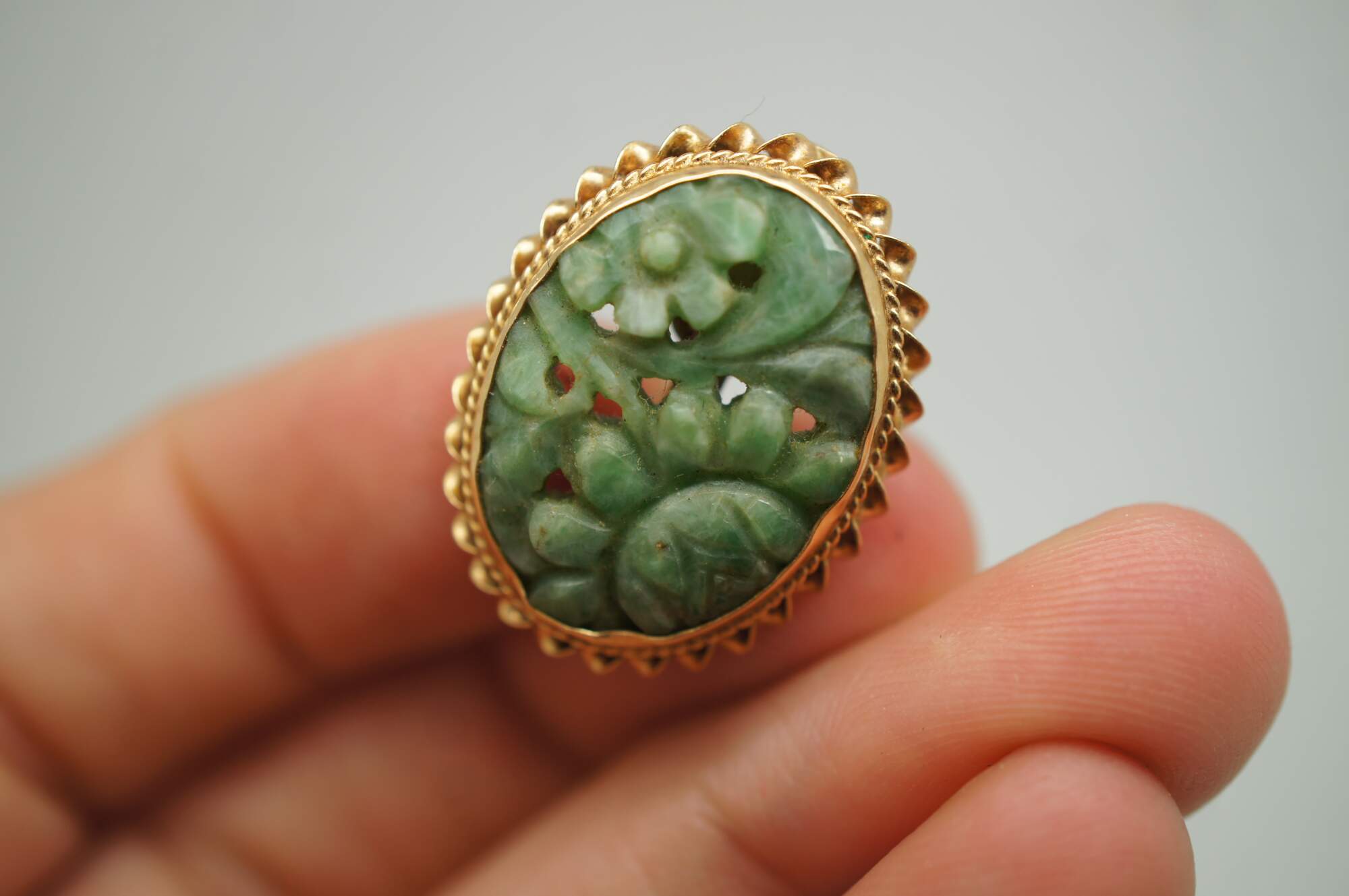 Vintage 14k yellow gold and jade flower earrings featuring a screw back with barley twisted oval form and carved reticulated flowers.