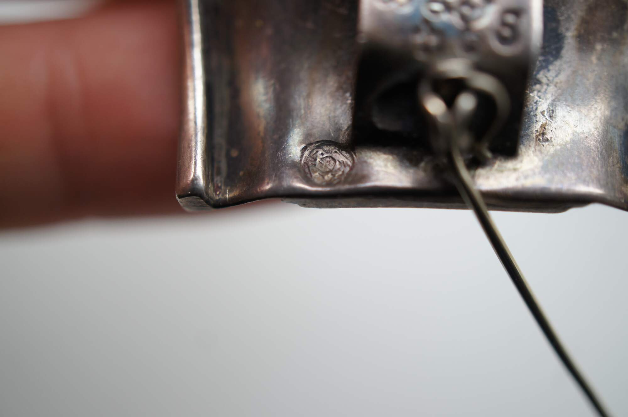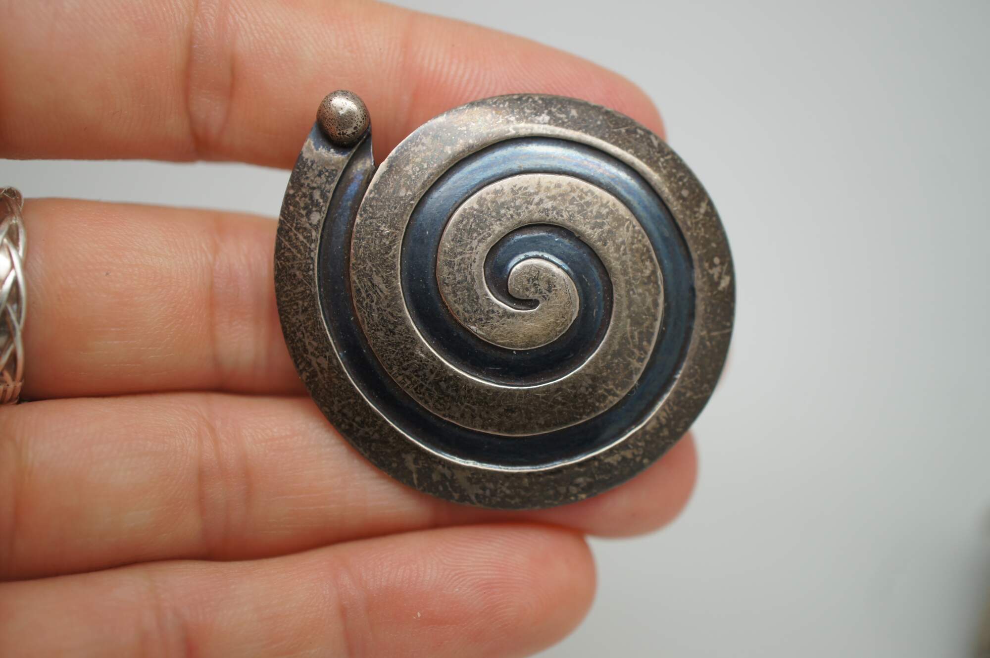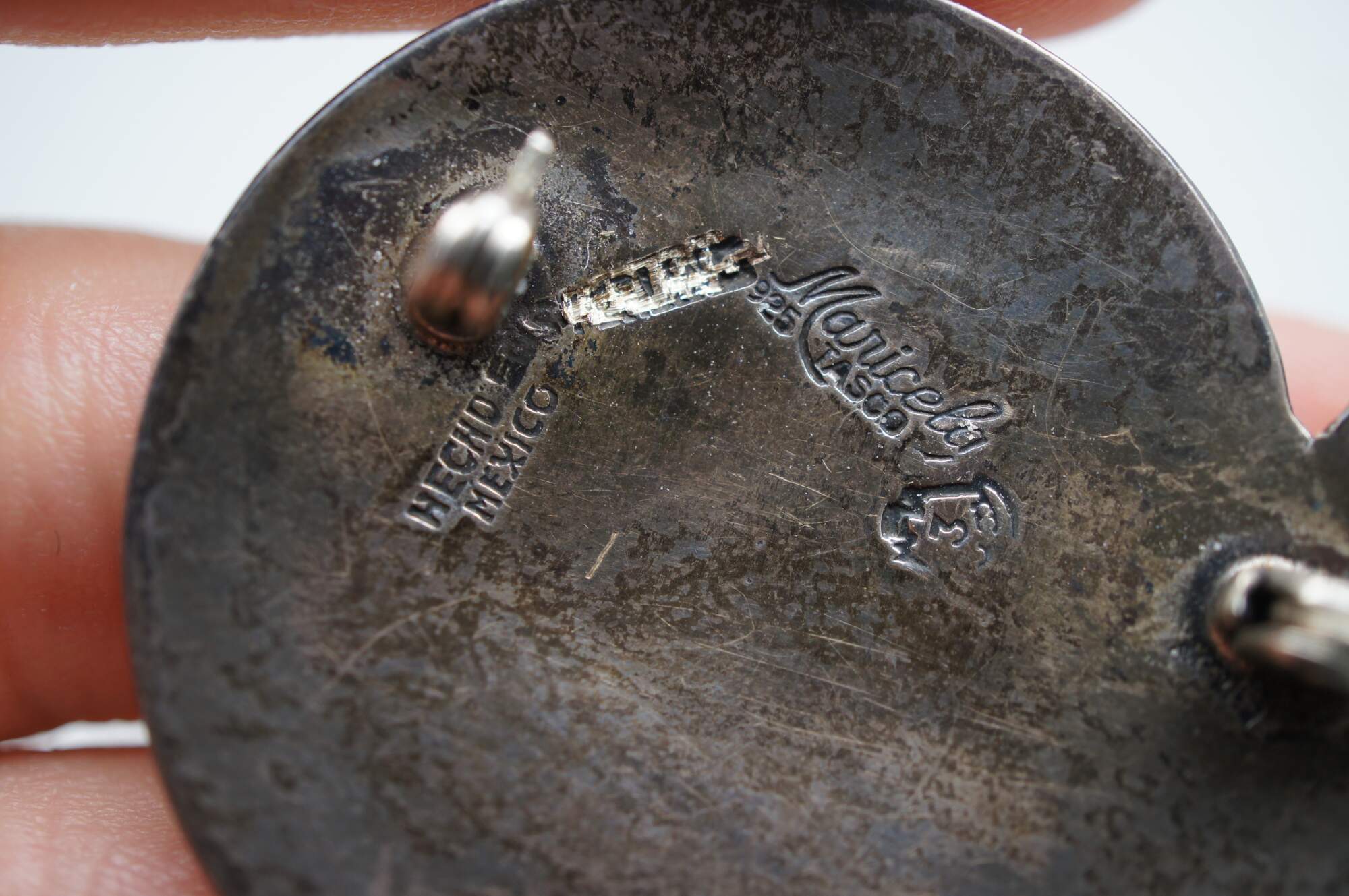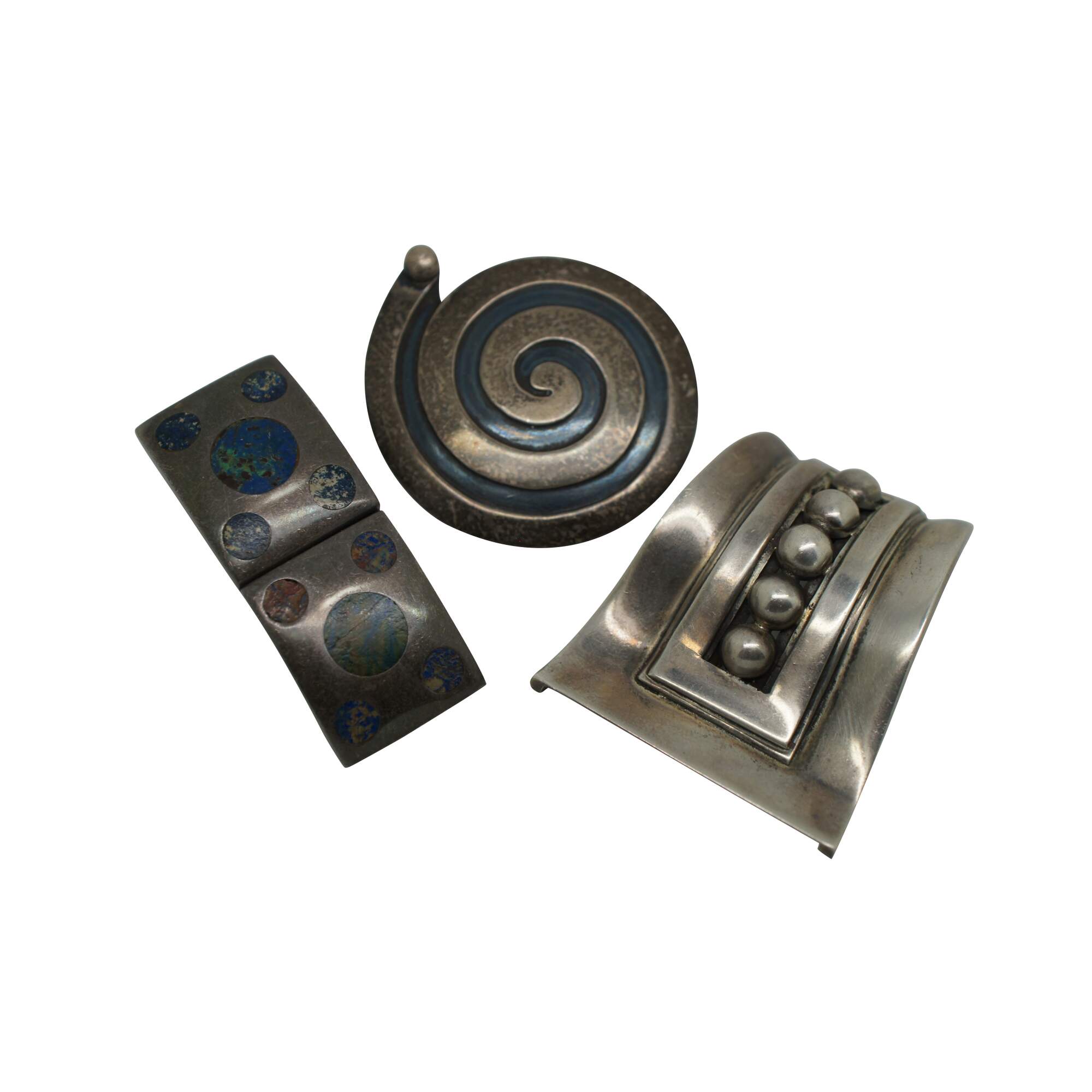 Lot of 5 vintage Mexican sterling silver pins / brooches. Lot includes: segmented rectangular with inlaid stone circles, marked Piedra Plata, Martinez, Sterling Taxco 276, Eagle with a 3; two tone spiral, marked Hecho en Mexico, Maricela 925 Tasco, eagle with a 3; swooping double rectangle with line of round beads along the center, marked 894 Taxco Hencho en Mexico, Sterling, eagle with a 1; and two bunches of grapes, marked Silver Mexico.