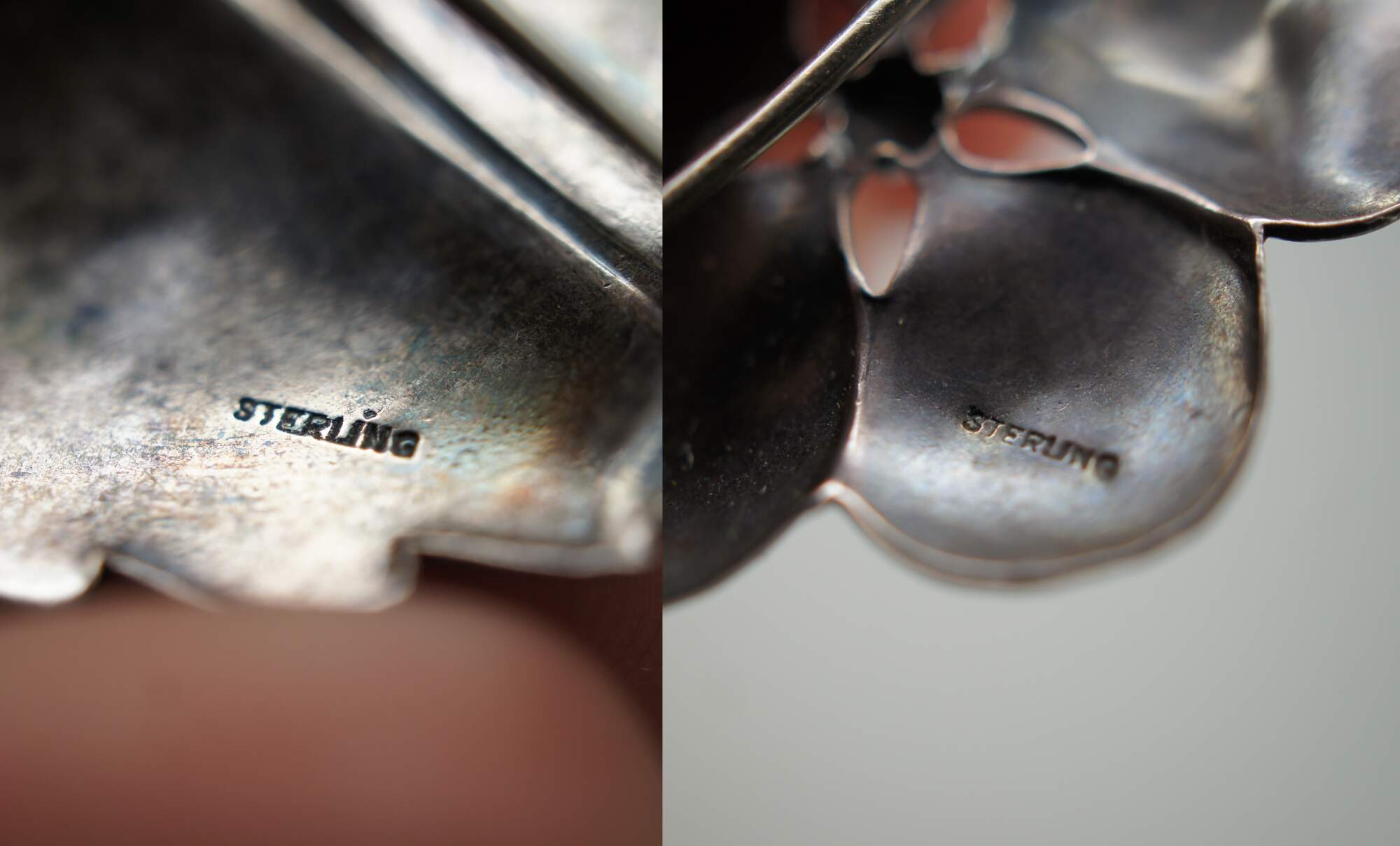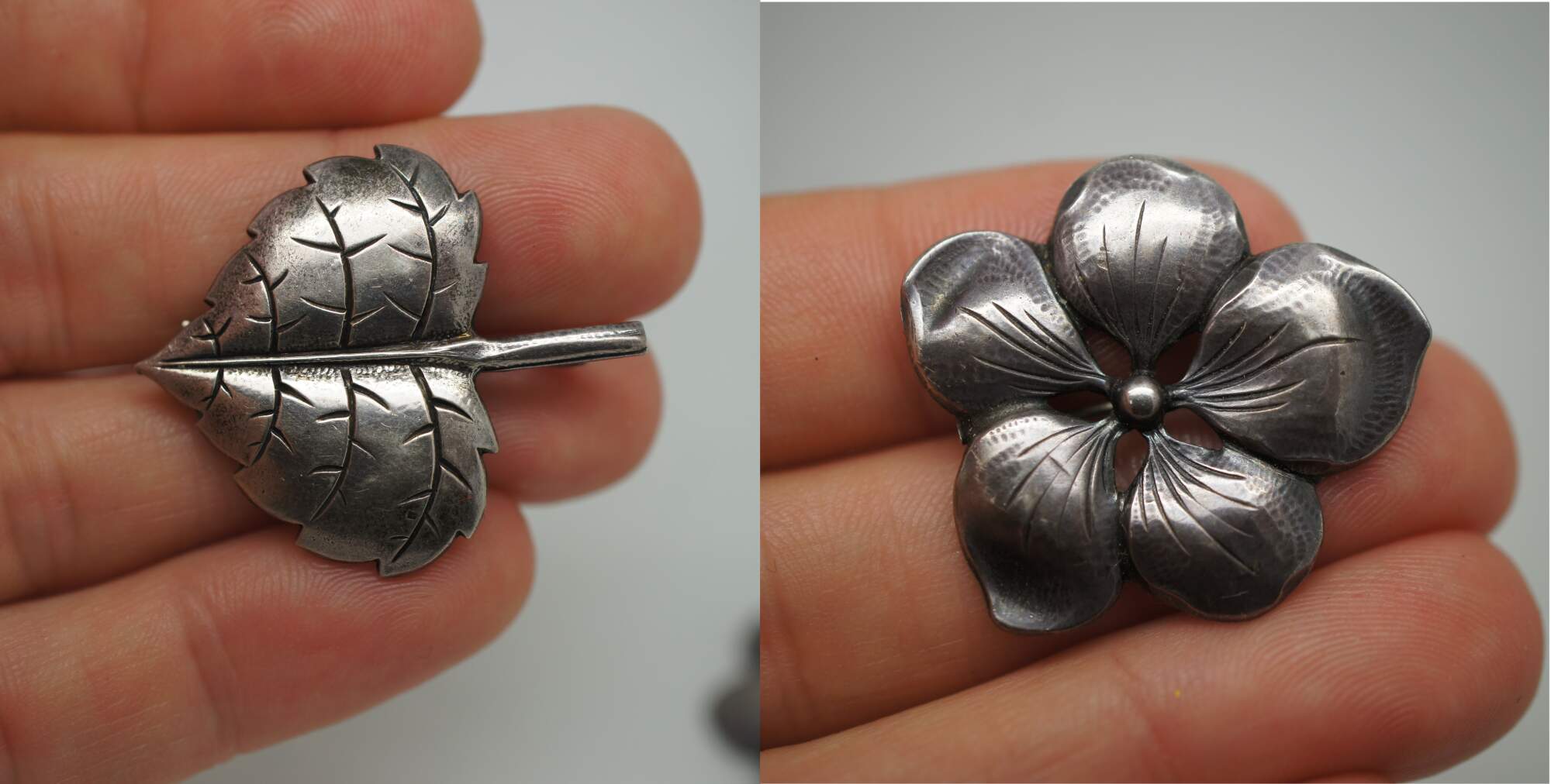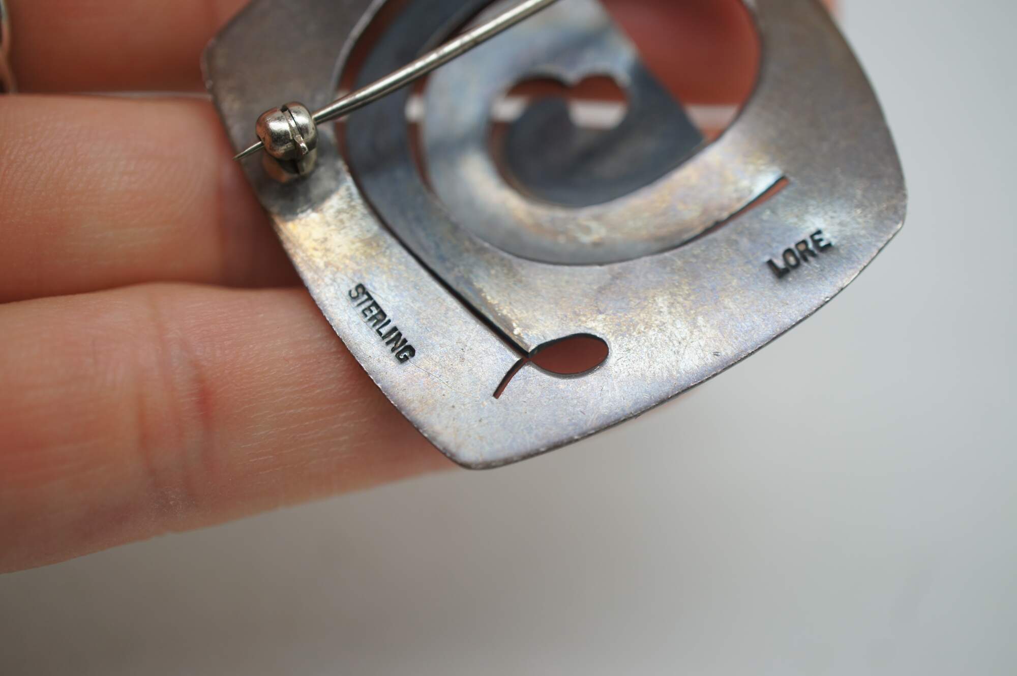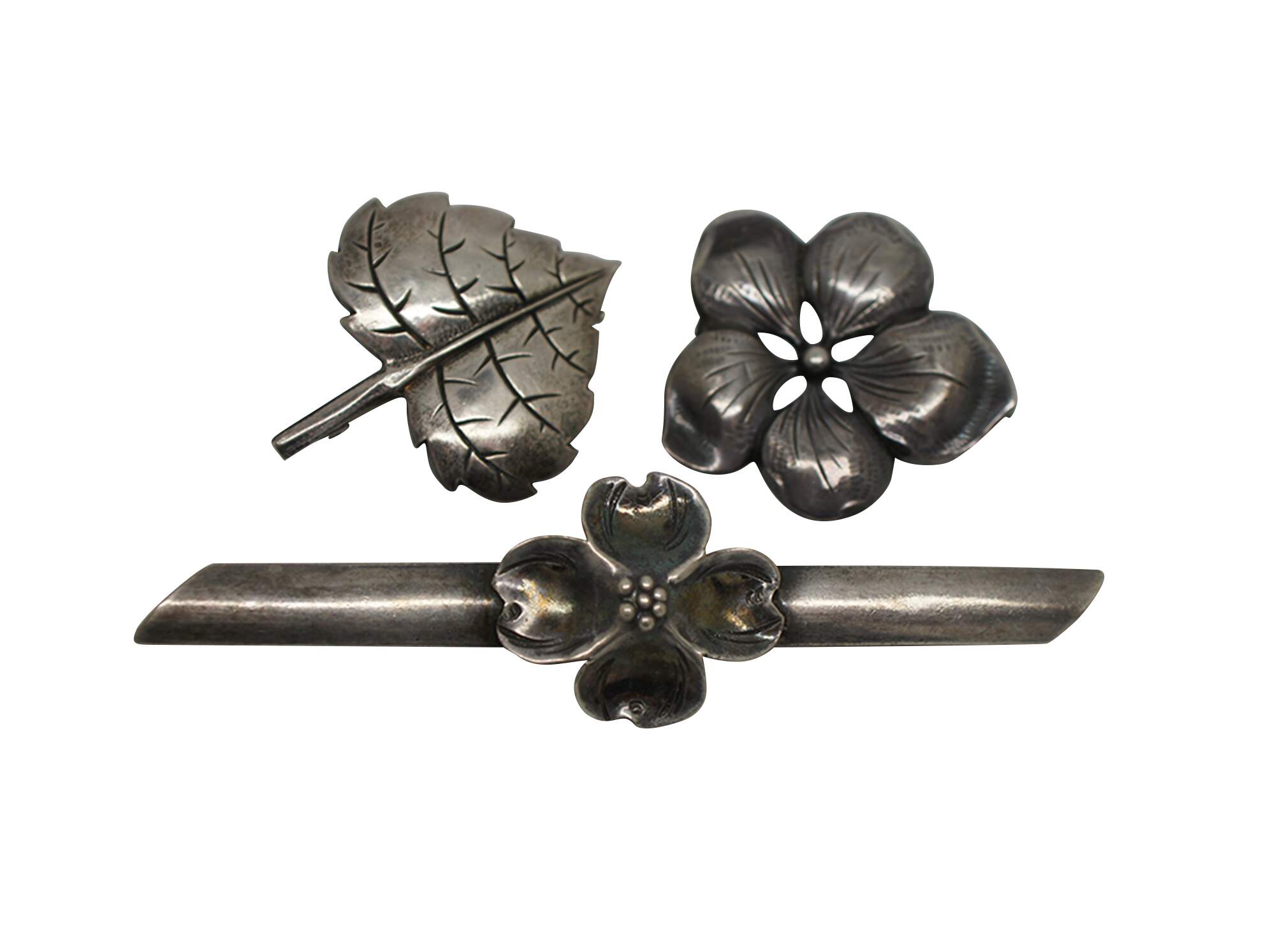 Lot of 5 vintage sterling silver pins / brooches. Lot includes: pear with leaves, abstract geometric cut out swirl on a square (by Lore); veined leaf; five petal Dogwood flower; and a bar pin with flower at the center (by NYE).