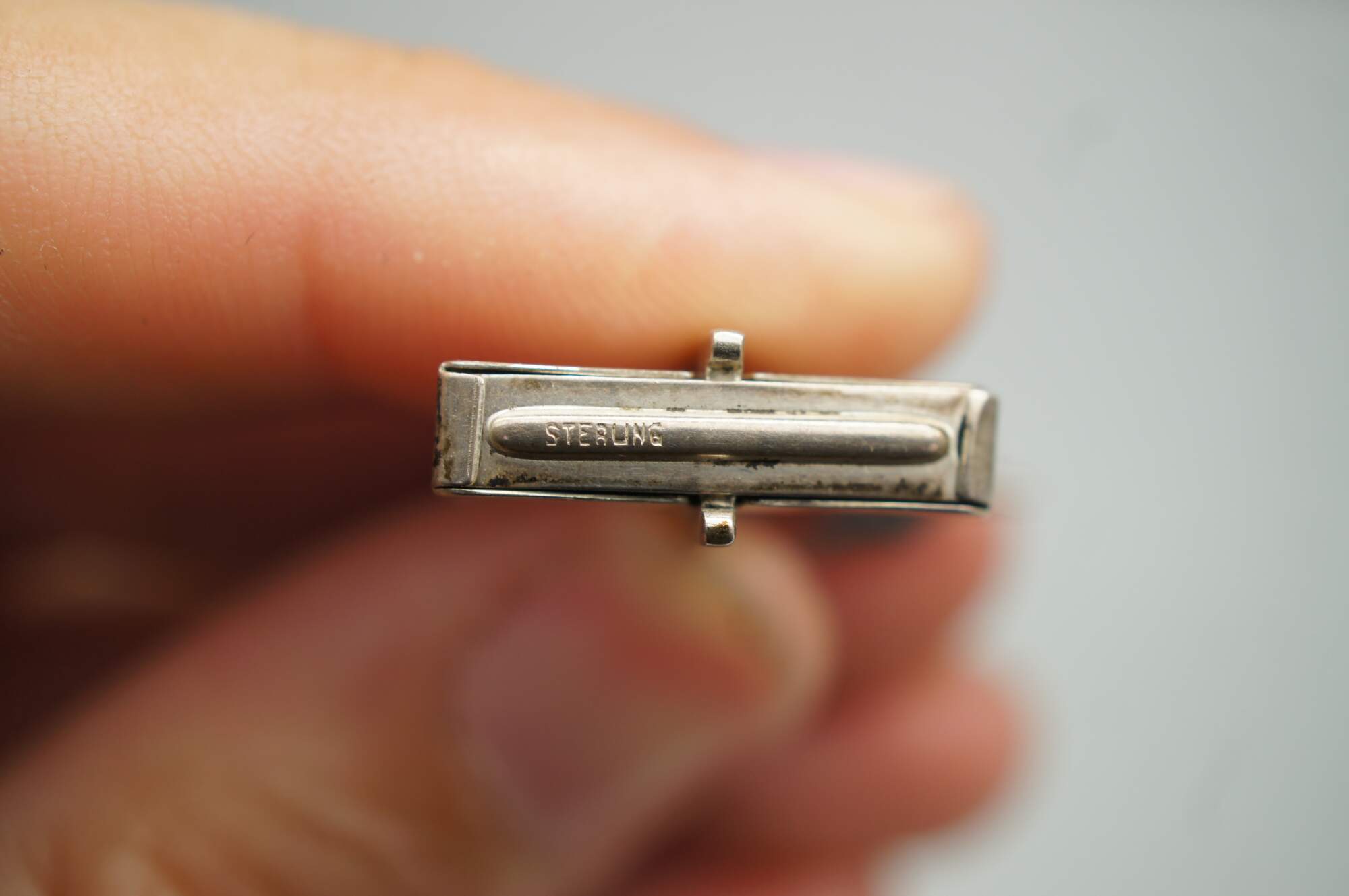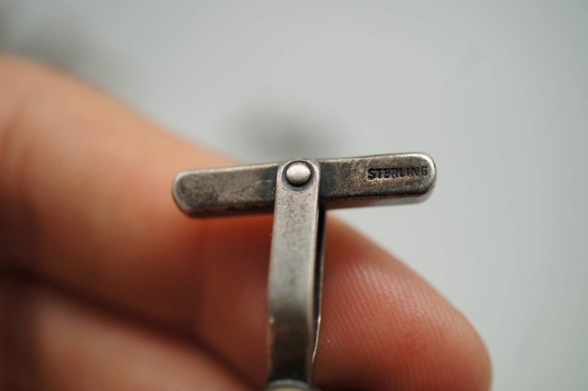 Lot of 5 pairs of vintage sterling silver cufflinks, primarily featuring Southwest or Mexican styling. Lot includes: smiling suns by Hogan Bolas; diamonds inlaid with turquoise / enamel; roadrunners with inlaid turquoise / enamel; cowboy / Stetson hats; and elves / sprites.