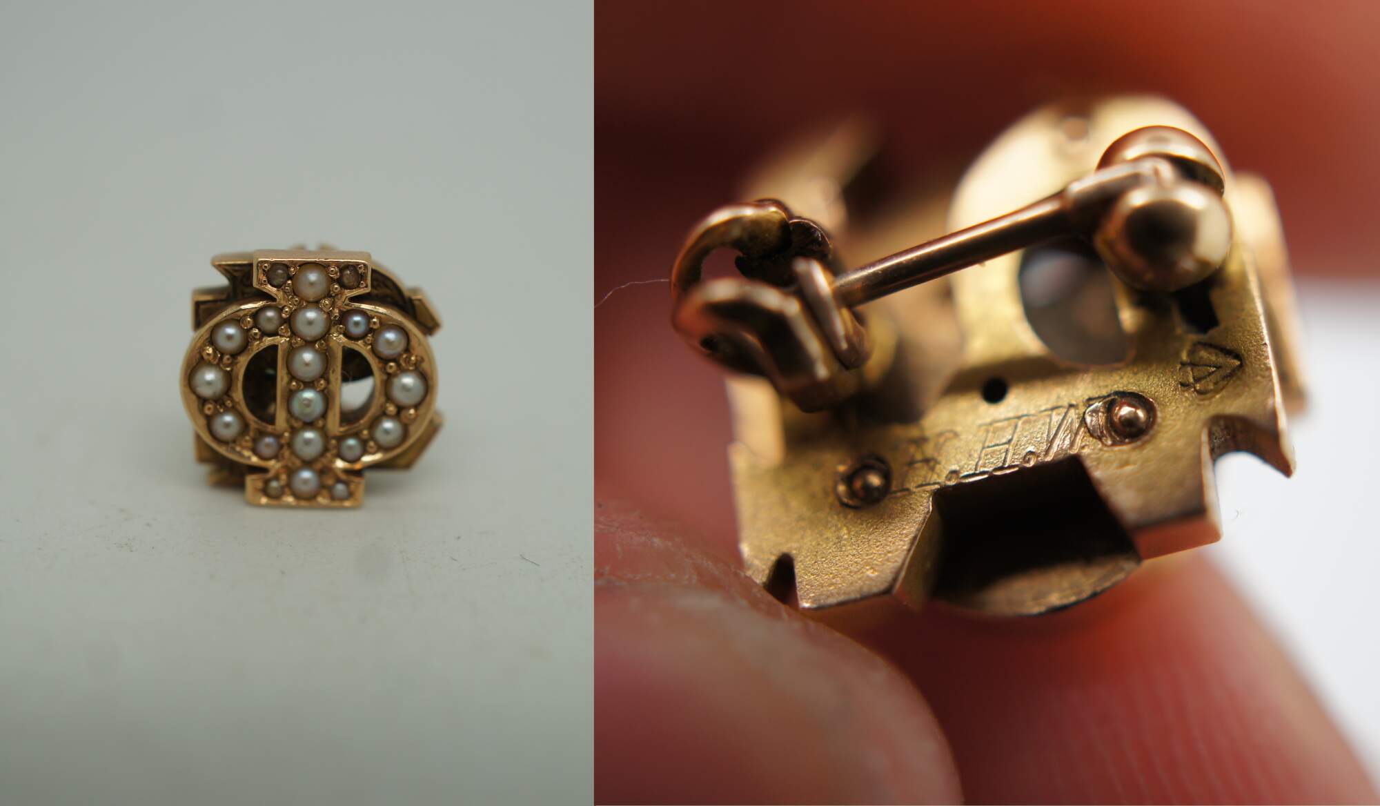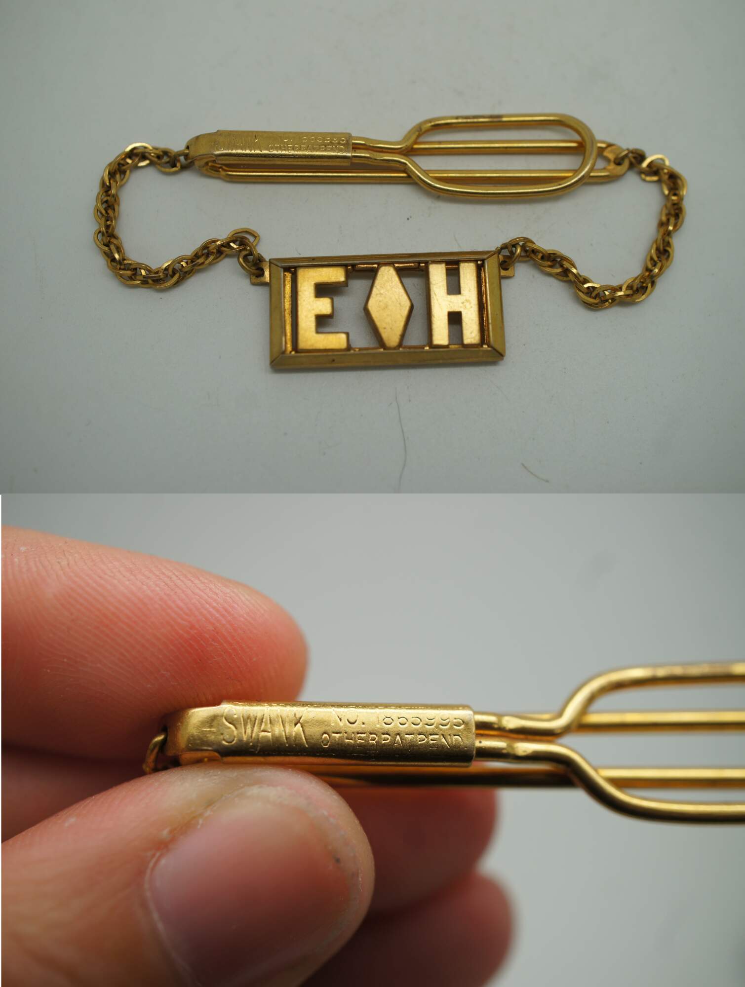 Lot of 11 vintage brooches, lapel pins and tie bar in a variety of styles. Lot includes: 2 gold tone bar pins with rectangular stone / agate; translucent yellow Bakelite/plastic pin carved with a leafy vine and black painted ends; swirling studded brass pin with two white rhinestones; Art Deco diamond shape pin with oxblood red carnelian glass; Swank gold tone tie bar with suspended initials EH; sterling silver miniature spoon pin topped with the head of Athena; carved tortoiseshell pattern plastic seahorse; cluster pin beaded with turquoise and pearl seed beads; sterling silver roadrunner with inlaid turquoise stone; and a gold tone Omega Iota lapel pin studded with seed pearls and initials NHW on back.