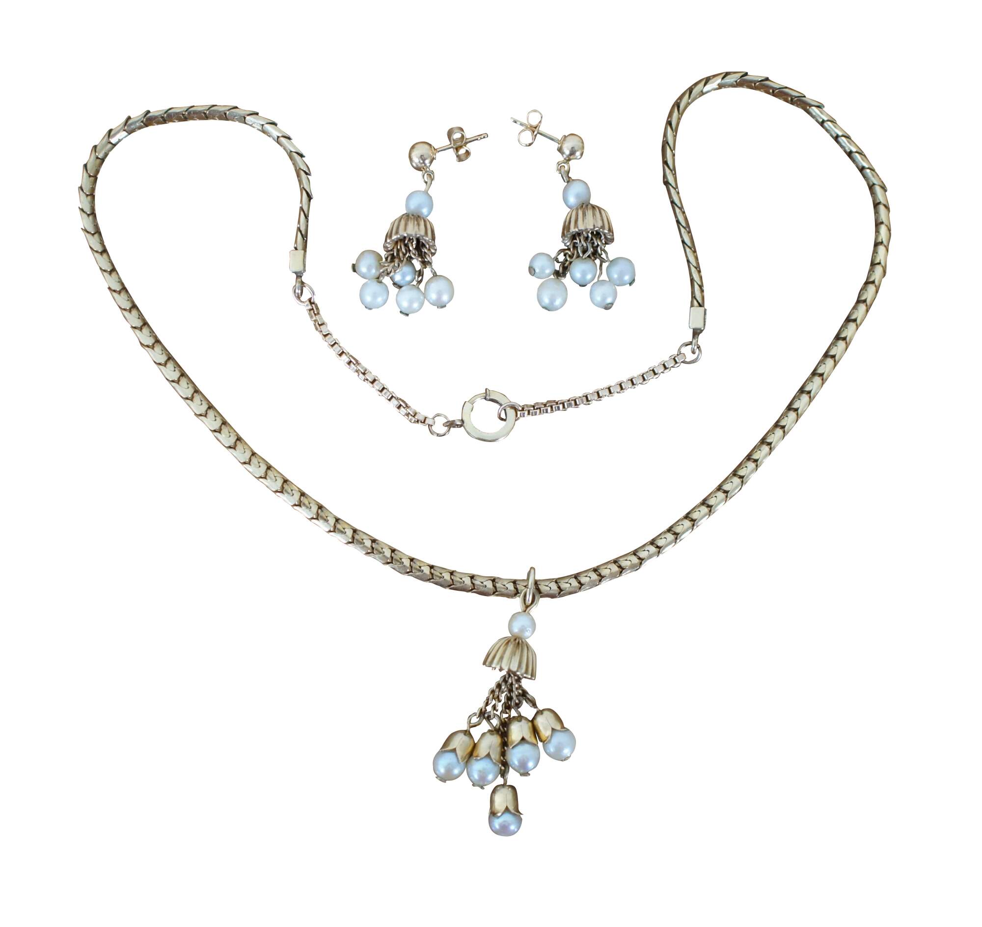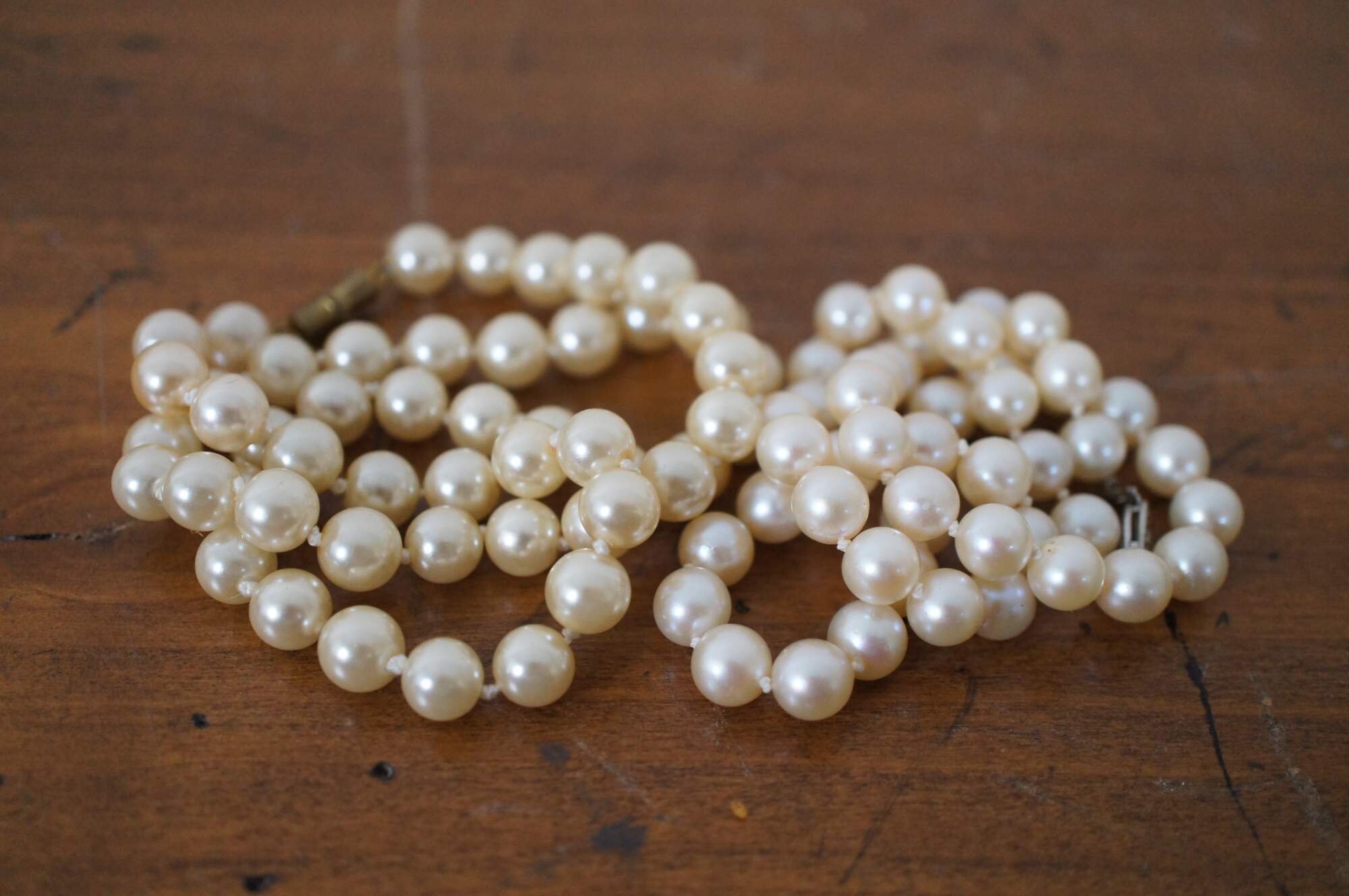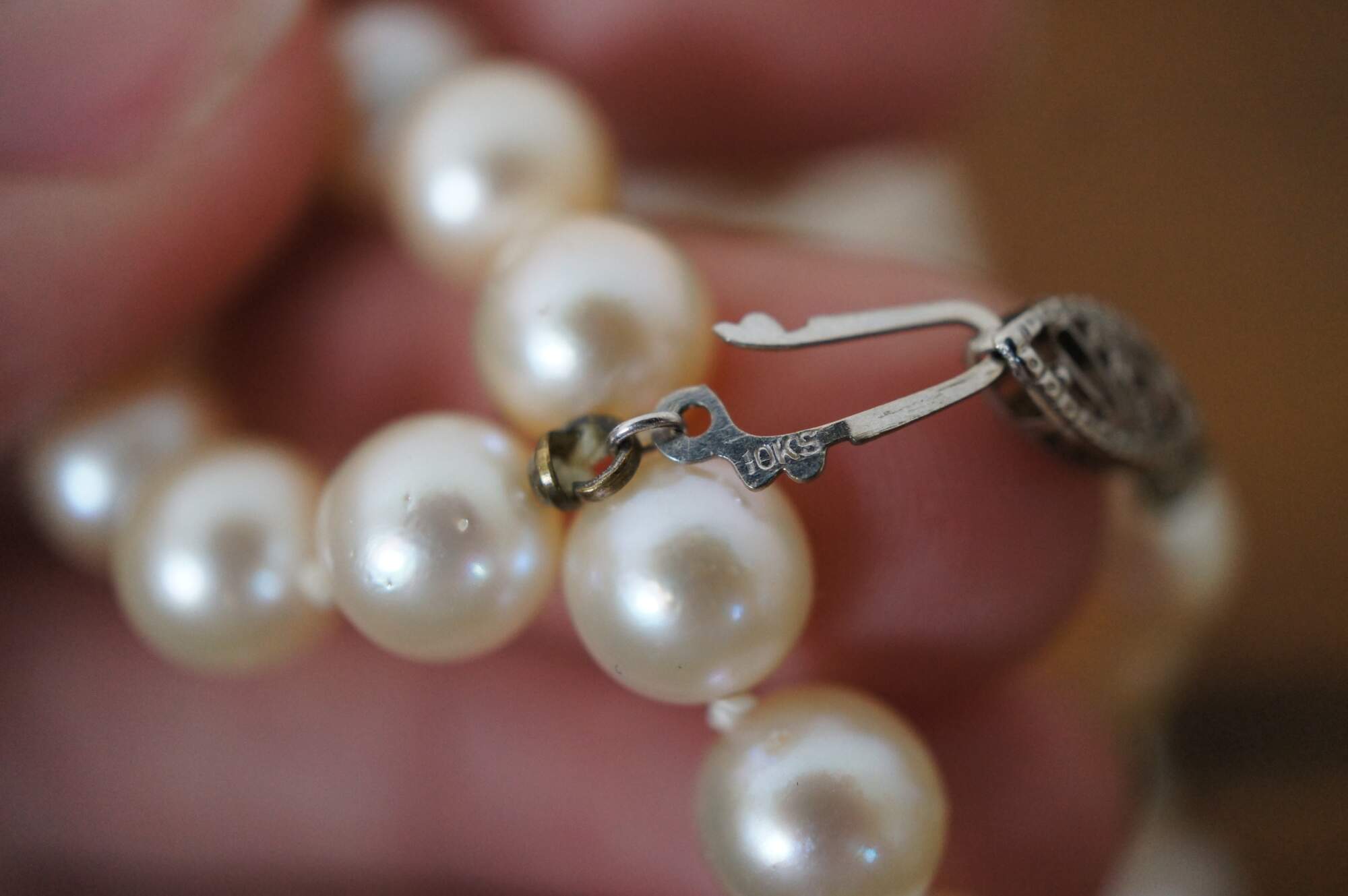 Lot of 13 vintage pieces of faux pearl jewelry including a gold tone wheat / barleycorn chain with spring ring clasp and upside-down-flower shaped pendant tipped with seed pearls and matching post back earrings; knotted pearl necklace with barrel clasp; knotted pearl necklace with pearl clasp marked 10KS; knotted pearl bracelet with spring ring clasp; post back single pearl earrings; gold tone double pearl ring; 12K gold filled screw back earrings with small pearls and jump ring for missing dangle; and 14K white gold screw back single faux pearl earrings, makers mark F over and arrow. Includes vintage blue velvet jewelry box from Aman & Co of Dayton, Ohio.