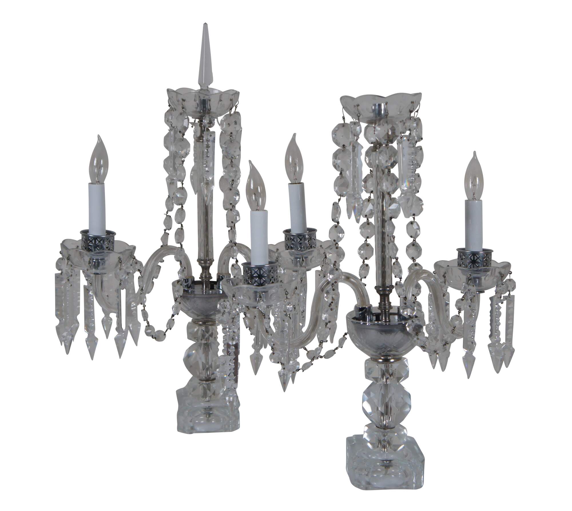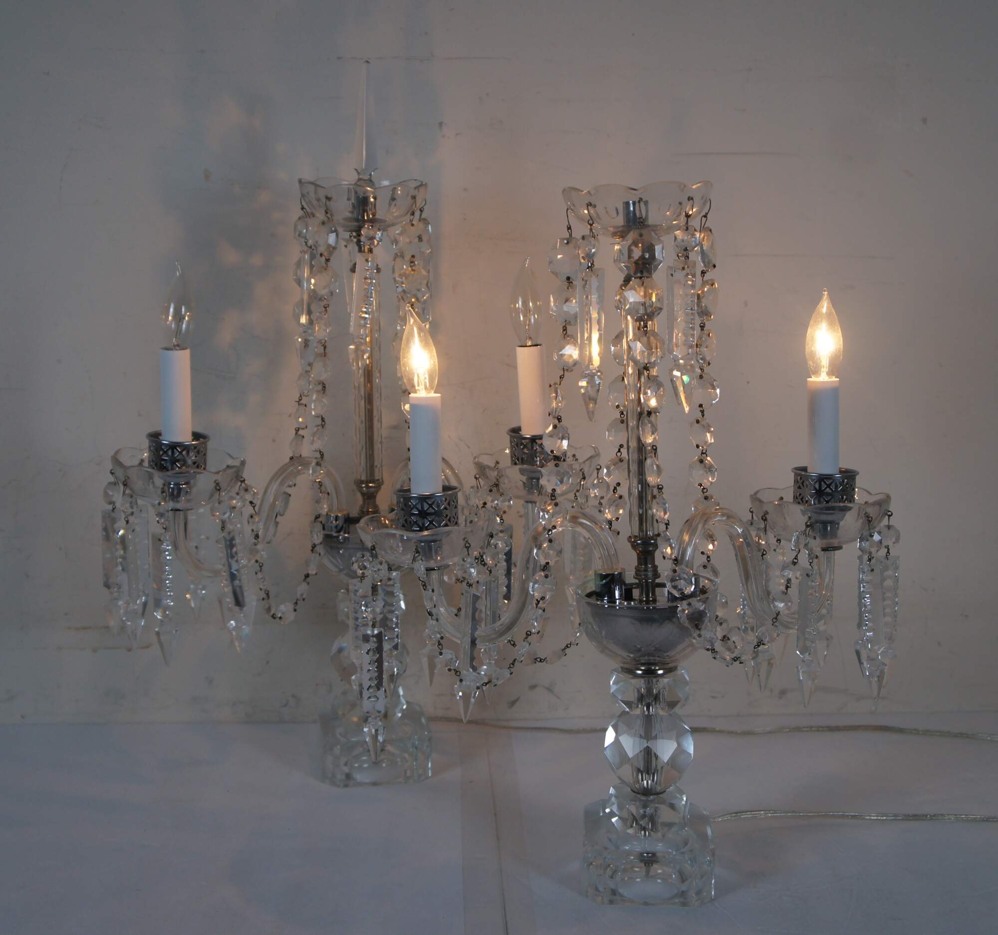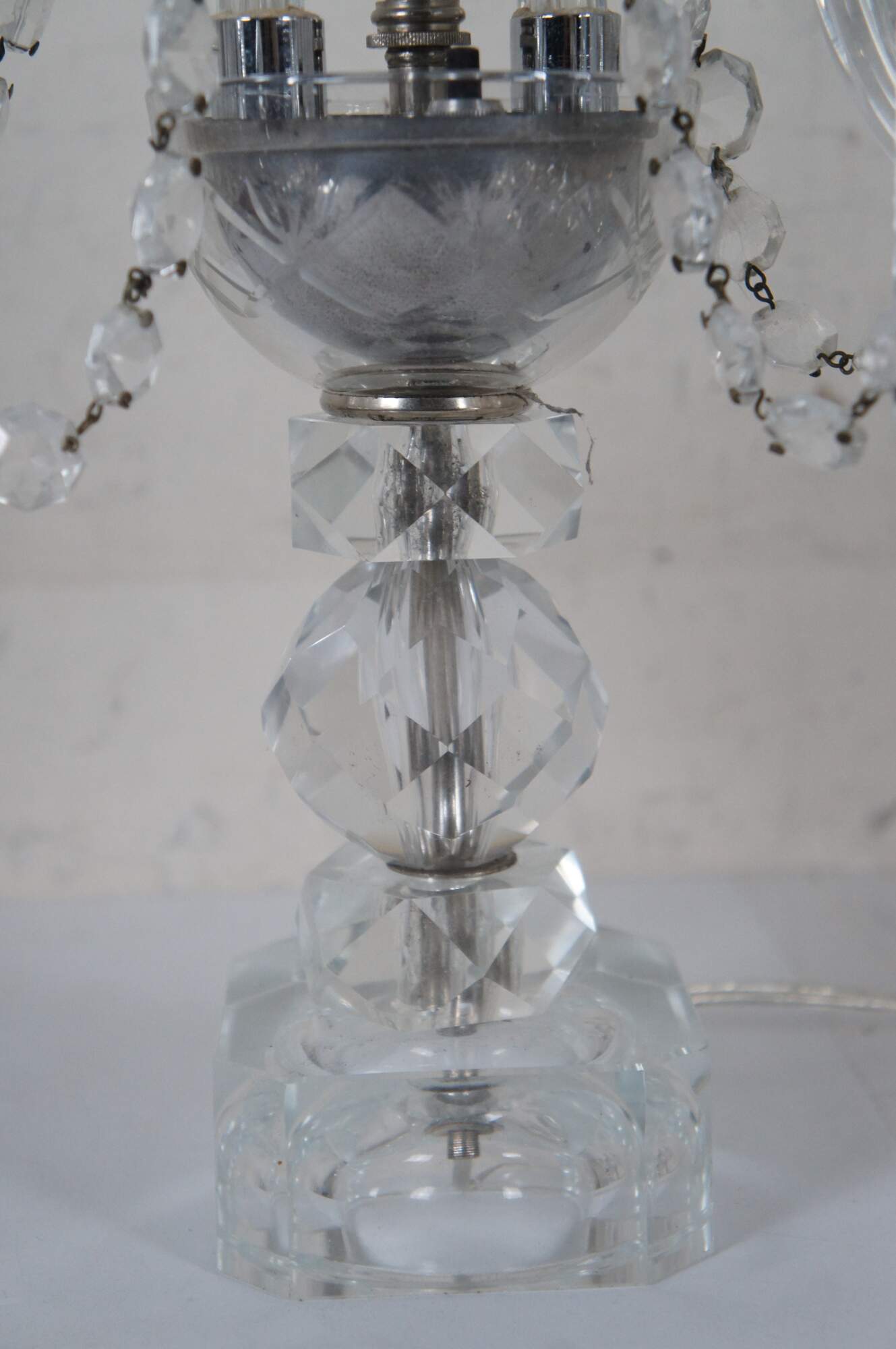Pair of mid century cut glass candelabra style table / buffet lamps featuring stacked faceted geometric bases supporting three candelabra arms – two illuminated and one central pillar topped with a spire finial – draped in drop crystals and beaded swags.