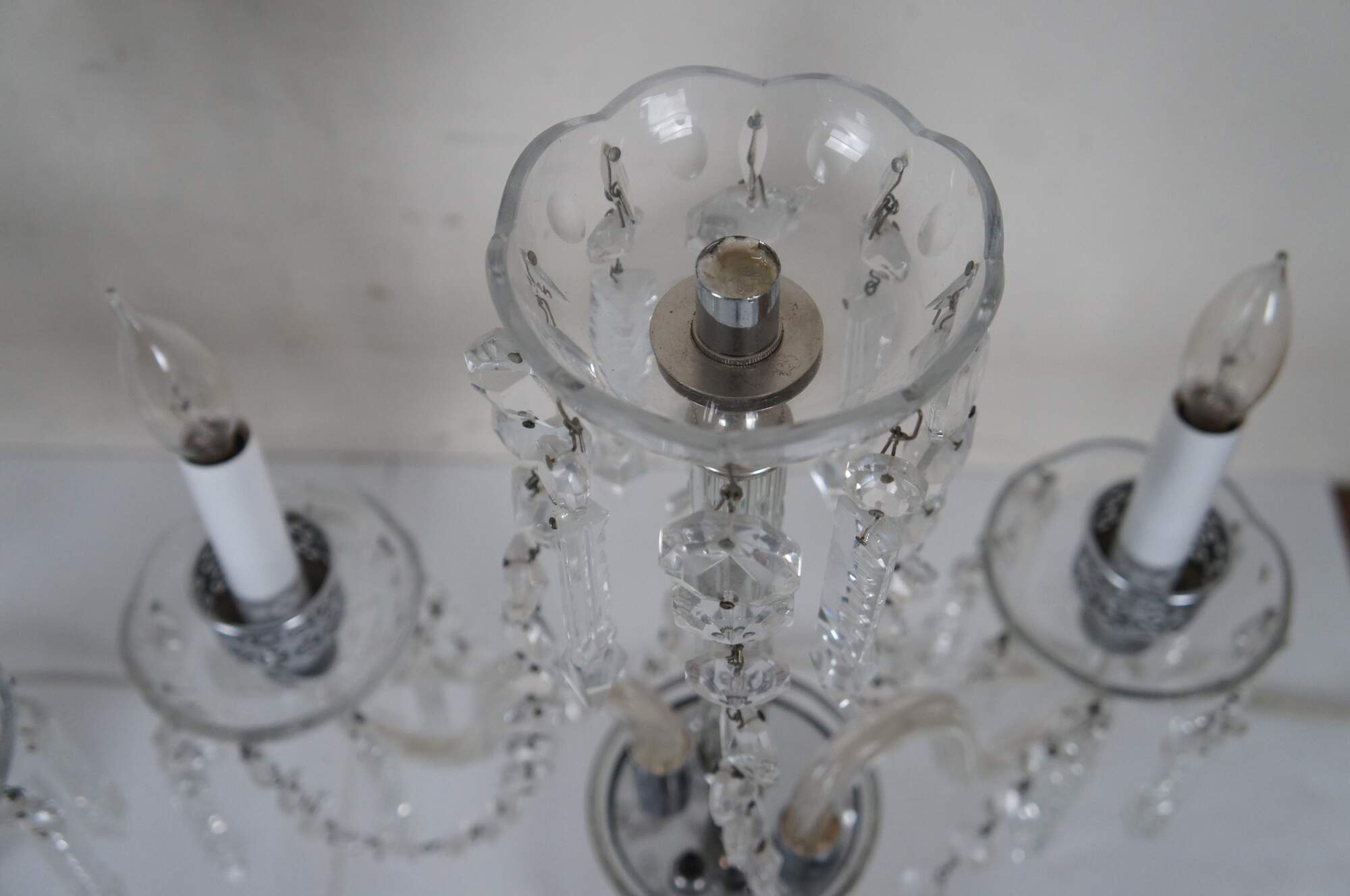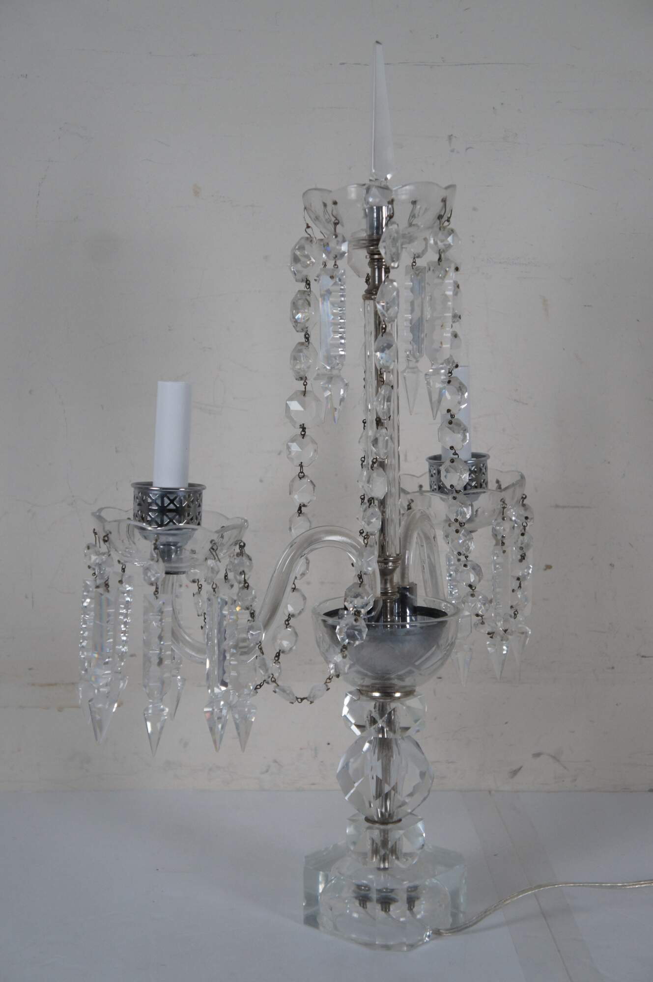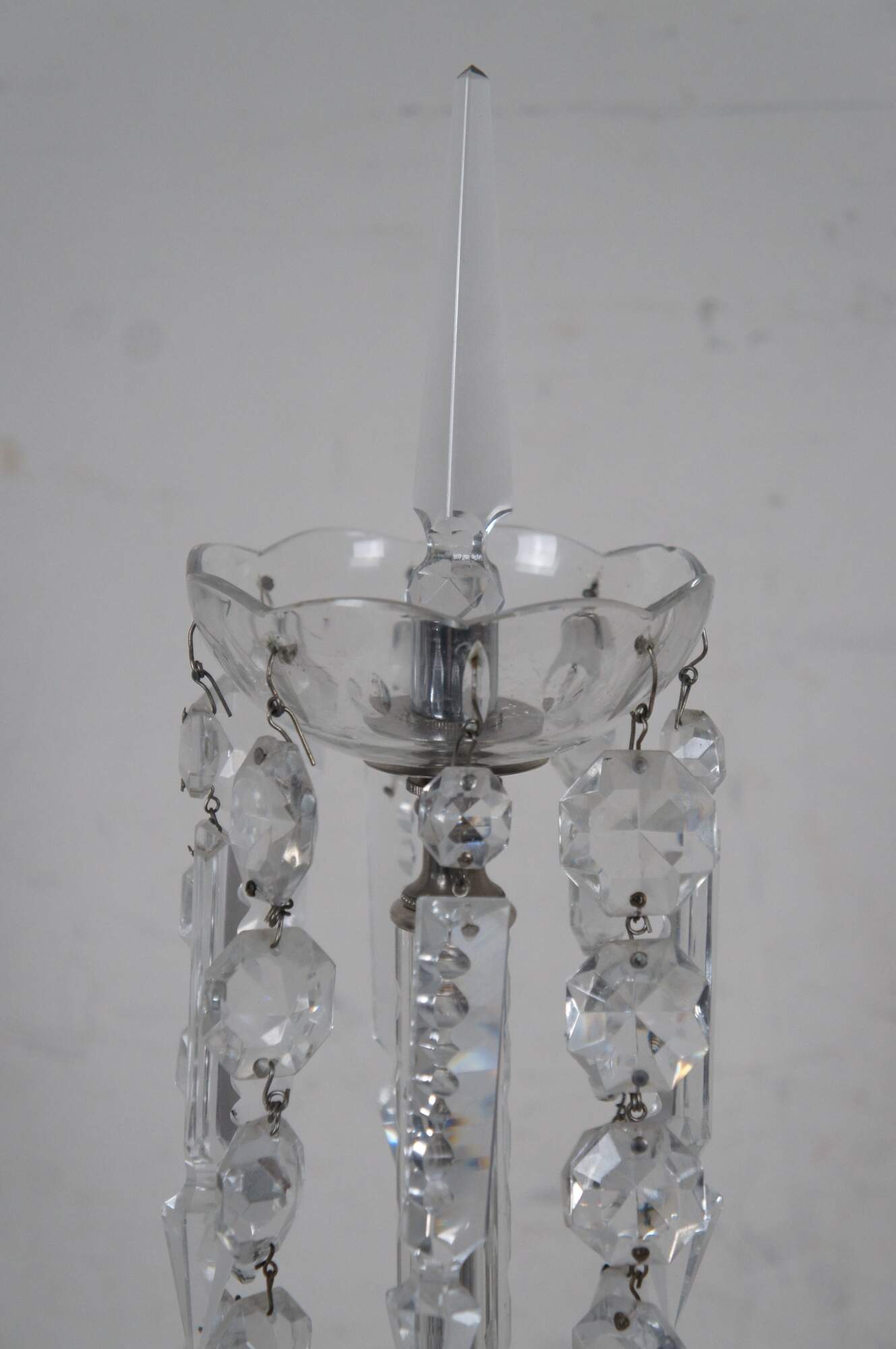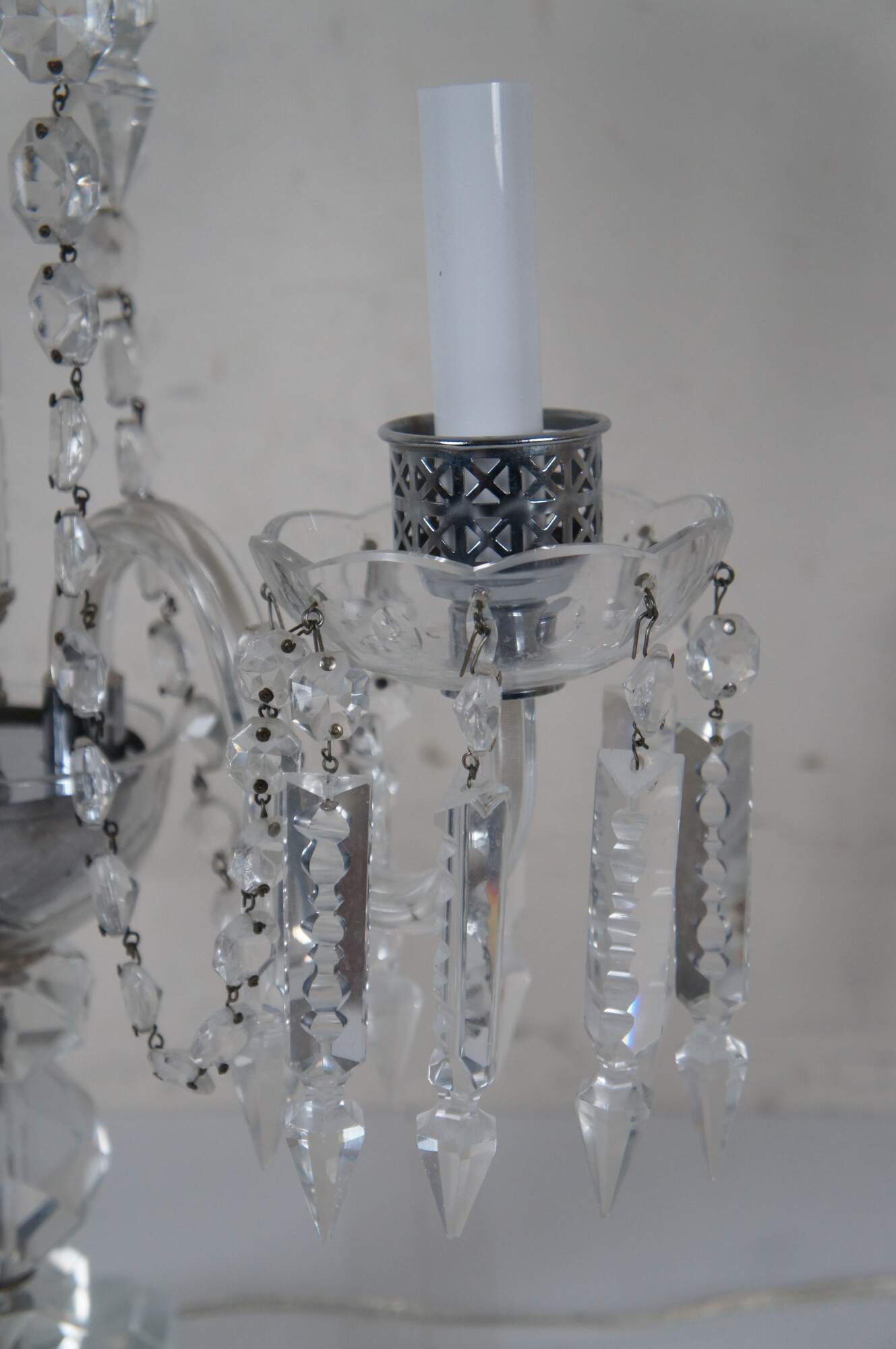 Pair of mid century cut glass candelabra style table / buffet lamps featuring stacked faceted geometric bases supporting three candelabra arms – two illuminated and one central pillar topped with a spire finial – draped in drop crystals and beaded swags.