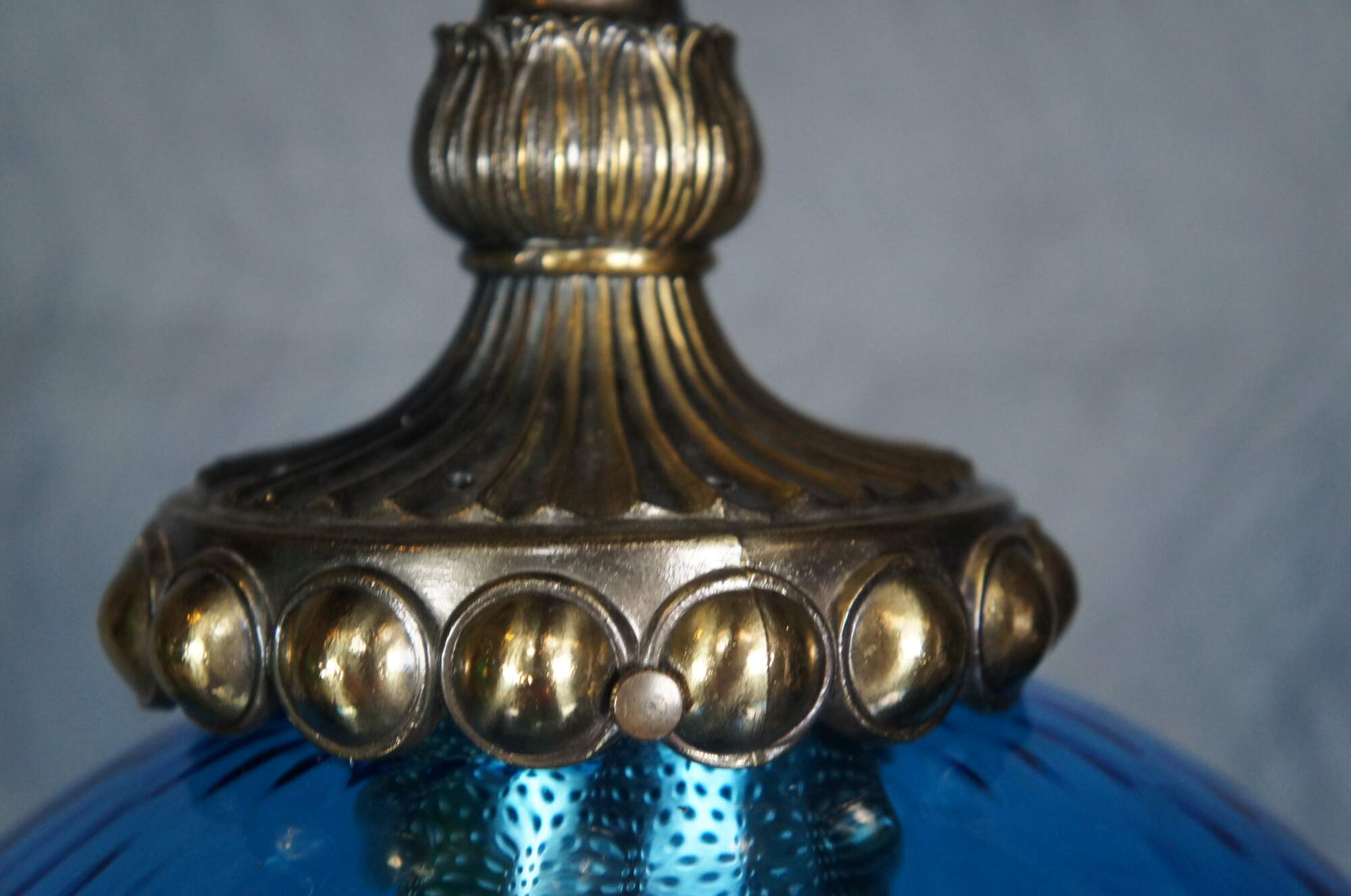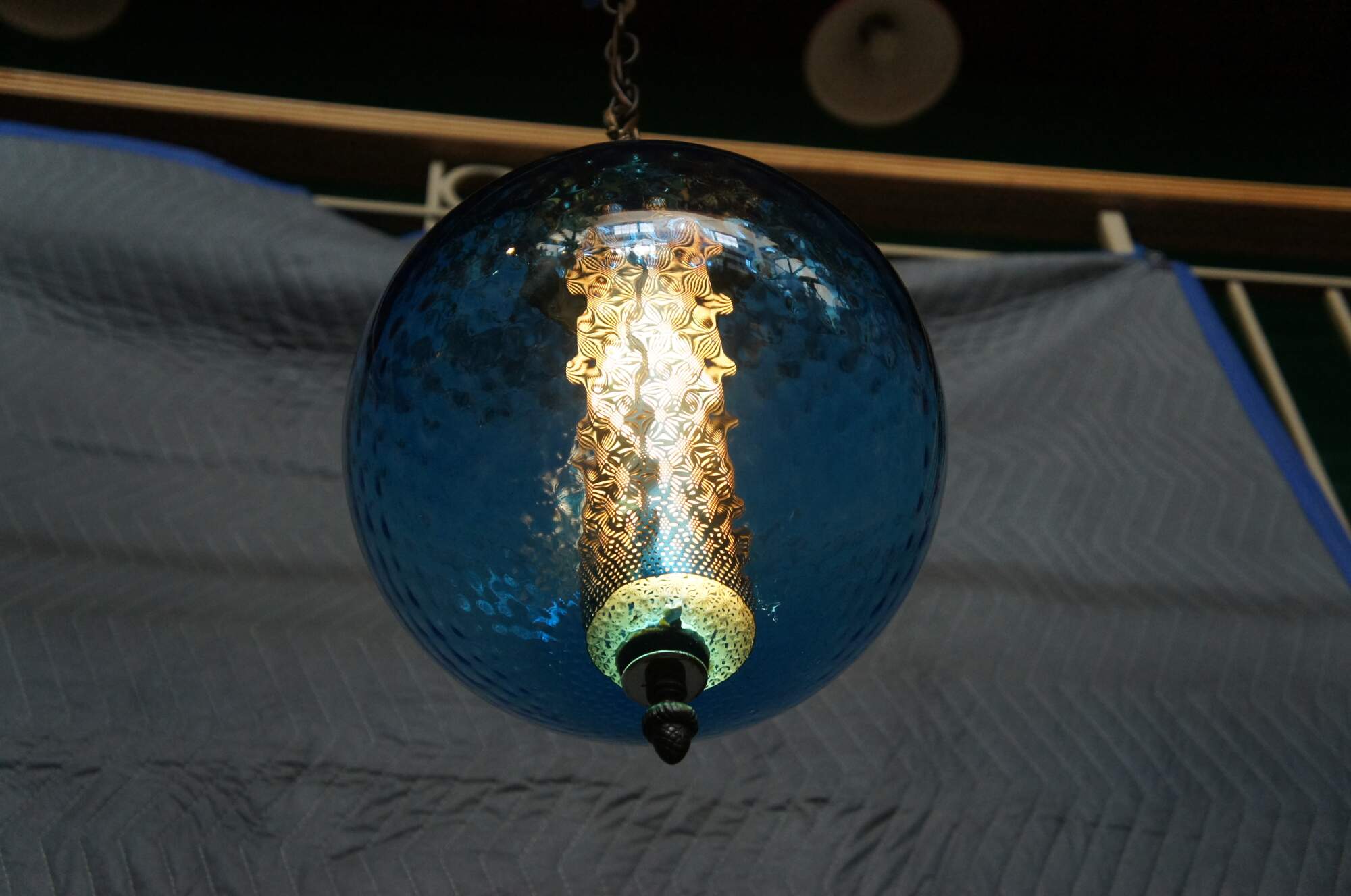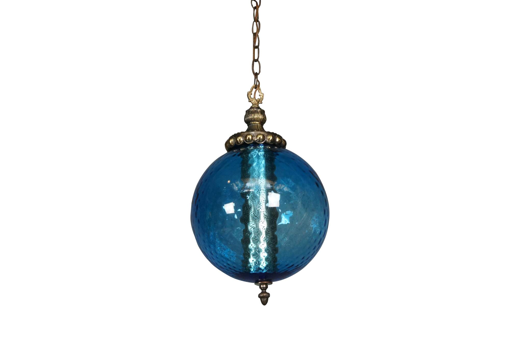 Pair of two mid century modern / retro carl Faulkenstein swag glass lamps / lights featuring circular form with quilted / bubbled / textured surface and brass acorn finials, Stamped 1966.