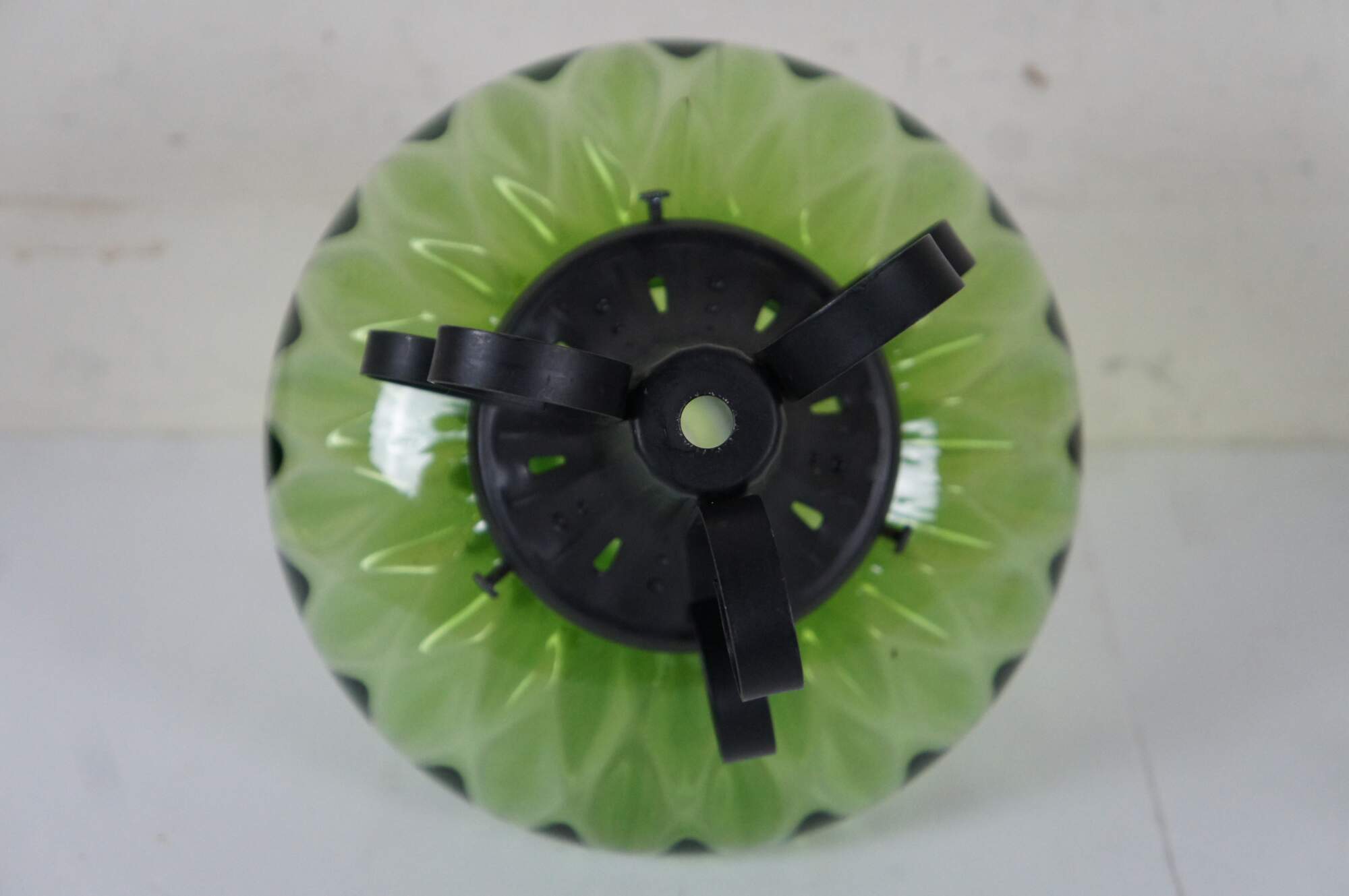 Pair of mid century green glass pendant / swag light shades / globes with green spindle finials and black metal tops with scroll accents. Not currently wired with electric.
