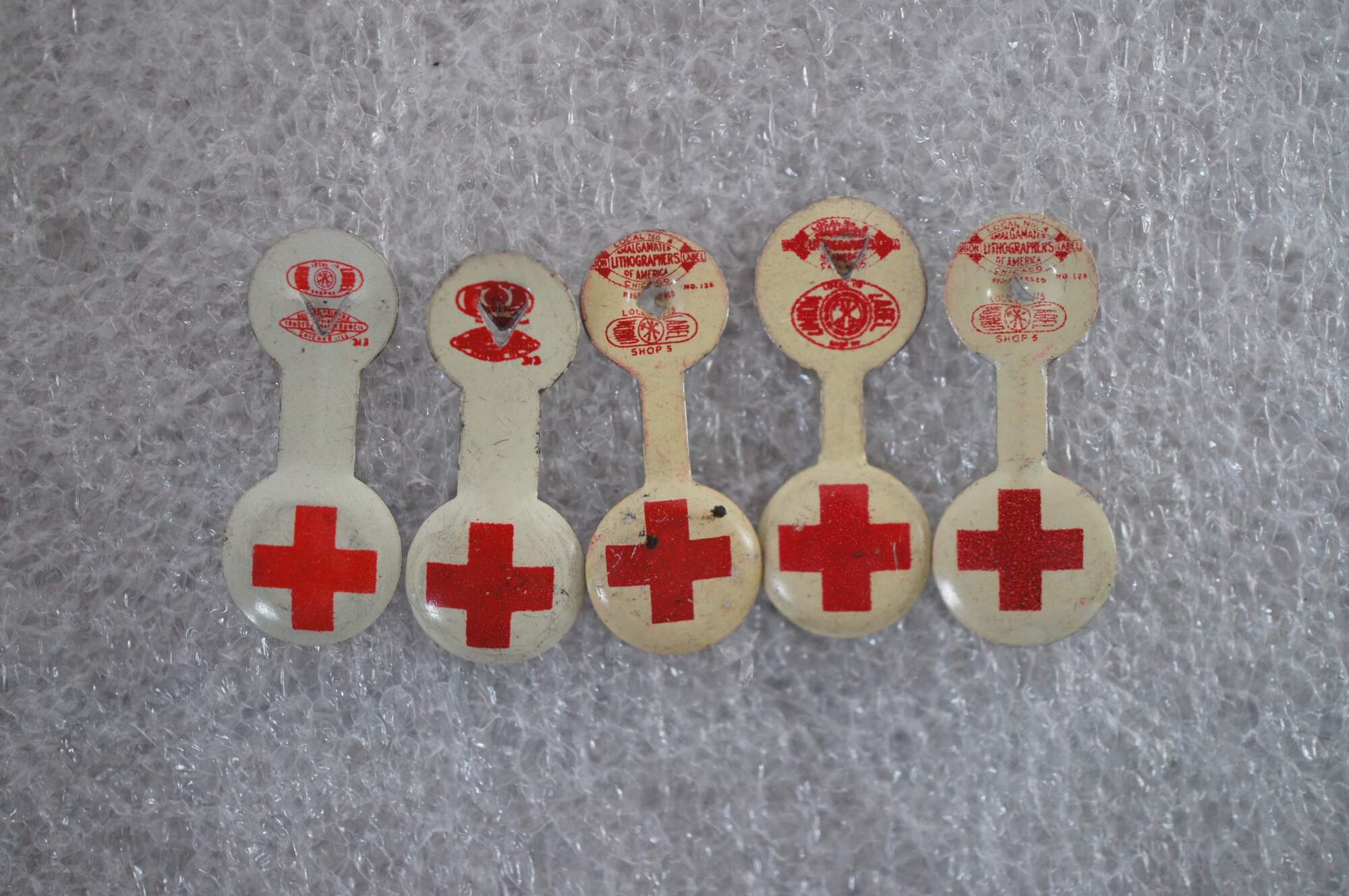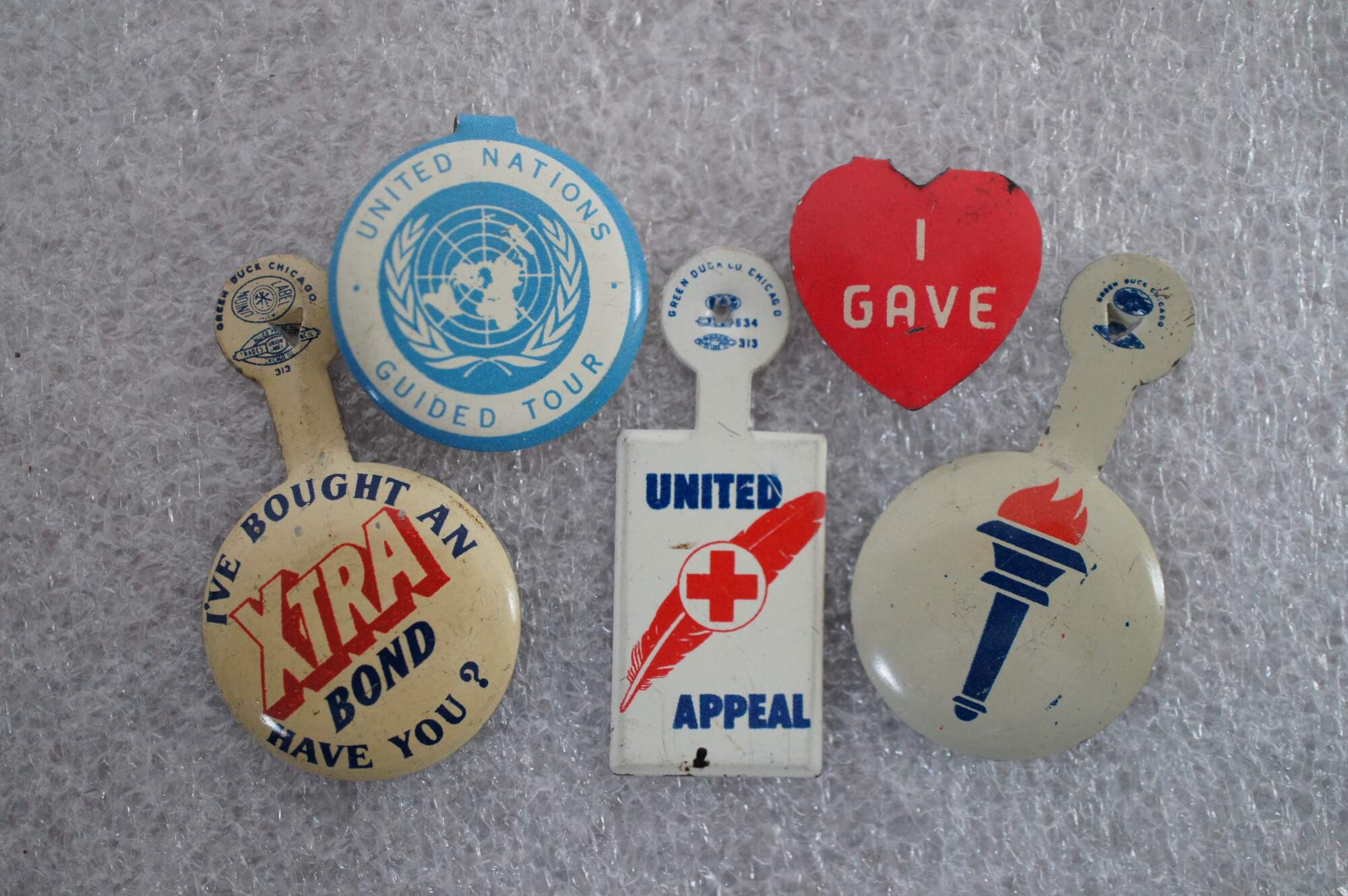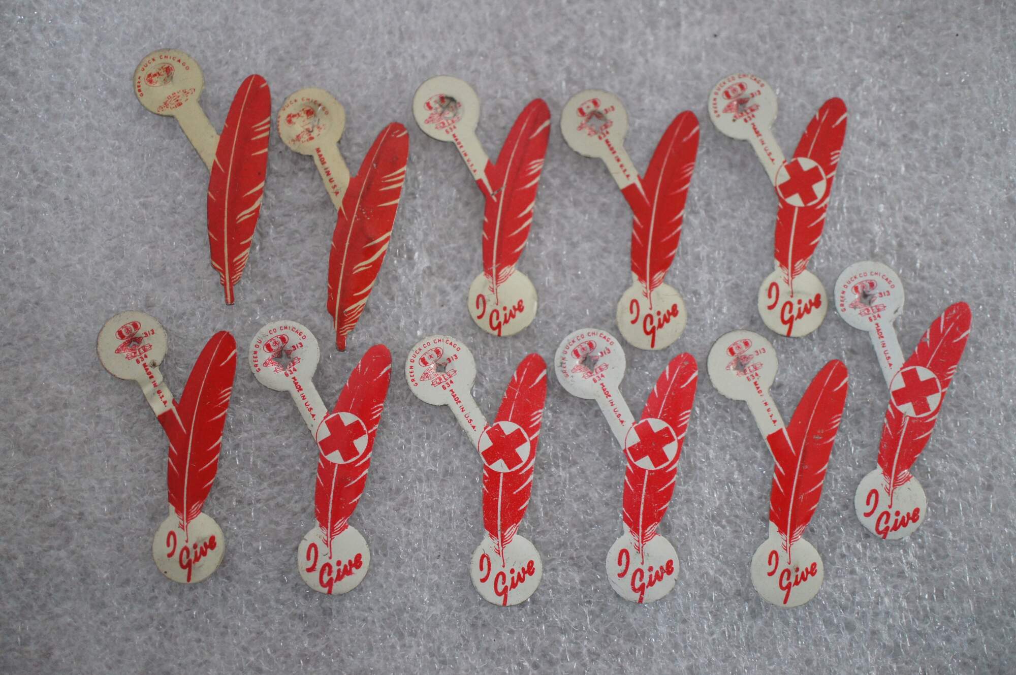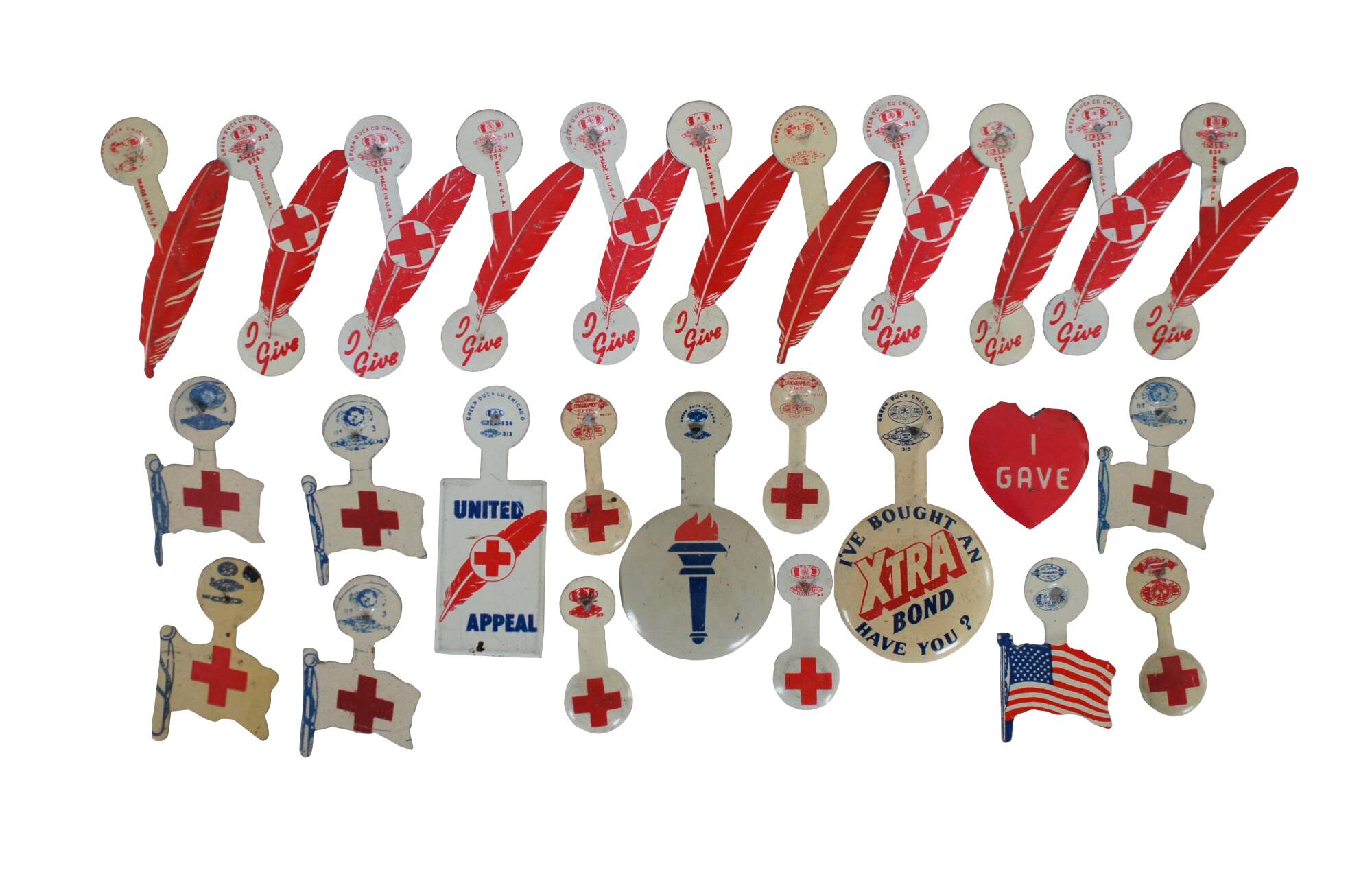 Lot of 40 early to mid 20th century tin litho fold over tab and button pins, primarily for donating blood to the American Red Cross, but also supporting the purchase of war bonds, the United Appeal, Sweetest Day, the Montgomery County War Chest, and one from the united Nations Guided Tour.