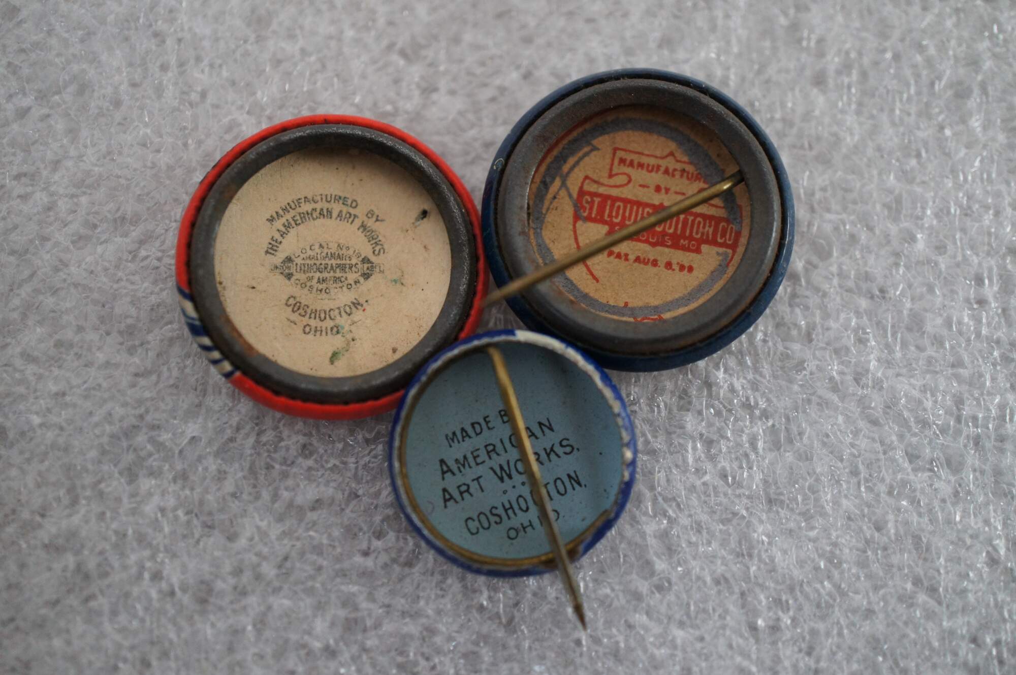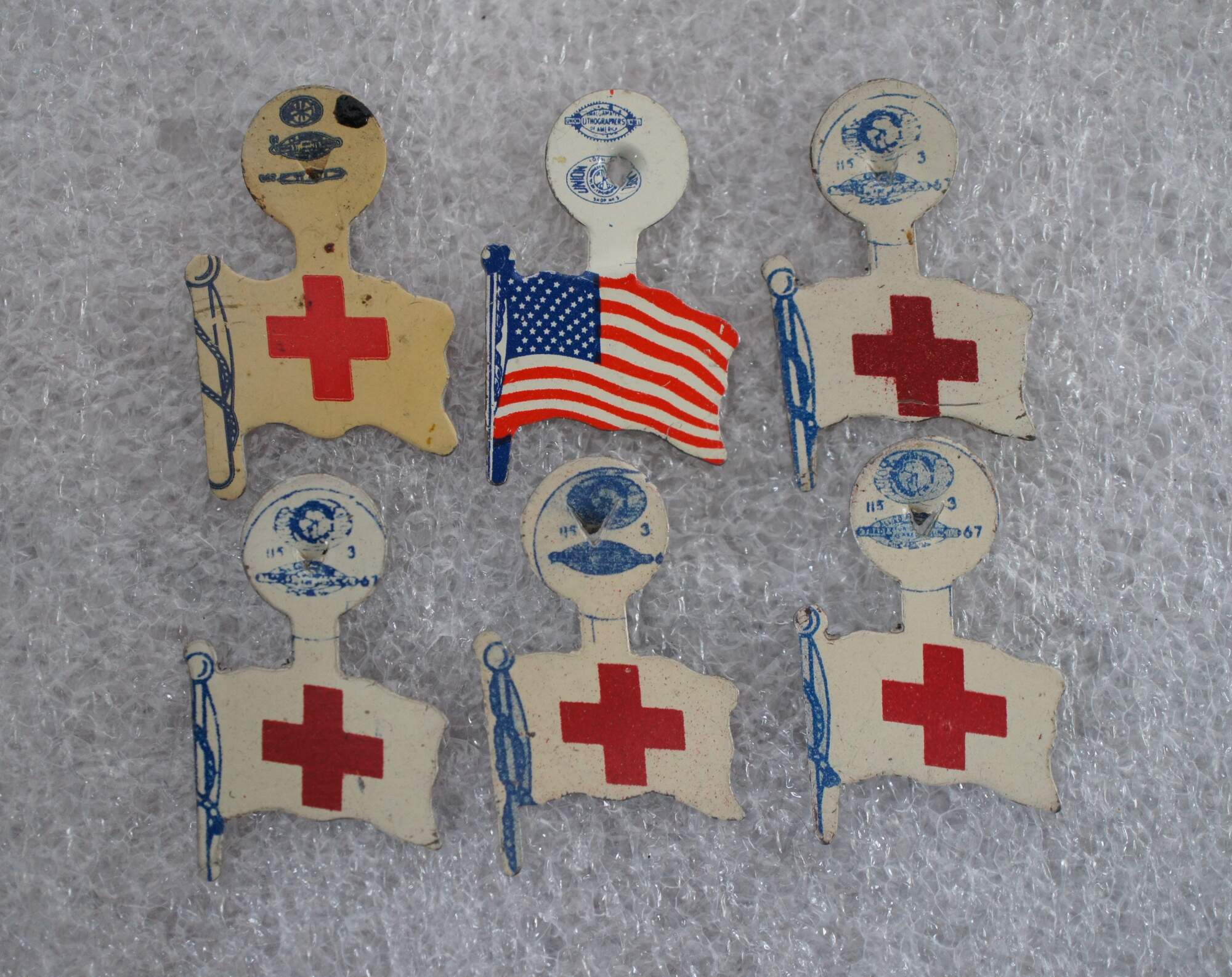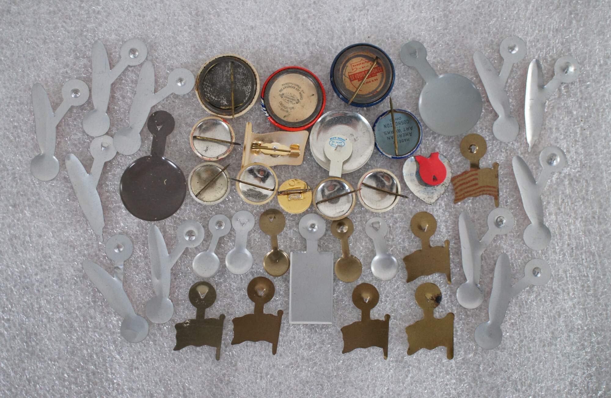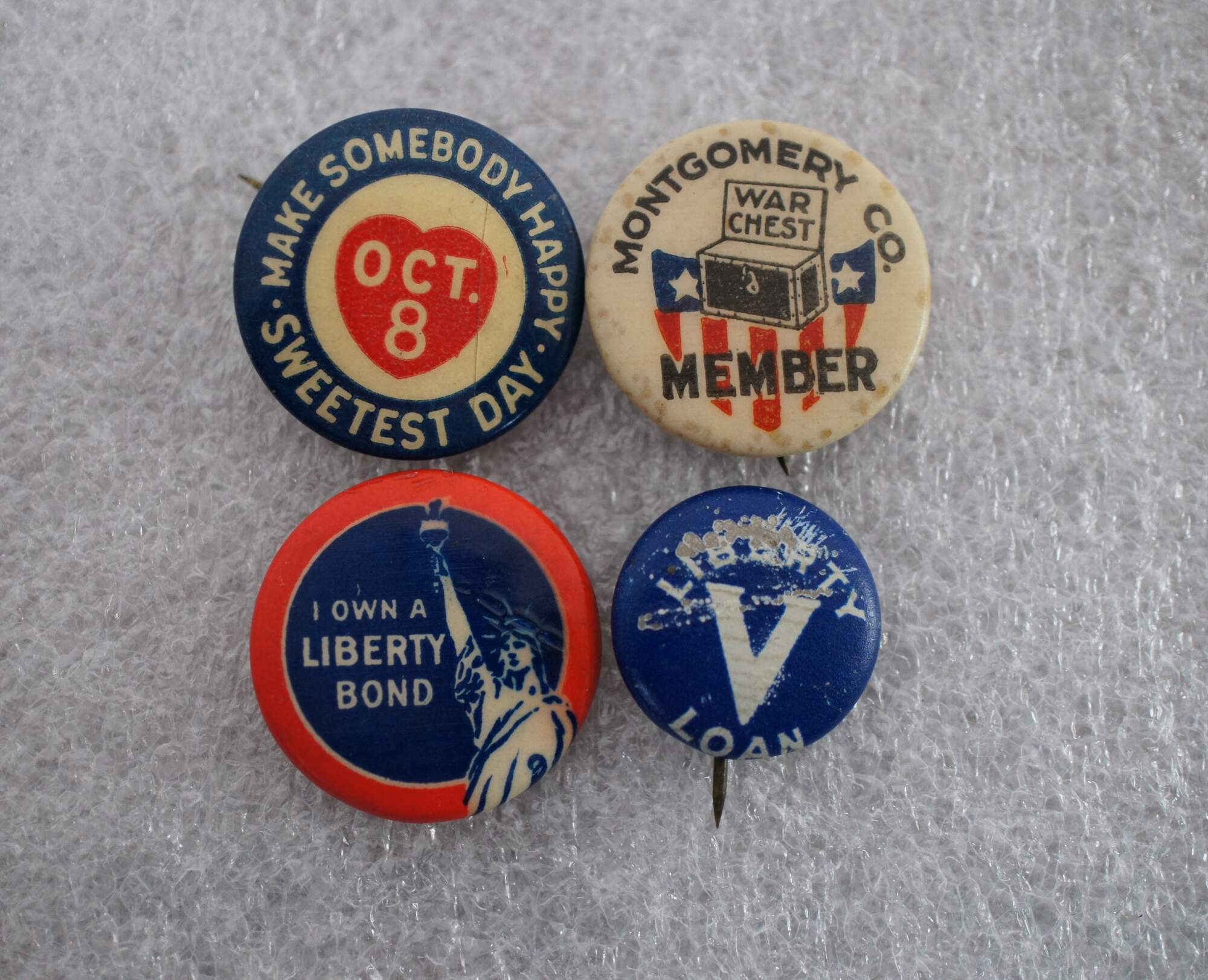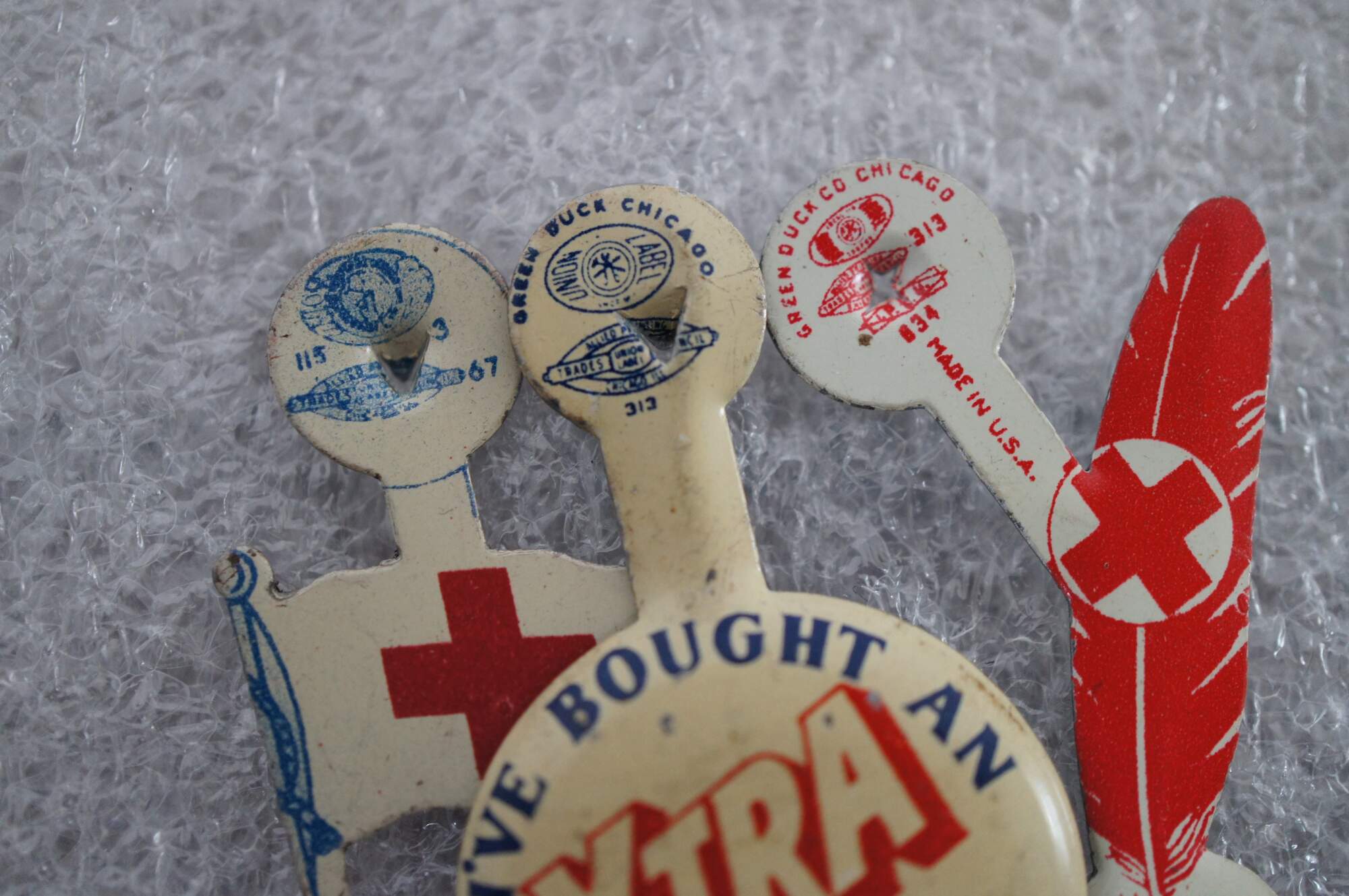 Lot of 40 early to mid 20th century tin litho fold over tab and button pins, primarily for donating blood to the American Red Cross, but also supporting the purchase of war bonds, the United Appeal, Sweetest Day, the Montgomery County War Chest, and one from the united Nations Guided Tour.