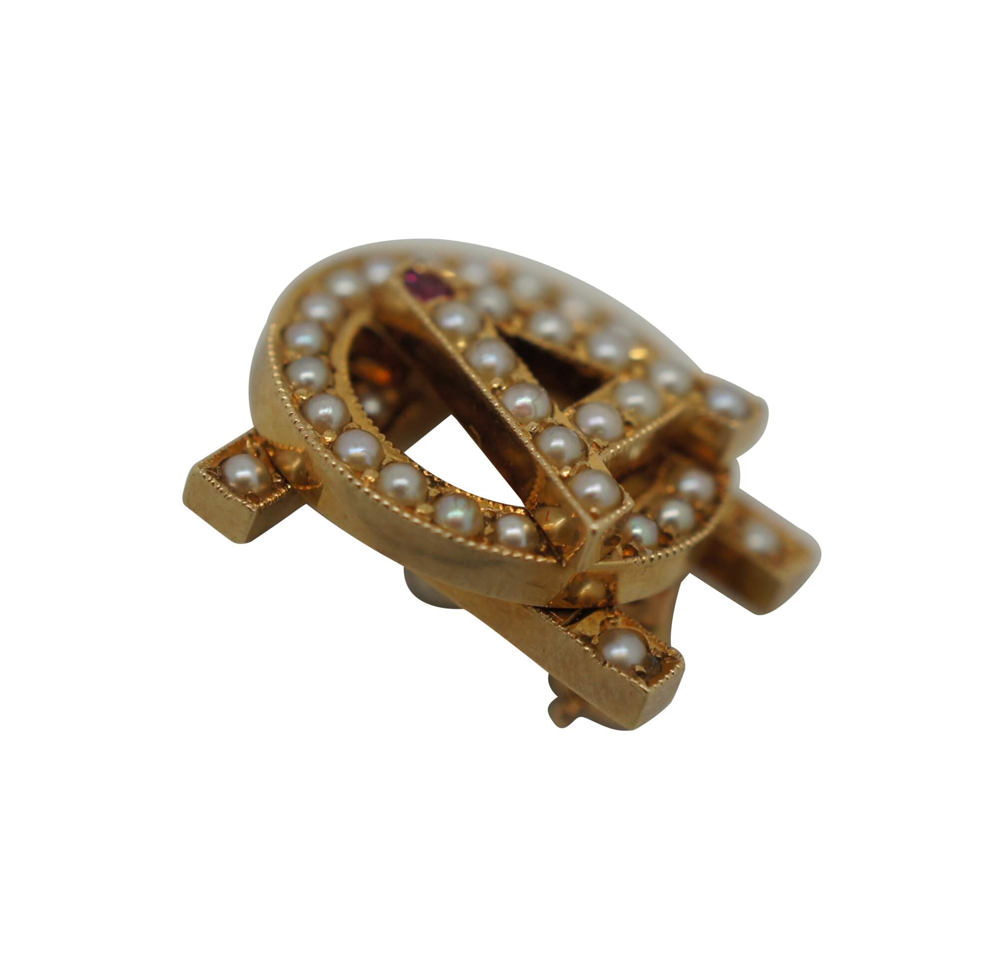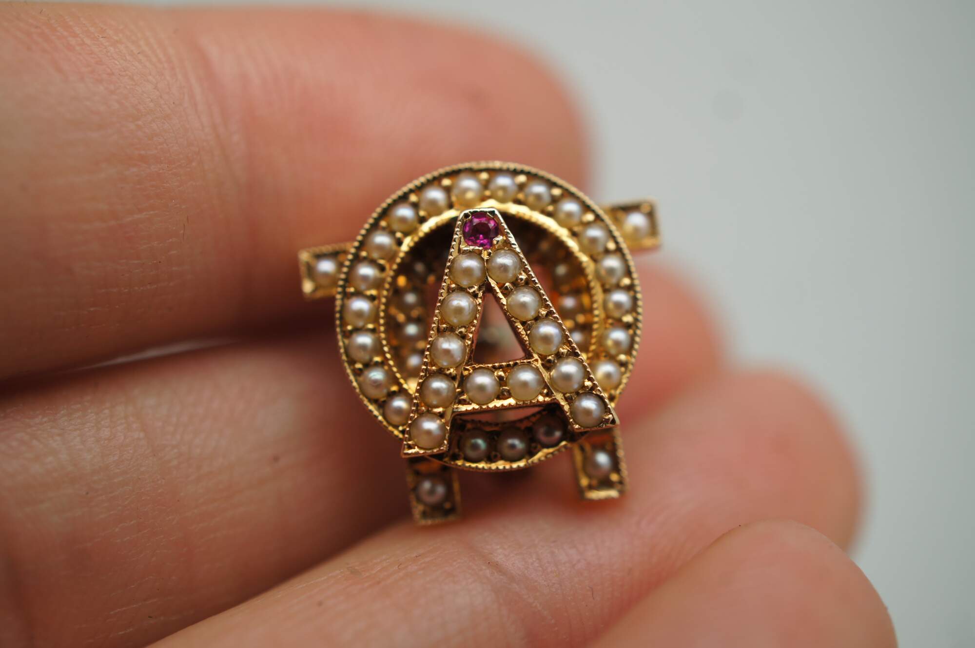 Antique Alpha omicron Pi college sorority pin. The overlapped / stacked gold Greek letters are lined with seed pearls and one ruby at the tip of the Alpha. Reverse is engraved Omega 35 and the name Jean Ballinger.