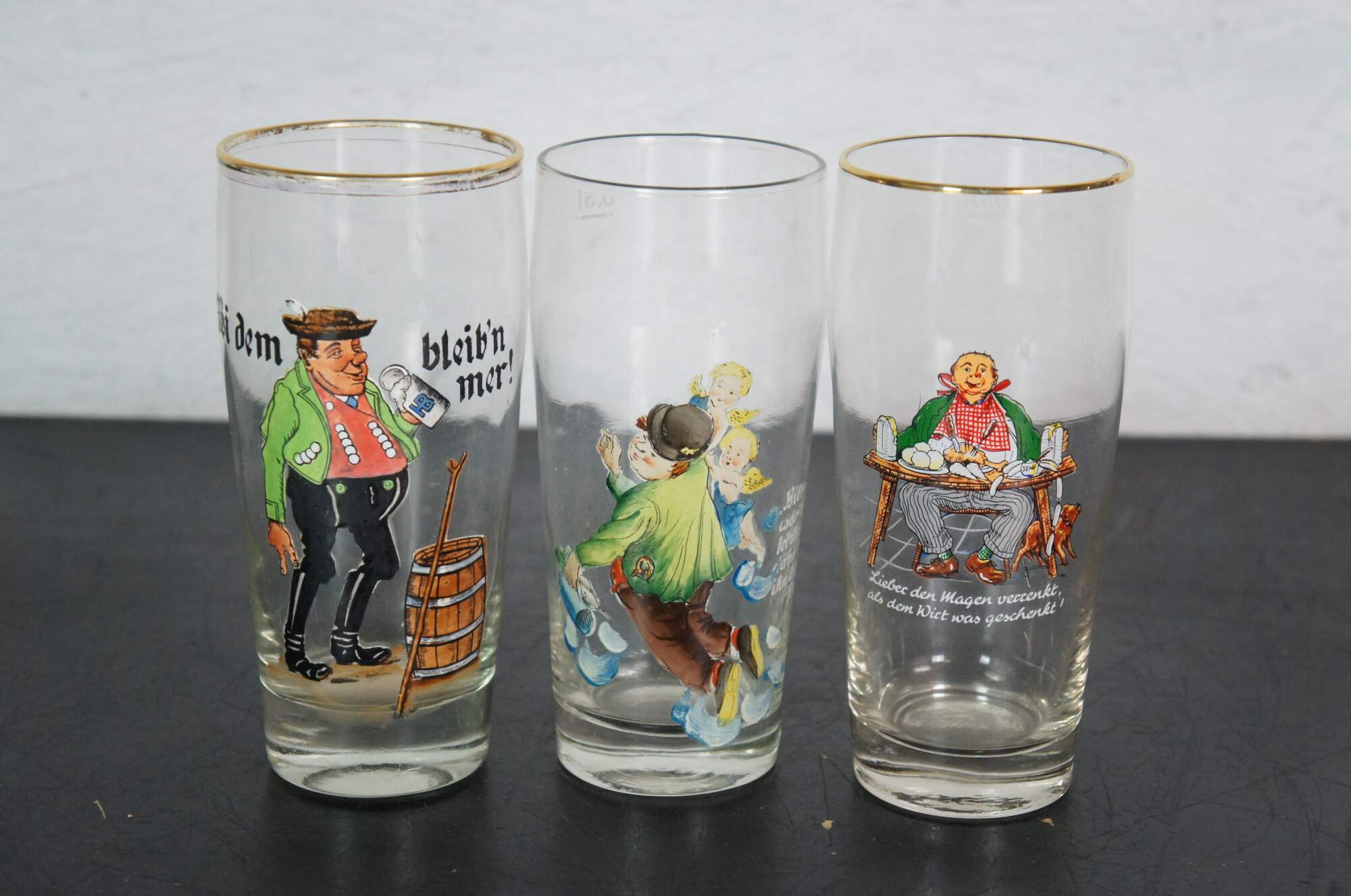 Lot of 23 circa mid-20th century German beer glasses featuring novelty / humorous / risque scenes and figures. Includes 5 boots, 1 goblet and 1 bottle flask.
