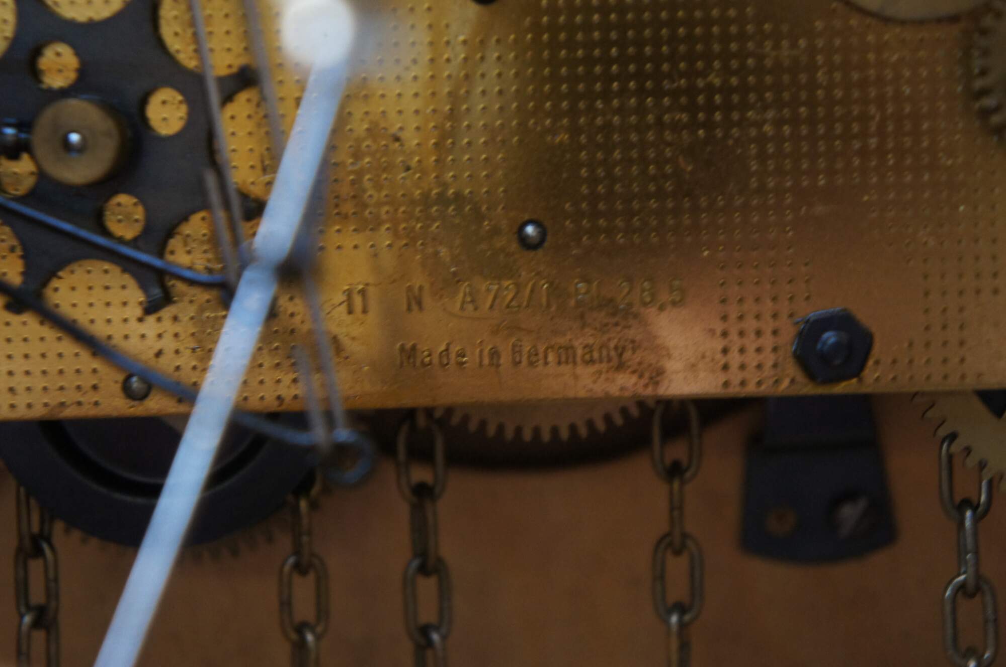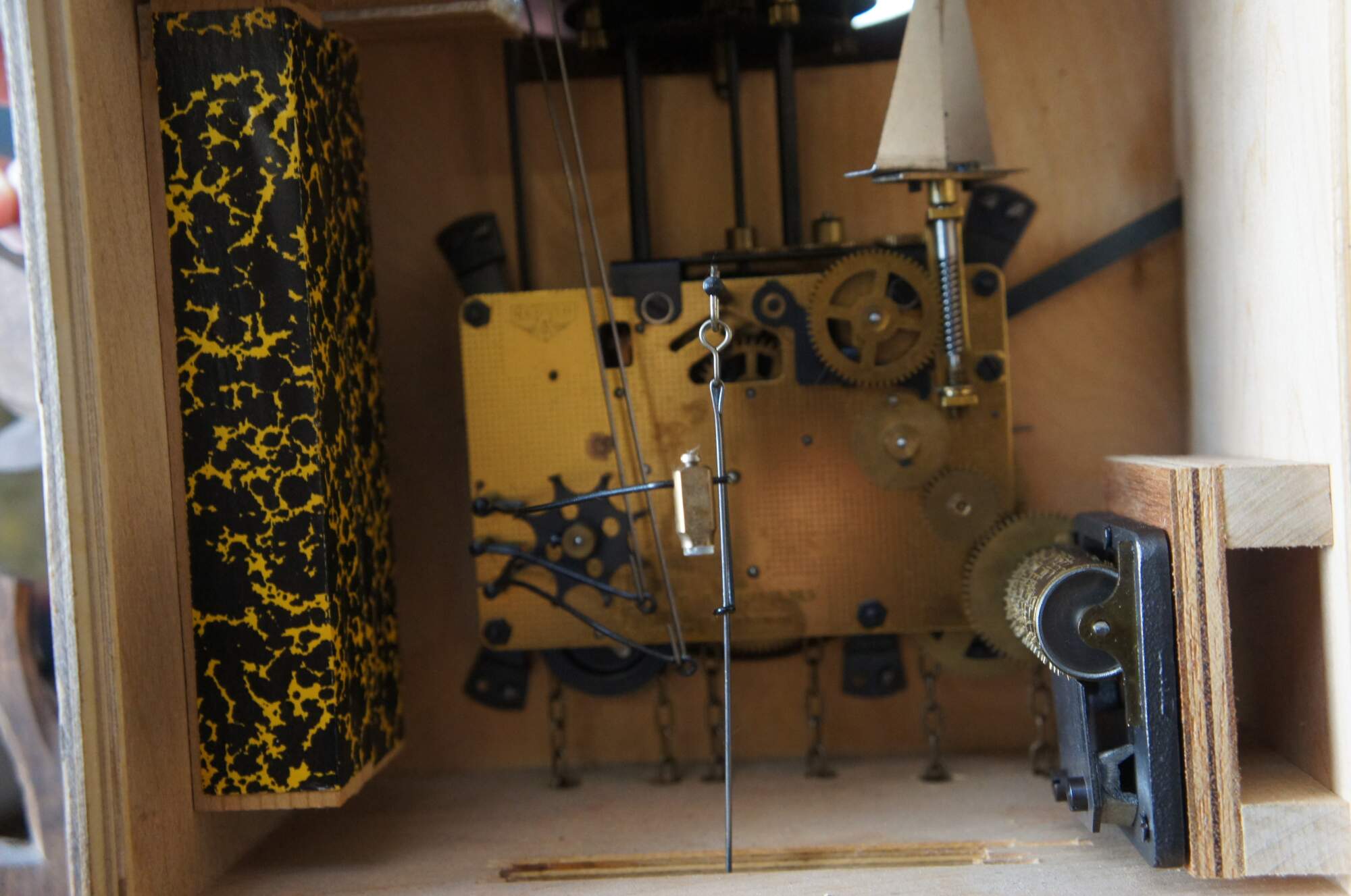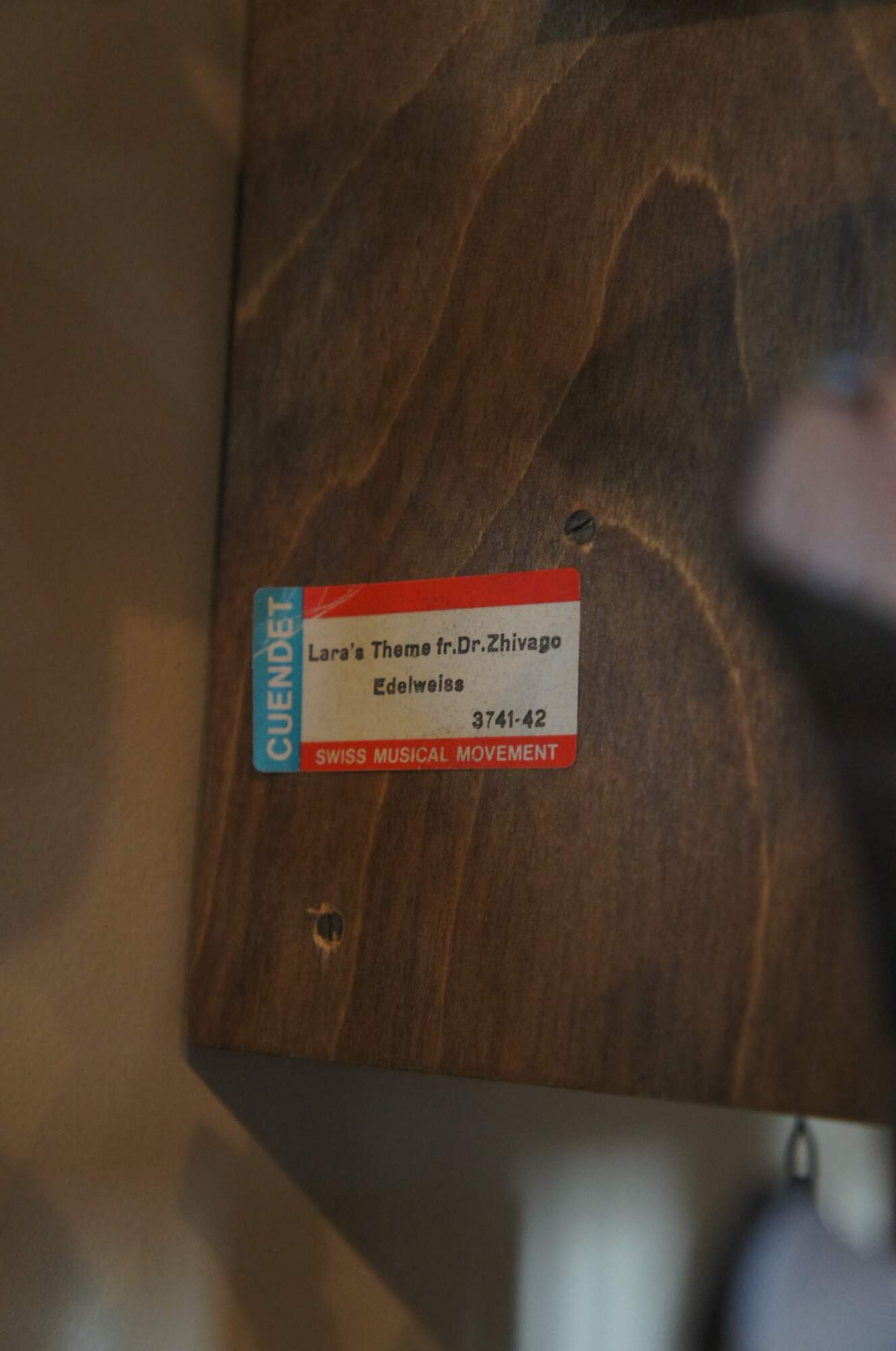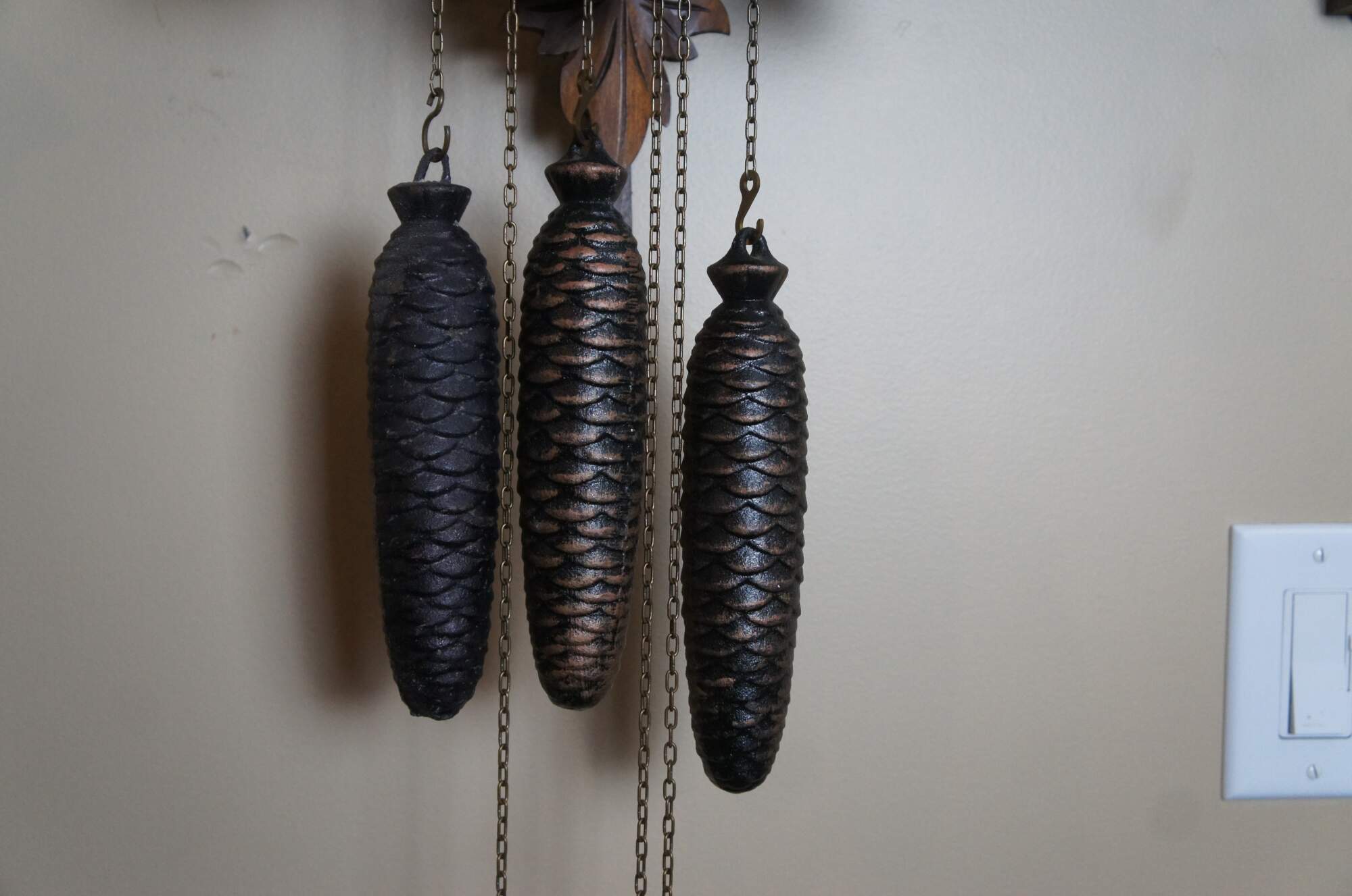A large vintage black forest cuckoo wall clock, made in Germany. Features Regula-72 German 8 day movement with Cuendet Swiss musical movement playing Lara's Theme from Dr. Zhivago. The Roman numeral clock face has a lattice backing and is surrounded by carved birds, branches and leaves. Includes 3 pinecone weights and a leaf carved finial. A single cuckoo comes out along the top at the half hour and again at the full hour. The dancers rotate and spin at the top of each hour as music is playing.