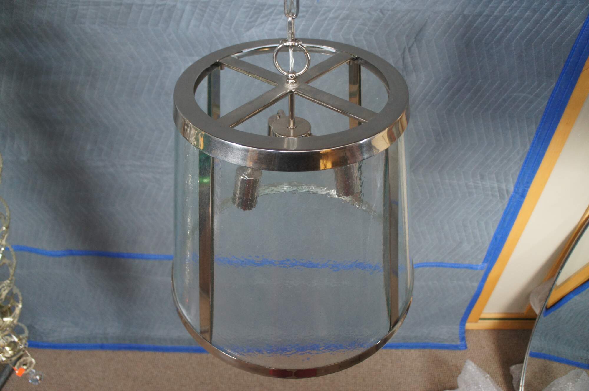 Visual Comfort Studio Collection Harrow Large Pendant Light. Features a tapered shade with polished nickel finish, seeded glass and 3 lights. 2 Available