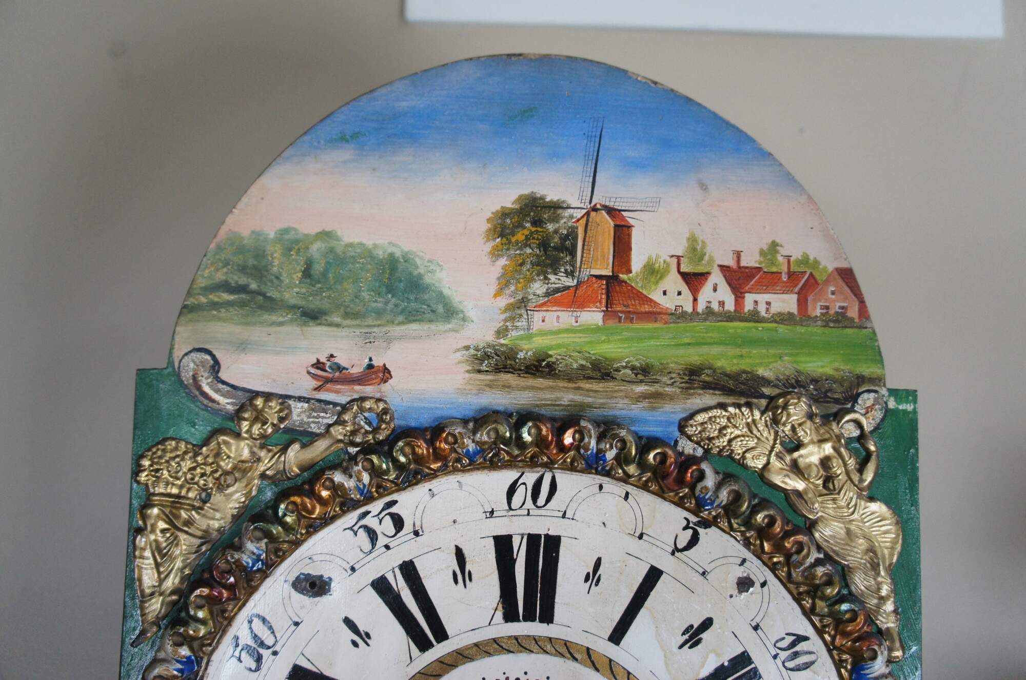 Good Overall with age and use related wear. The clock is currently keeping time and chiming at the half and full hour. It is missing the pulley that would have held the central weight in place. Without it you have to move and re-hang the weight more frequently. There is a split in the case along the right edge of the tail. There is also a split in the bronze mount along the tail towards the bottom right. The lower left capital on the face is missing. Small split in the door. Some paint wear to the face. Missing one of the pin mounts for the face. This is not necessary to hang the face as 3 of the 4 are there.