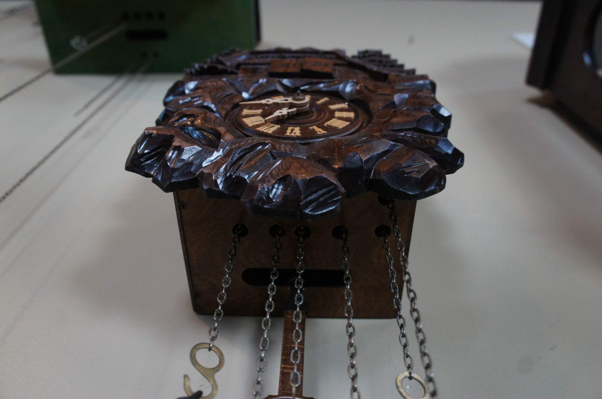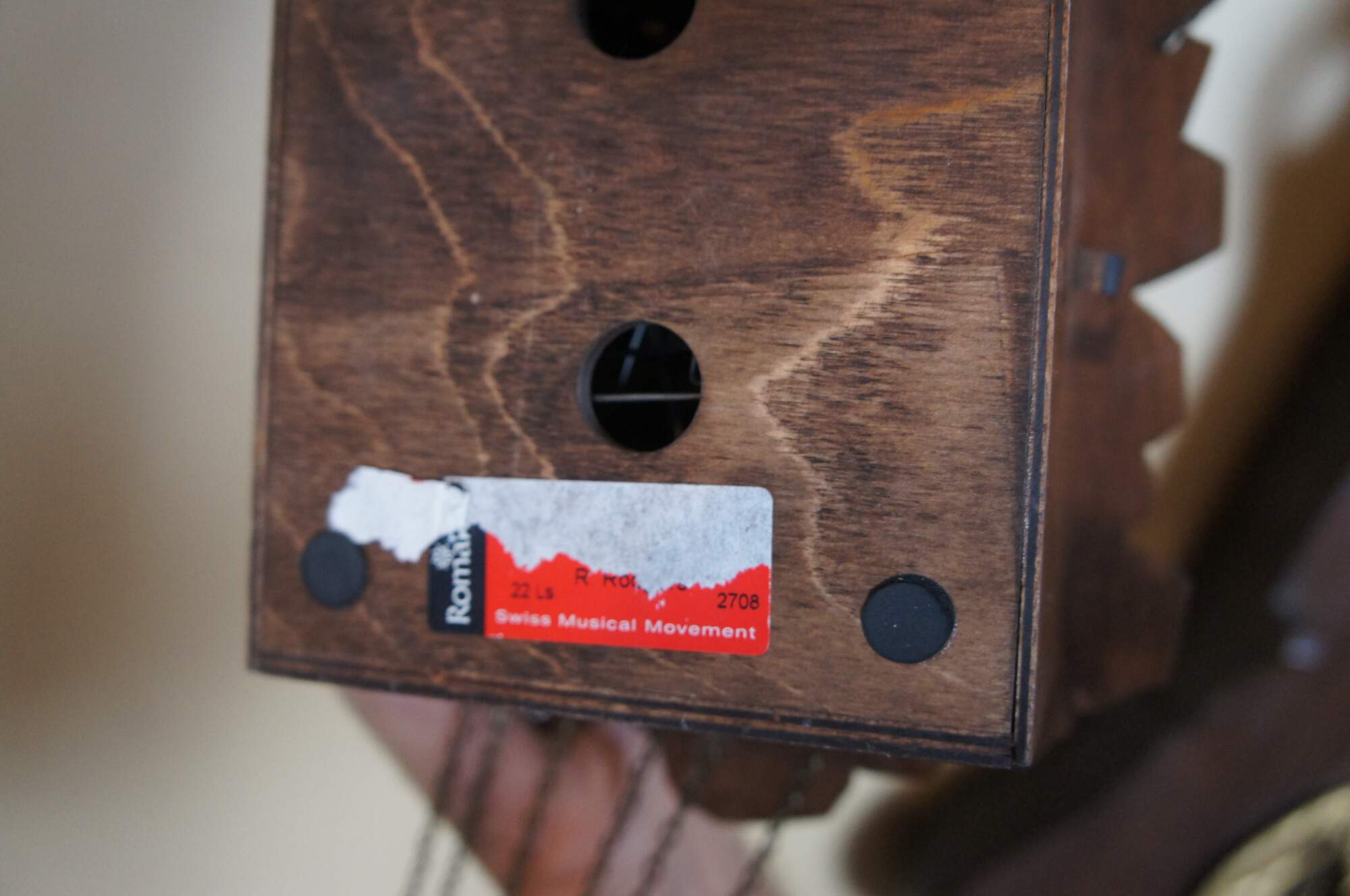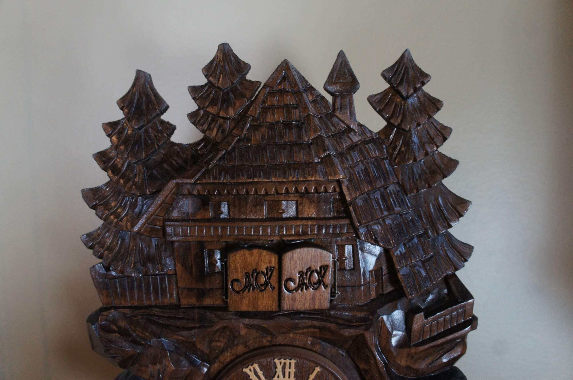 Vintage Black Forest style Cuckoo Clock with German works and Swiss Musical Chime Der Frohliche Wanderer Edelweiss R Rodgers 2708. Features carved house with trees along the top, roman numeral face, pinecone weights and rounded finial with leaf. Features two doors at the top. A cuckoo on the right and man along the left.
