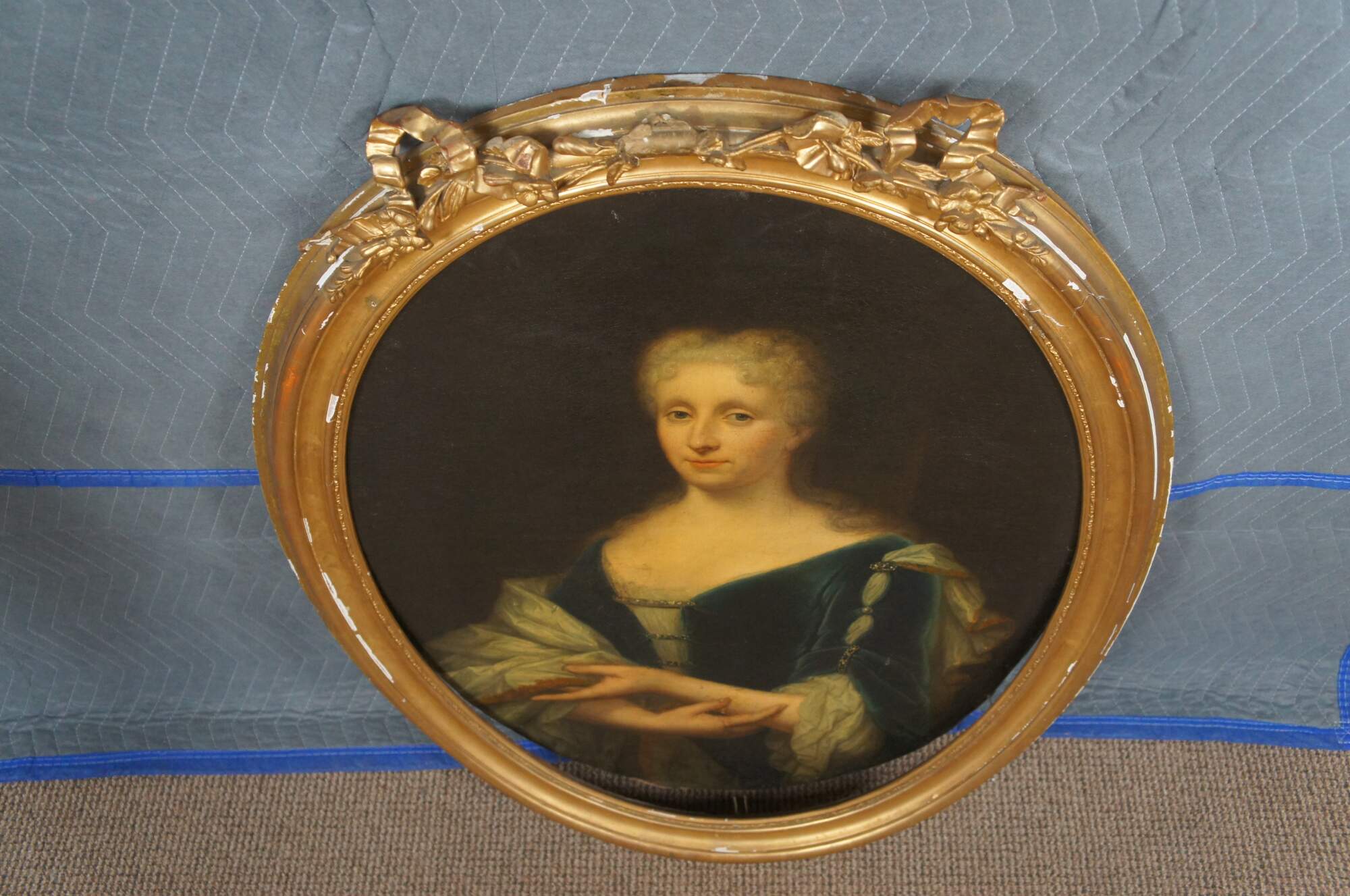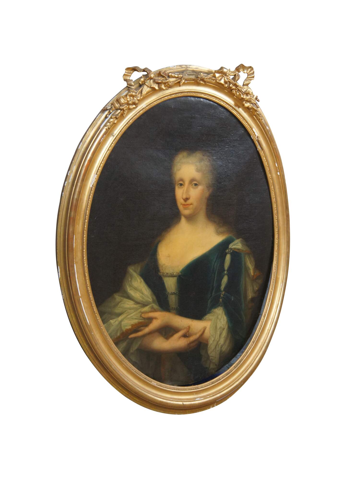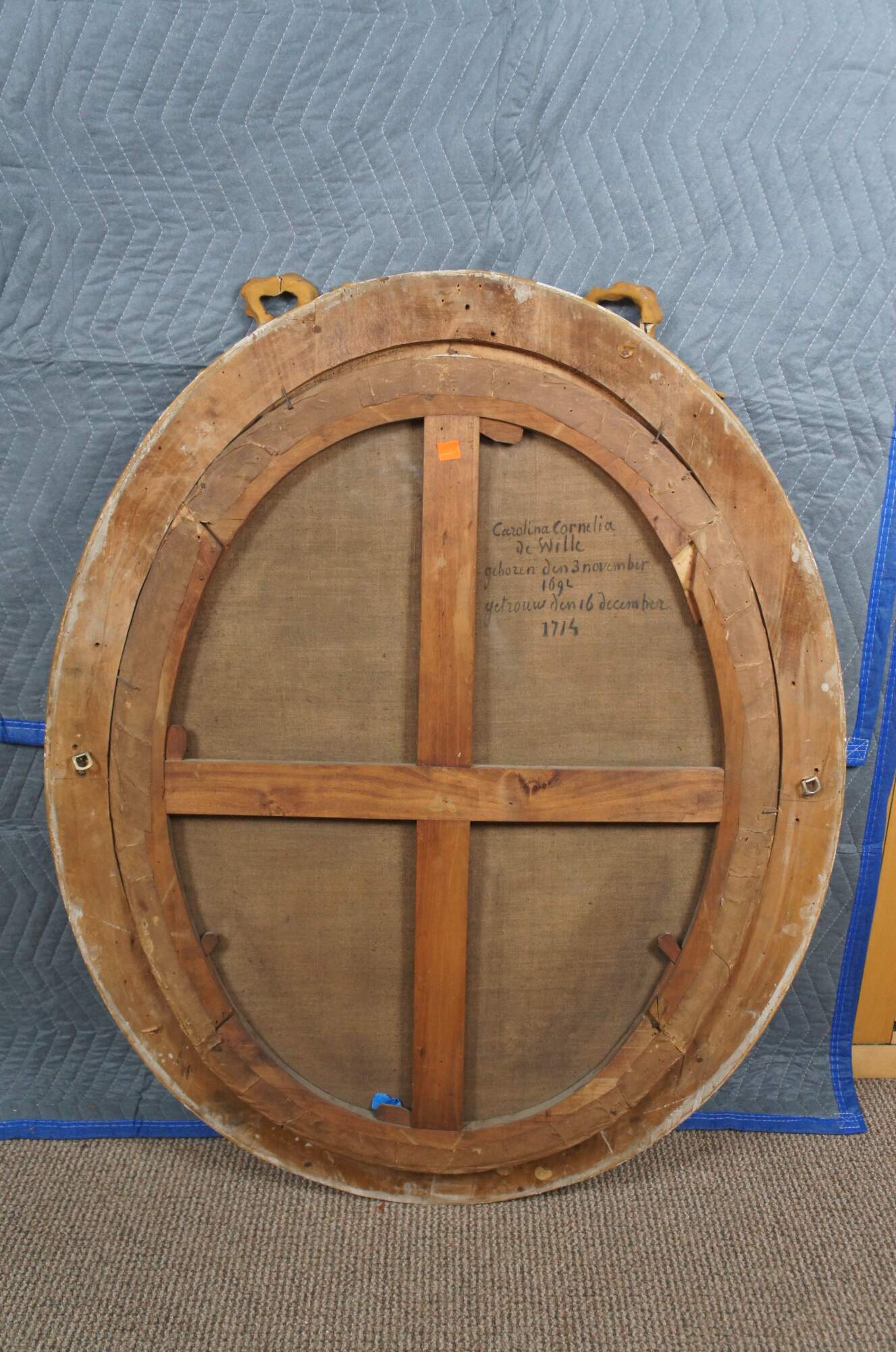 An impressive early 18th century dutch school portrait of Carolina Cornelia De Wille, circa 1714. The oval oil painting is on canvas and features a pleasant seated Carolina painted before her marriage wearing a blueish velvet jeweled dress with crossed arms. Framed in an oval wood gold finished neoclassical frame with ribbon design along the top. Labeled and dated along the backside in Dutch.