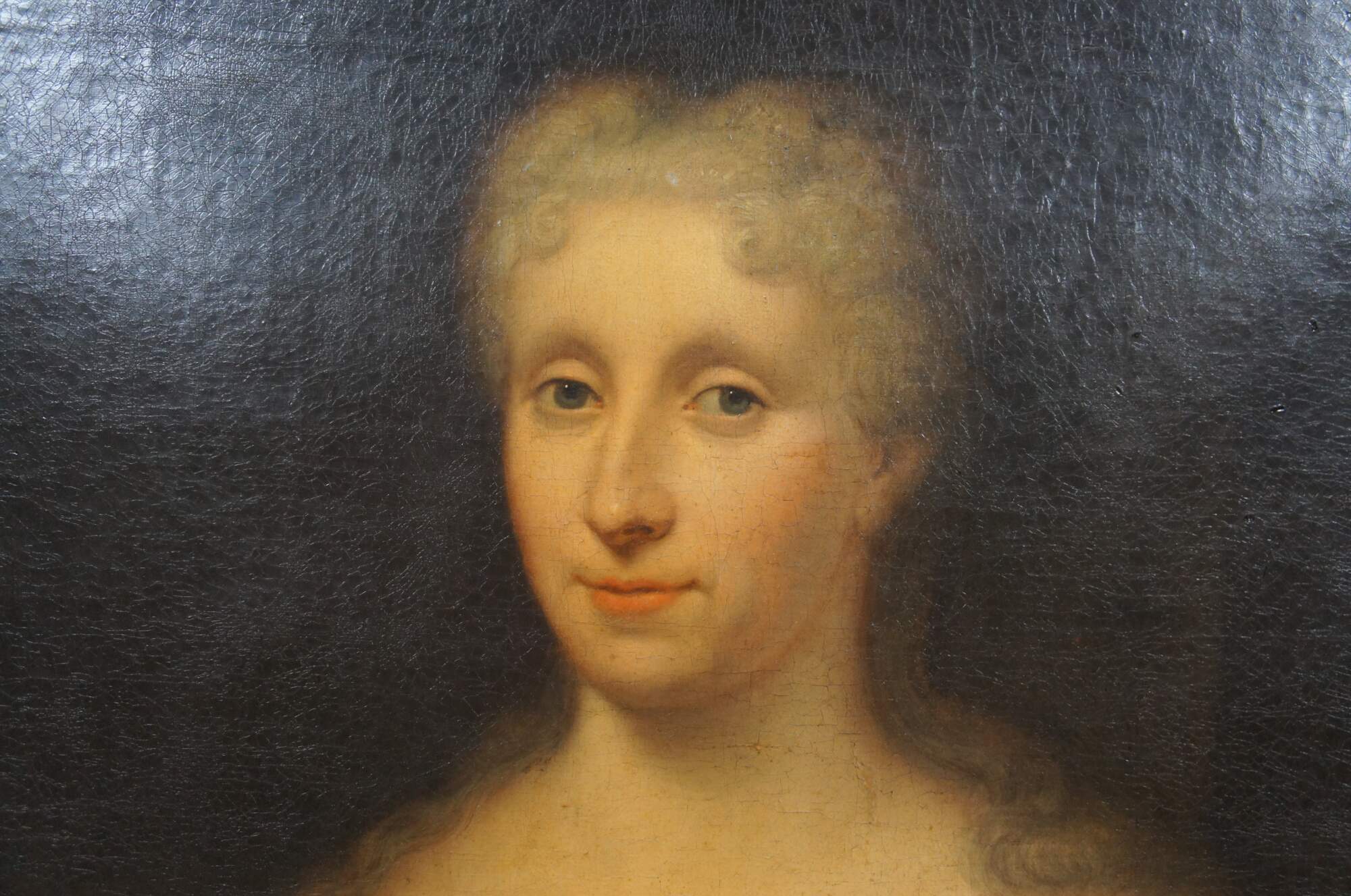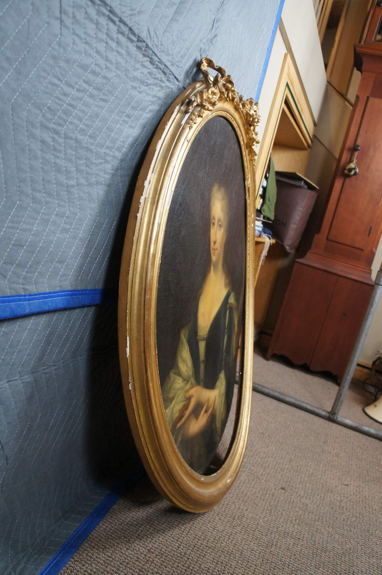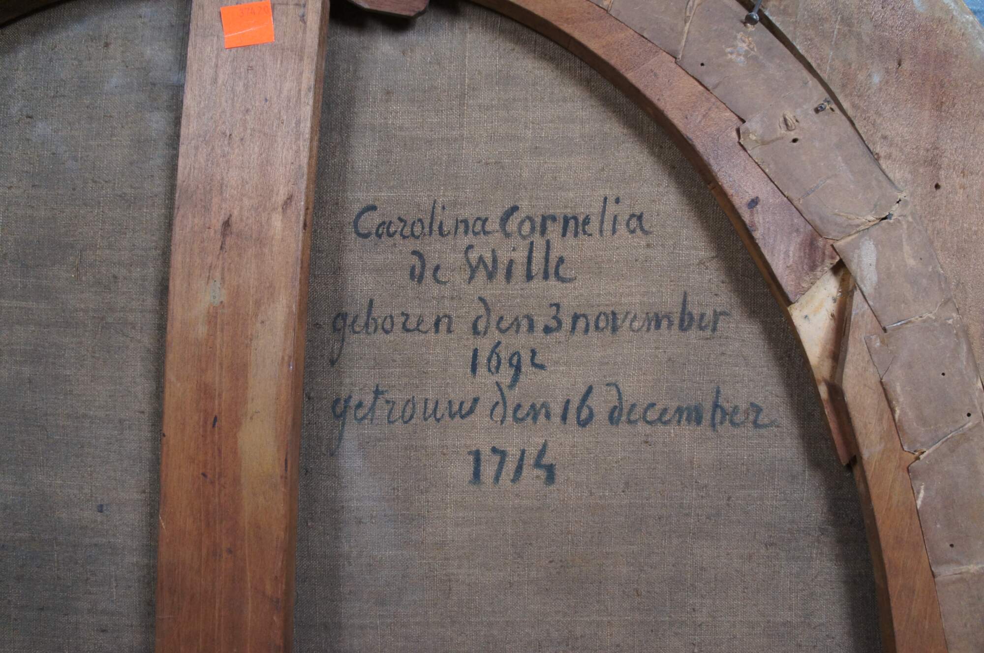 An impressive early 18th century dutch school portrait of Carolina Cornelia De Wille, circa 1714. The oval oil painting is on canvas and features a pleasant seated Carolina painted before her marriage wearing a blueish velvet jeweled dress with crossed arms. Framed in an oval wood gold finished neoclassical frame with ribbon design along the top. Labeled and dated along the backside in Dutch.