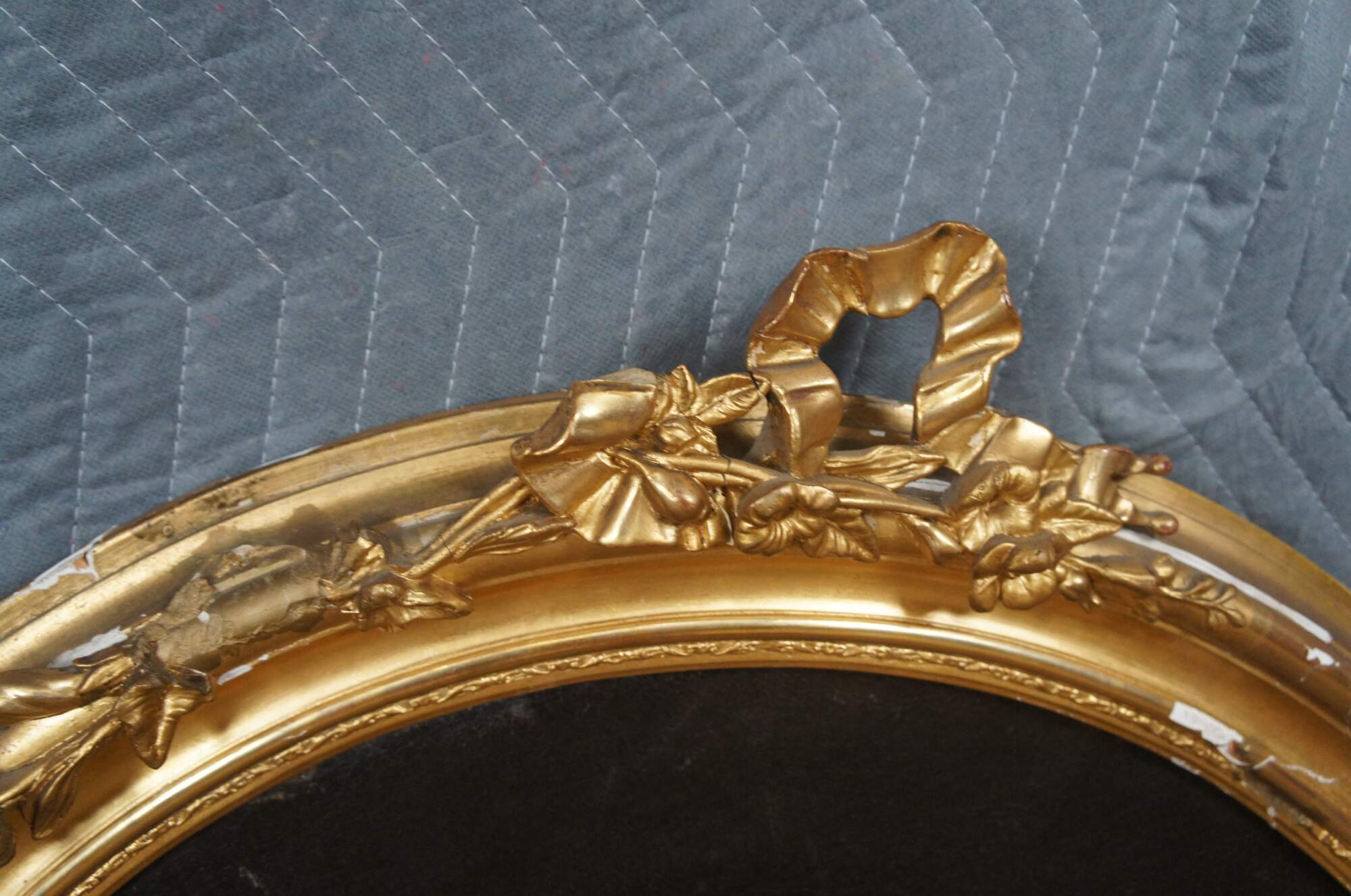 Good antique condition with general use related wear. The frame is heavily bowed with wear the gilding and a split to one of the ribboned accents along the top. The canvas is in mostly good cood condition with light crazing. Some heavier crazing by the arms and a few blemishes.