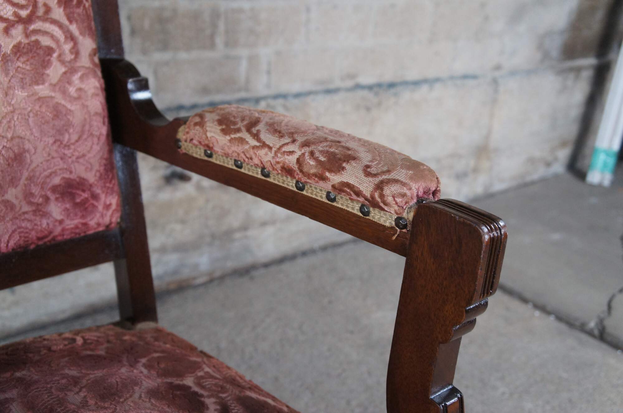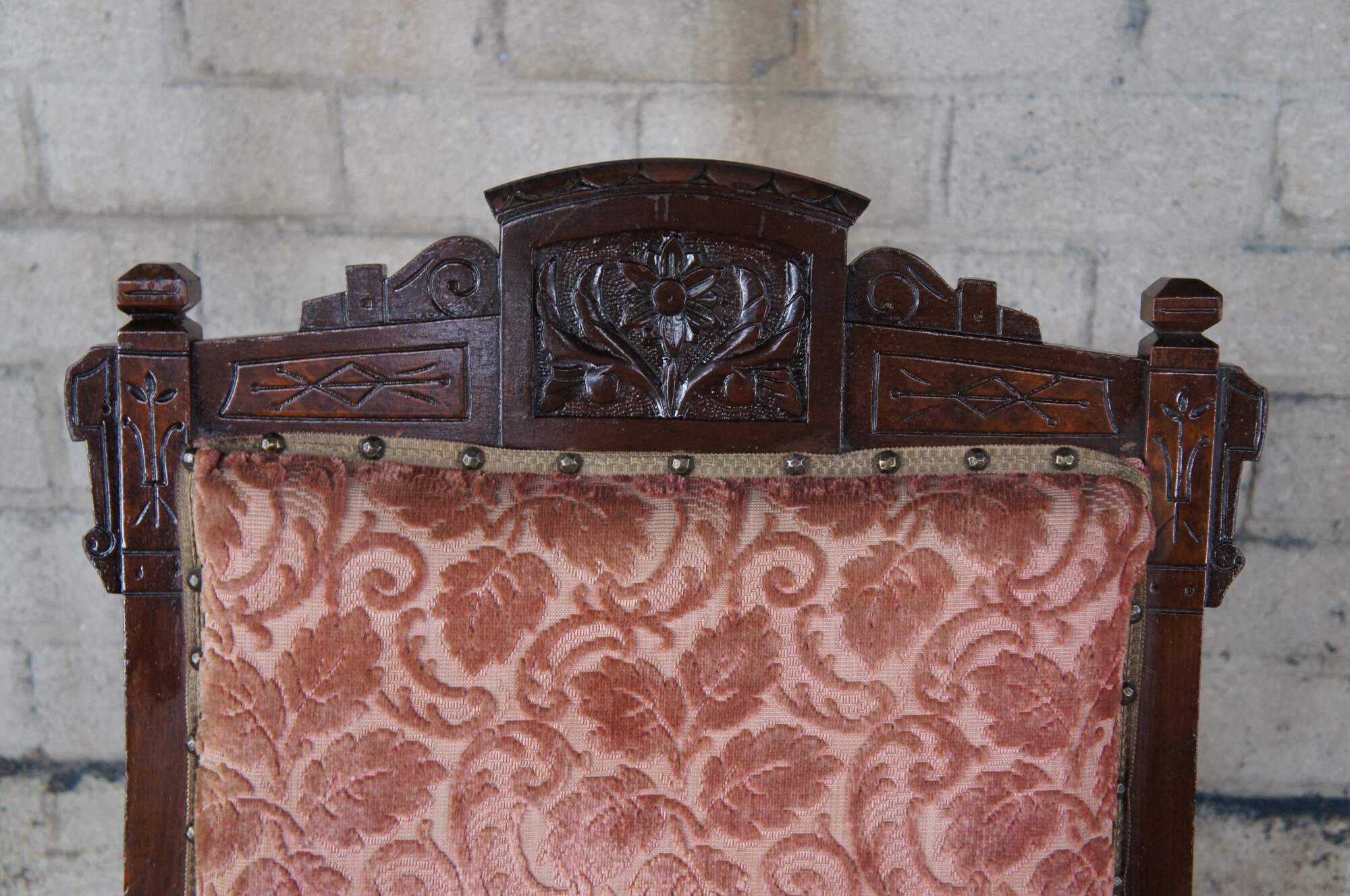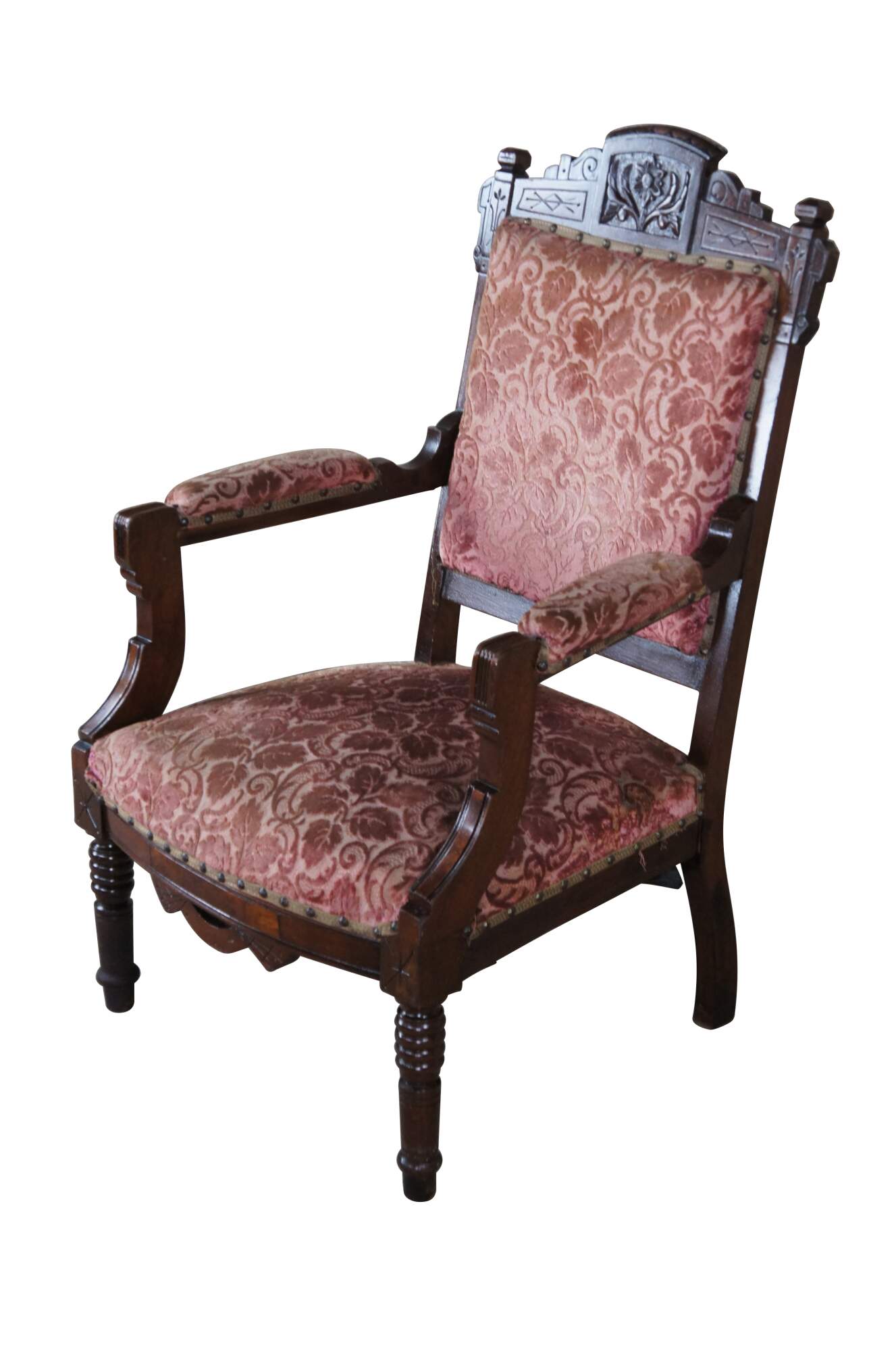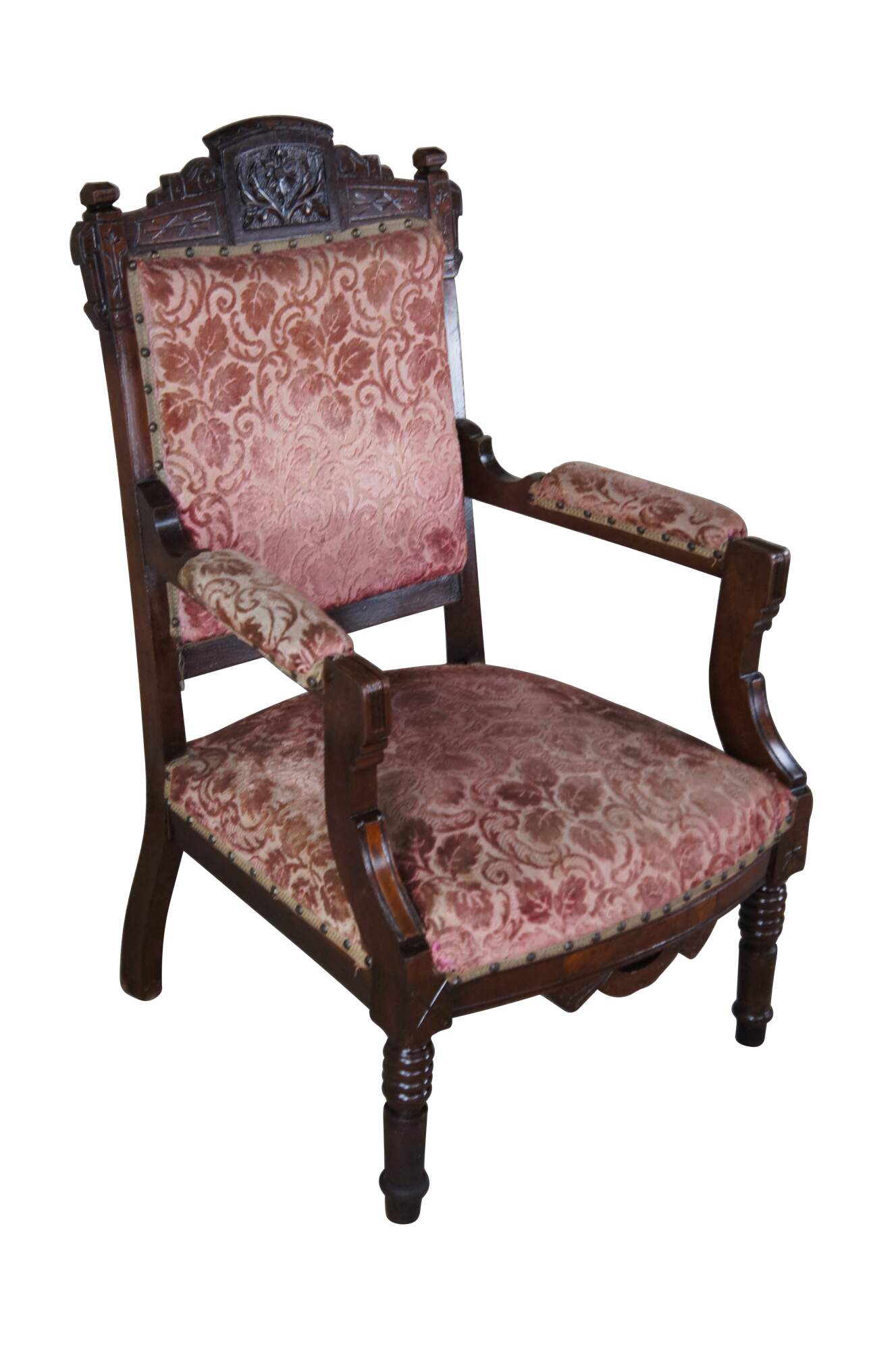A lovely Victorian arm chair, circa last quarter 20th century. Features classic Eastlake styling with a scrolled and carved back, padded downswept arms, burled panels and turned ribbed legs. The chair is upholstered in reddish raised velvet leaf motif.