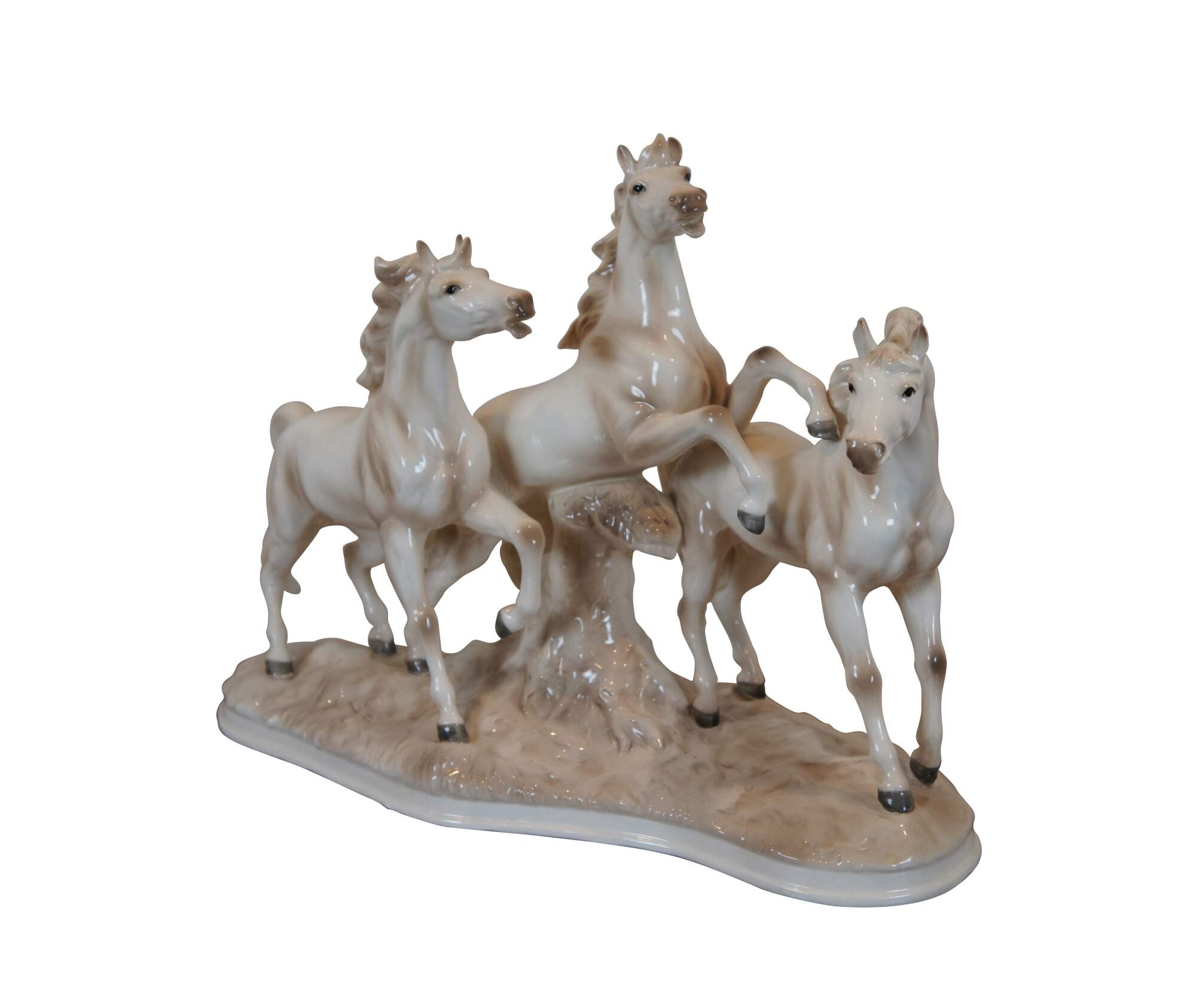 Large vintage porcelain sculpture showing a group of three horses / stallions running together, marked J. Stewarle on the bask side. Base shows the remains of the black triangular Czech Republic / Czechoslovakia stamp, attributed to Royal Dux, post WWII.