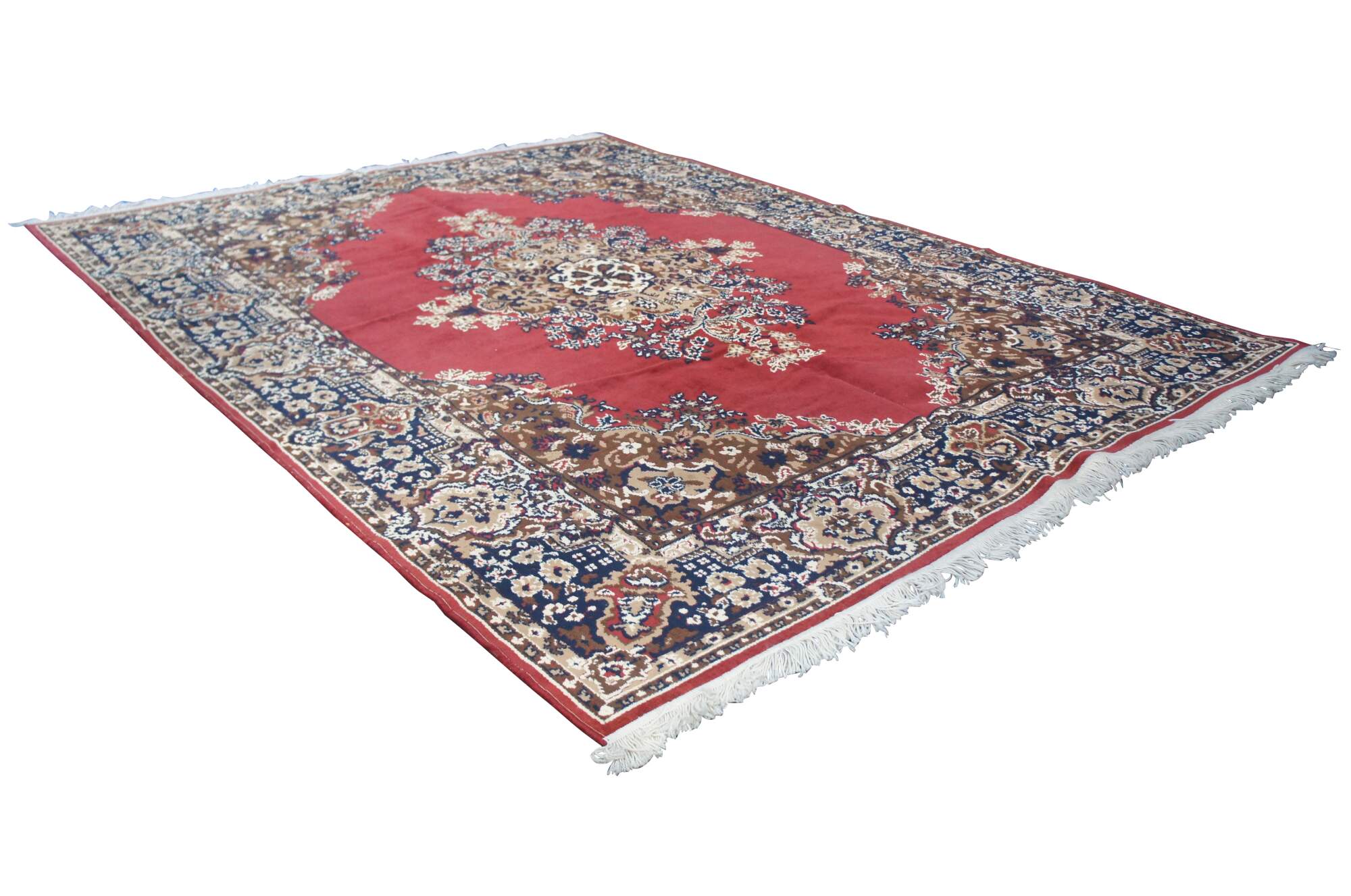 Vintage Beaulieu of American Wolfin area rug or carpet. Made of poly-yarn featuring a floral all over design with red field and central medallion. Reds, Tans, Blues, Creme, Browns.