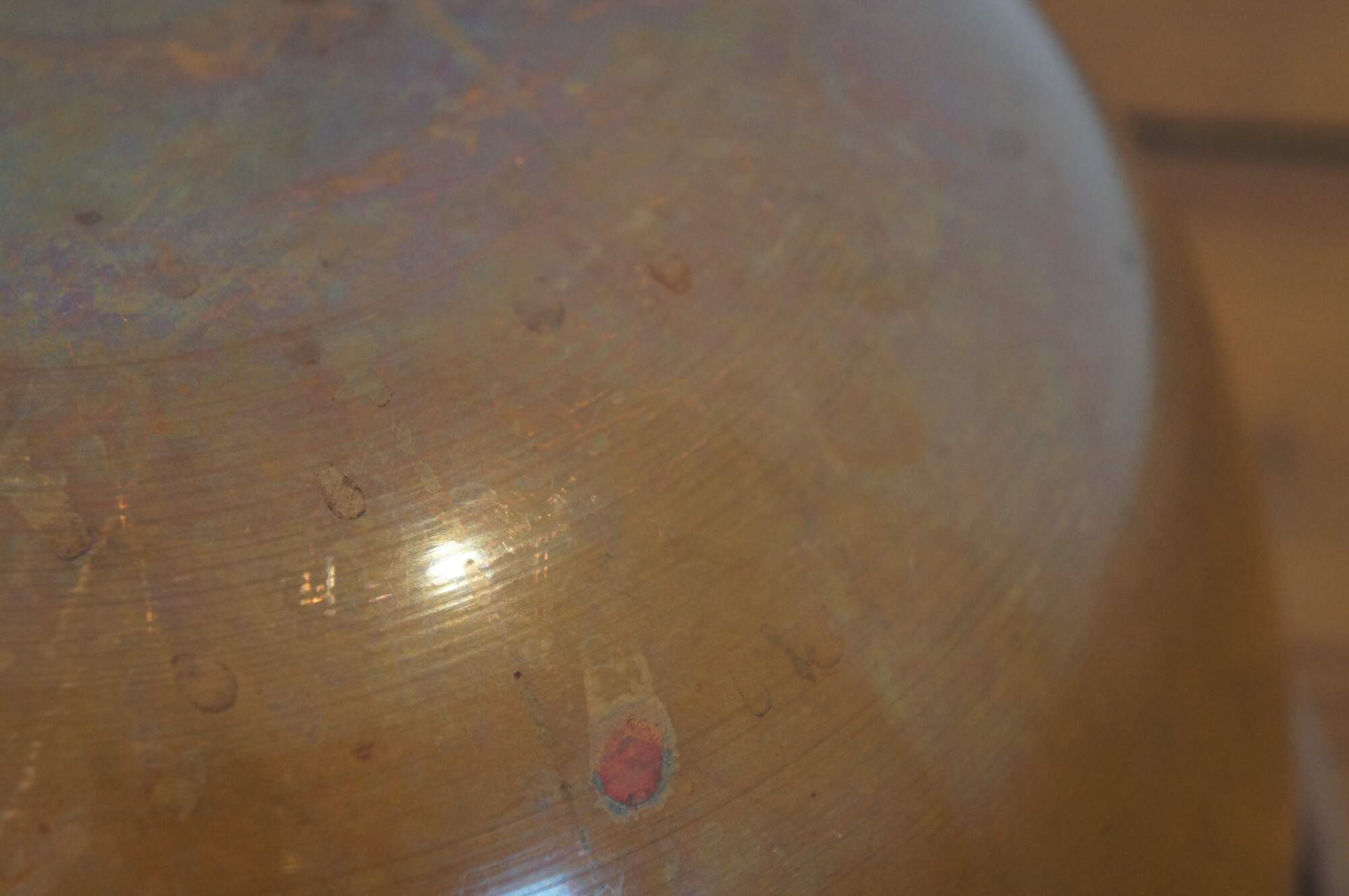 Vintage spun copper mixing bowl with rolled edge, rounded bottom / base and fixed brass hanging ring.