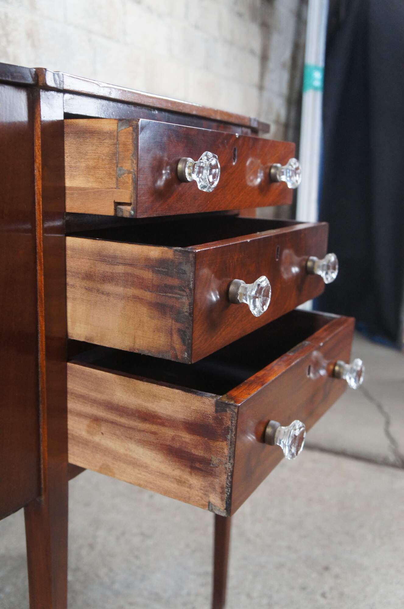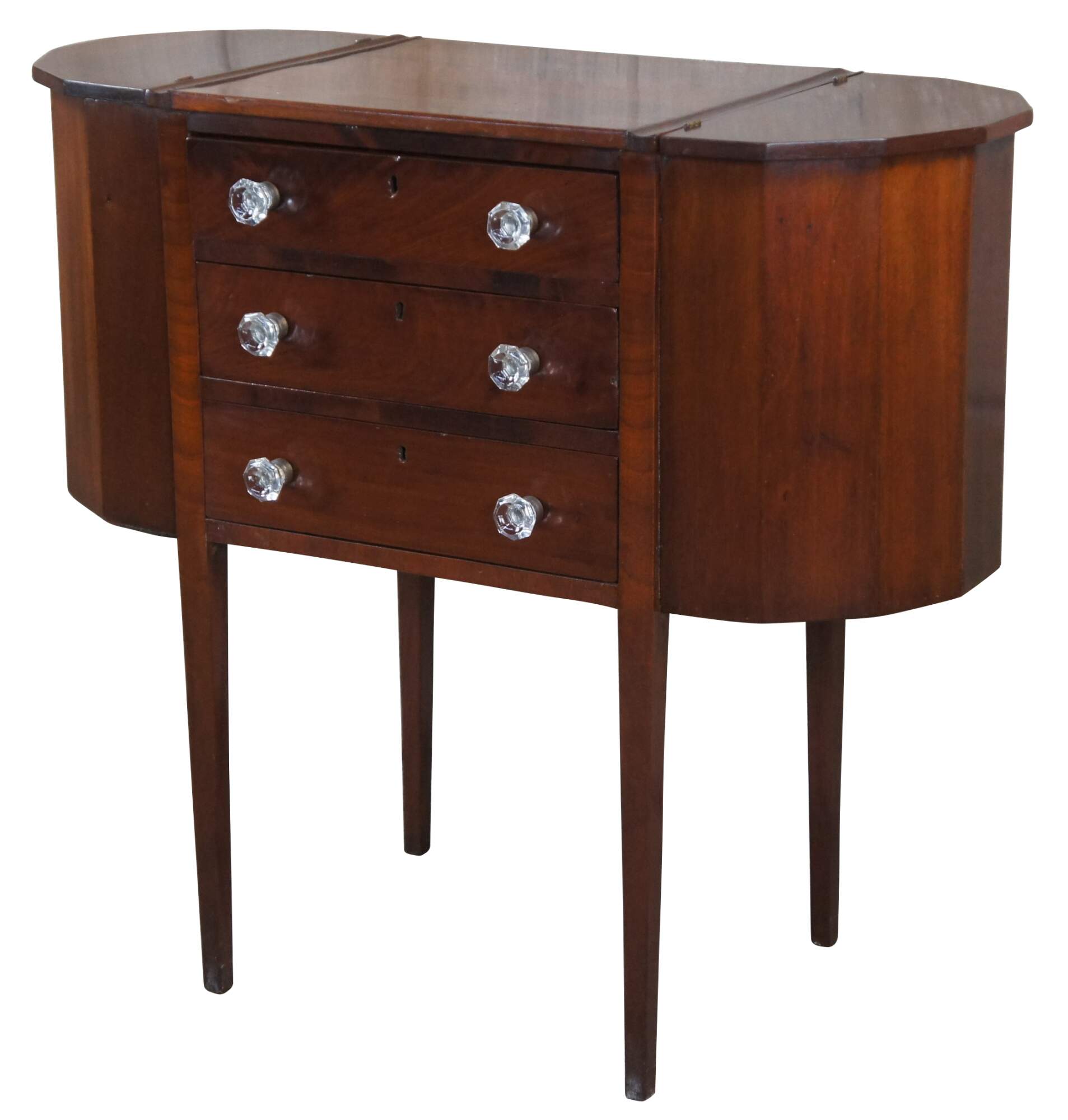 An eye catching turn of the 20th century Martha Washington sewing table. Made from mahogany with three dovetailed drawers having crotched veneer fronts and faceted glass pulls. Features demilune hinged side pockets and square tapered legs.