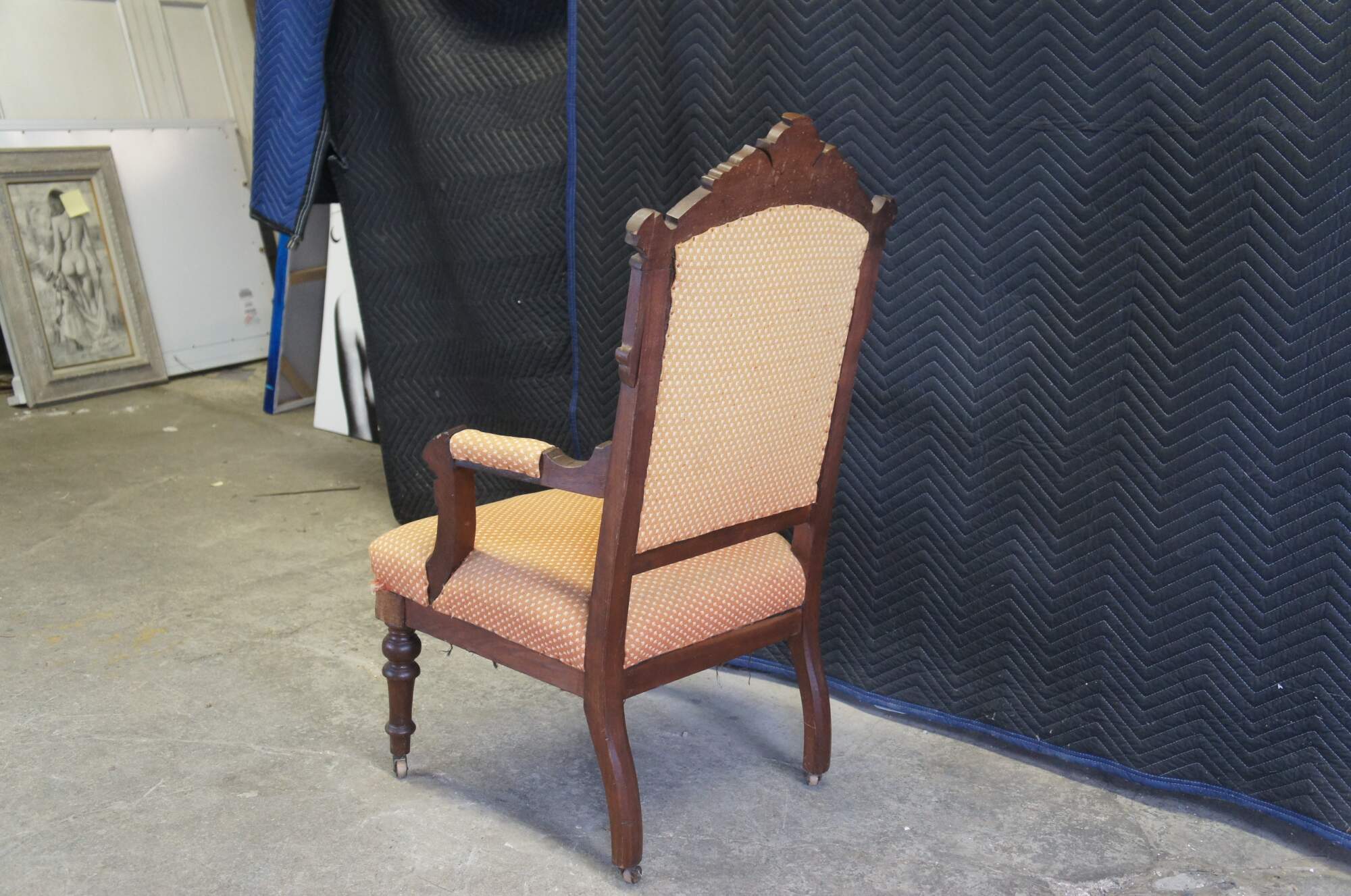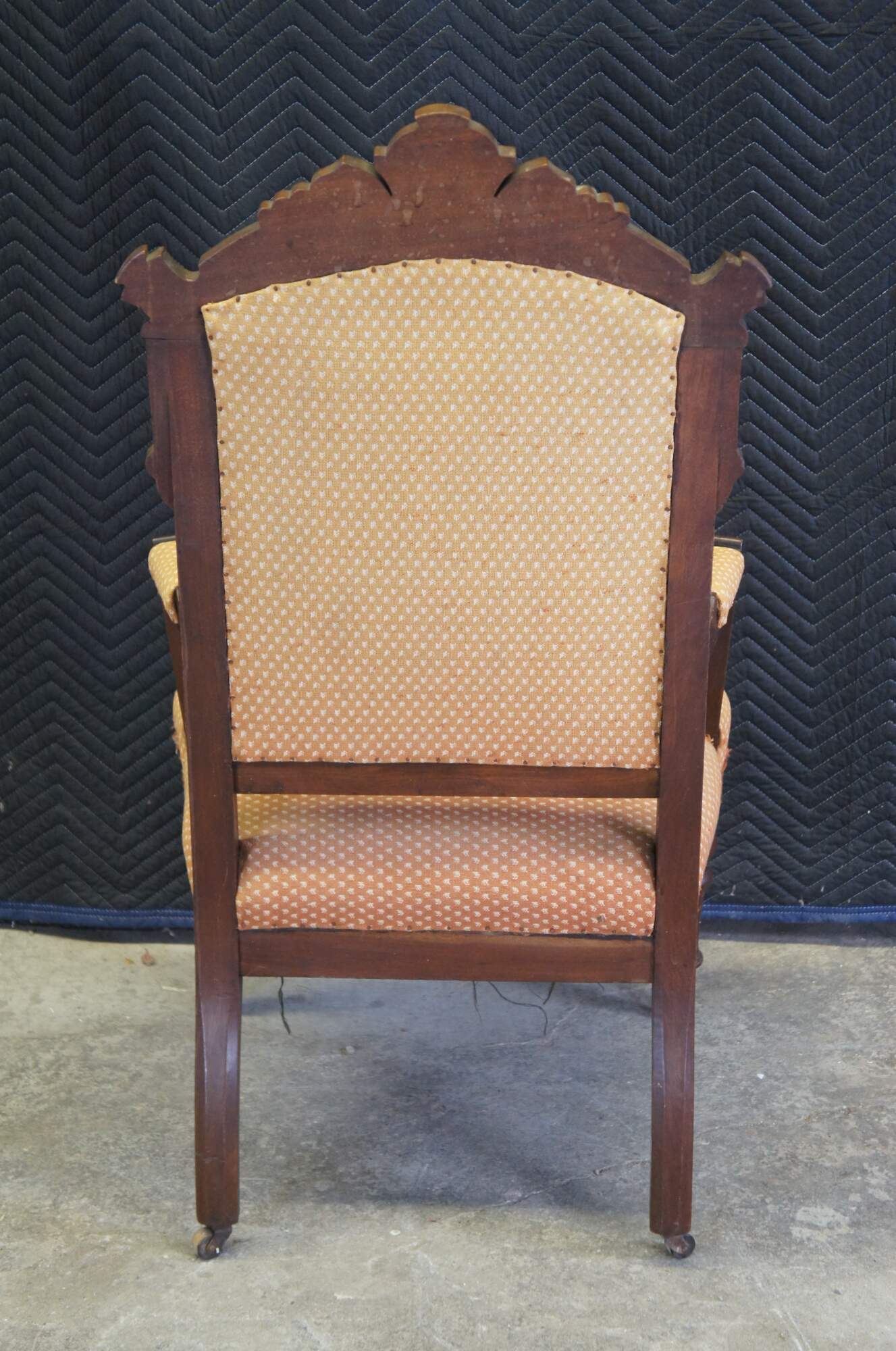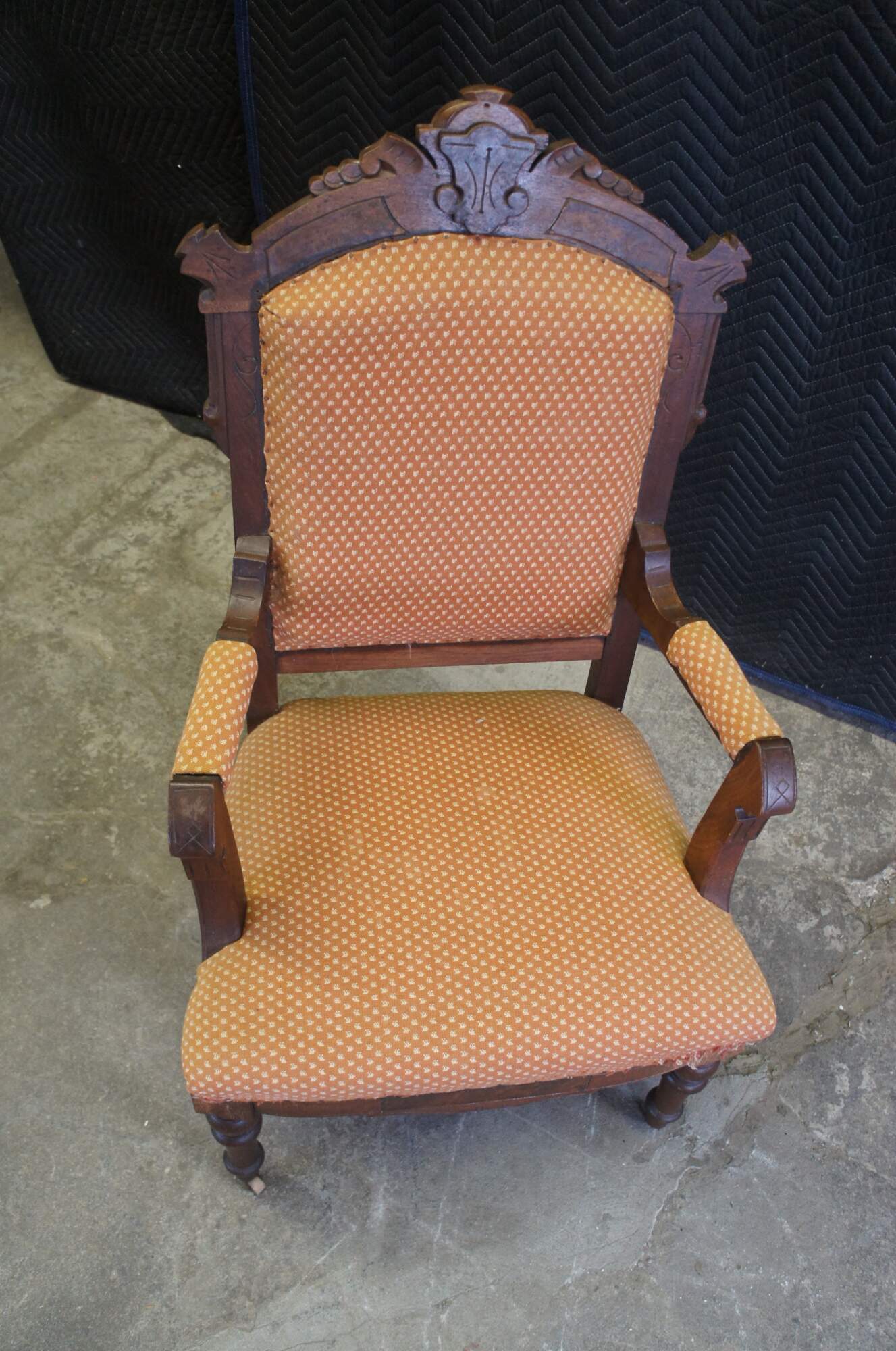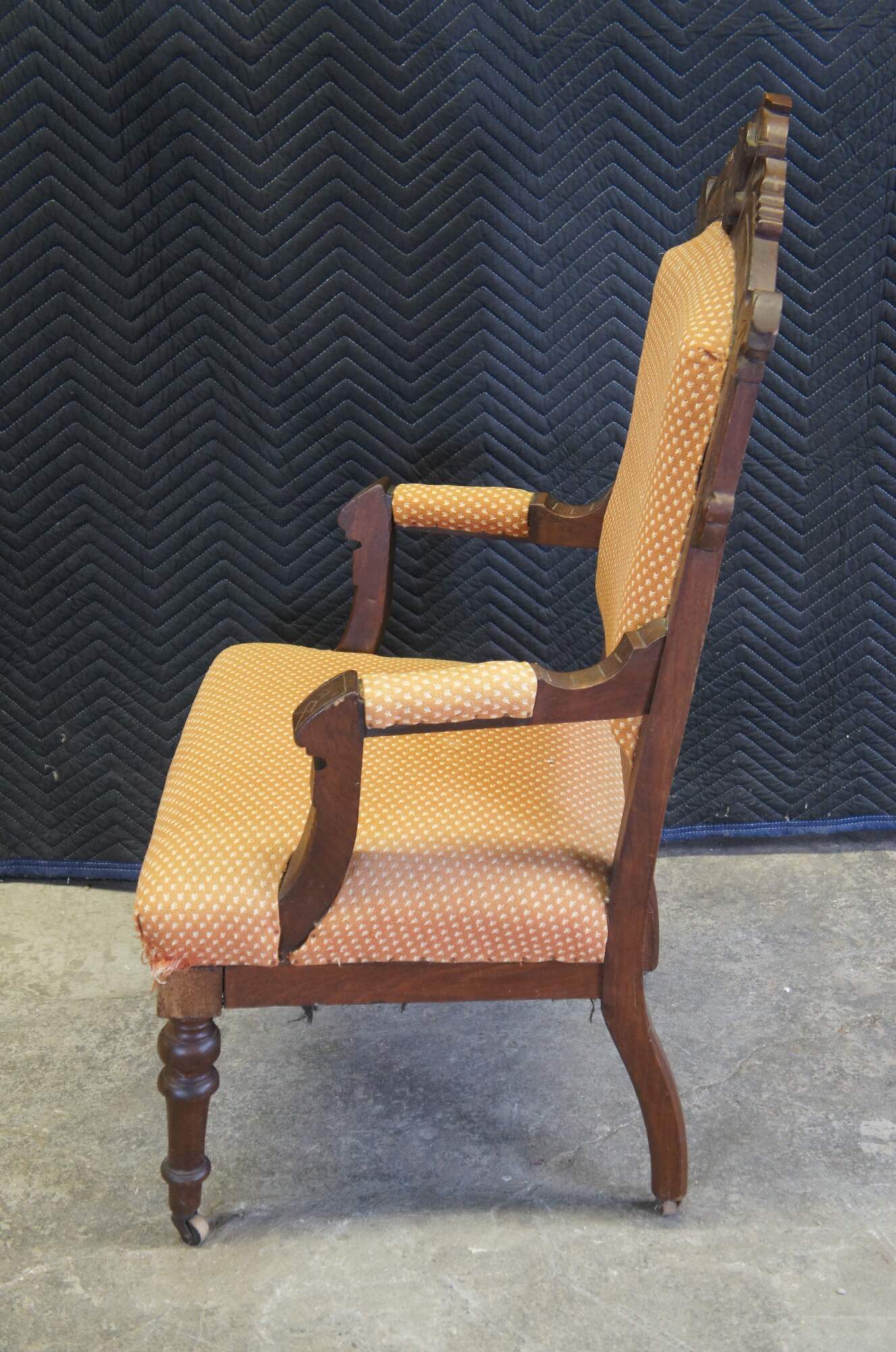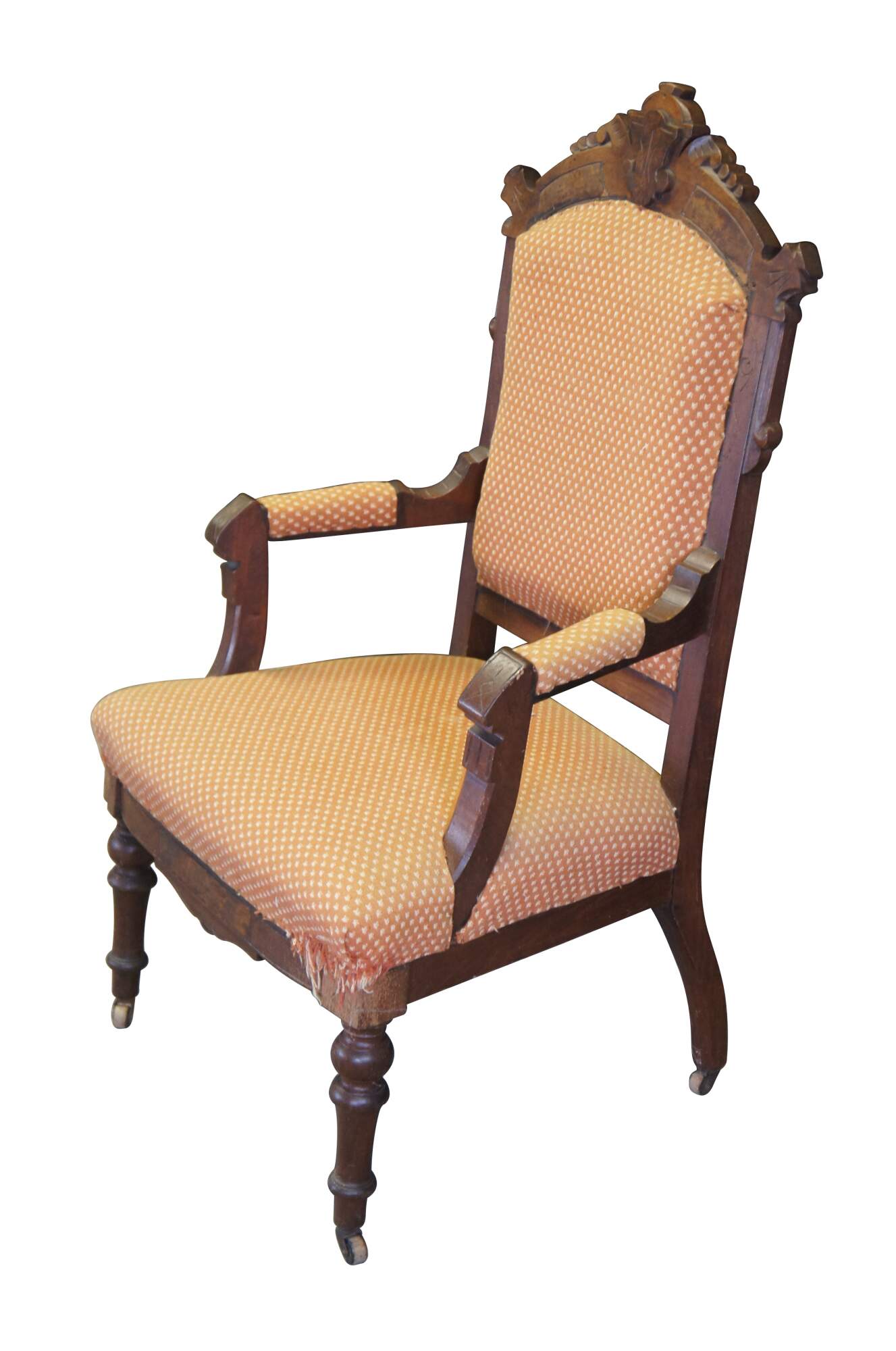 Antique Victorian parlor armchair. Made of walnut featuring Eastlake styling with carved frame, fauteuil arms and turned legs with castors.