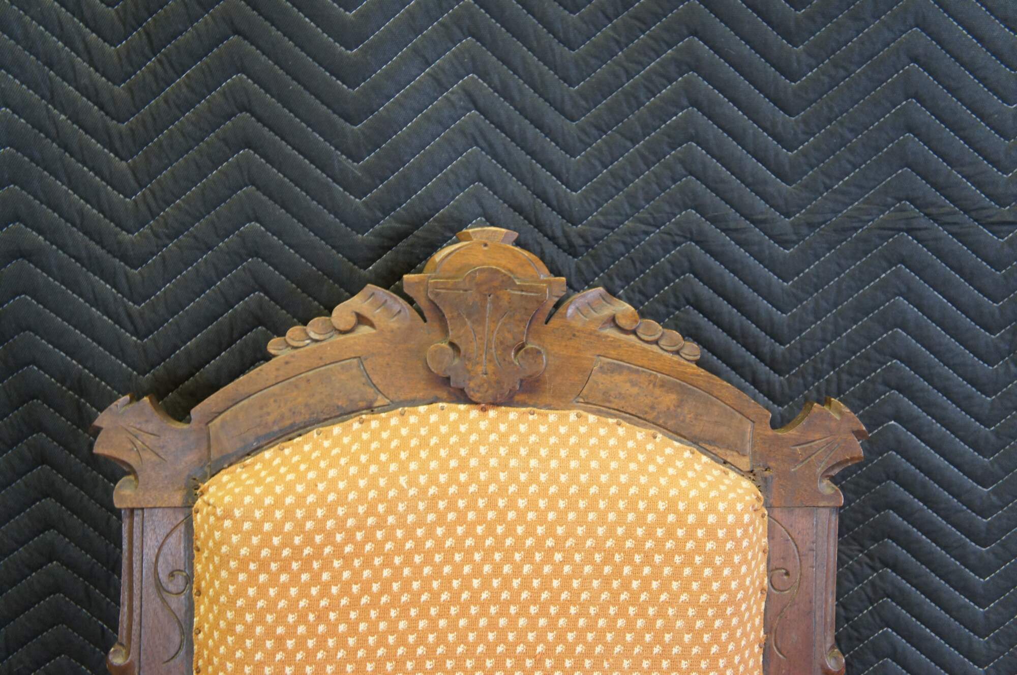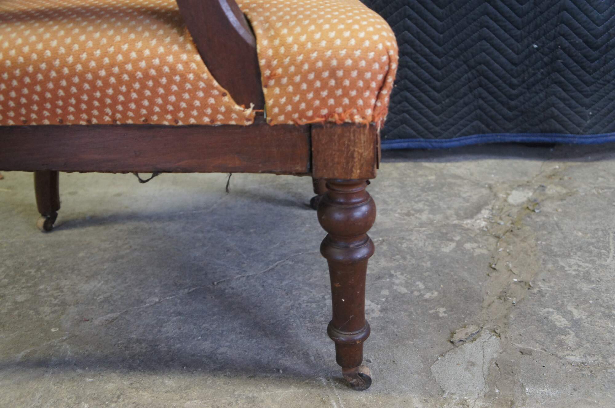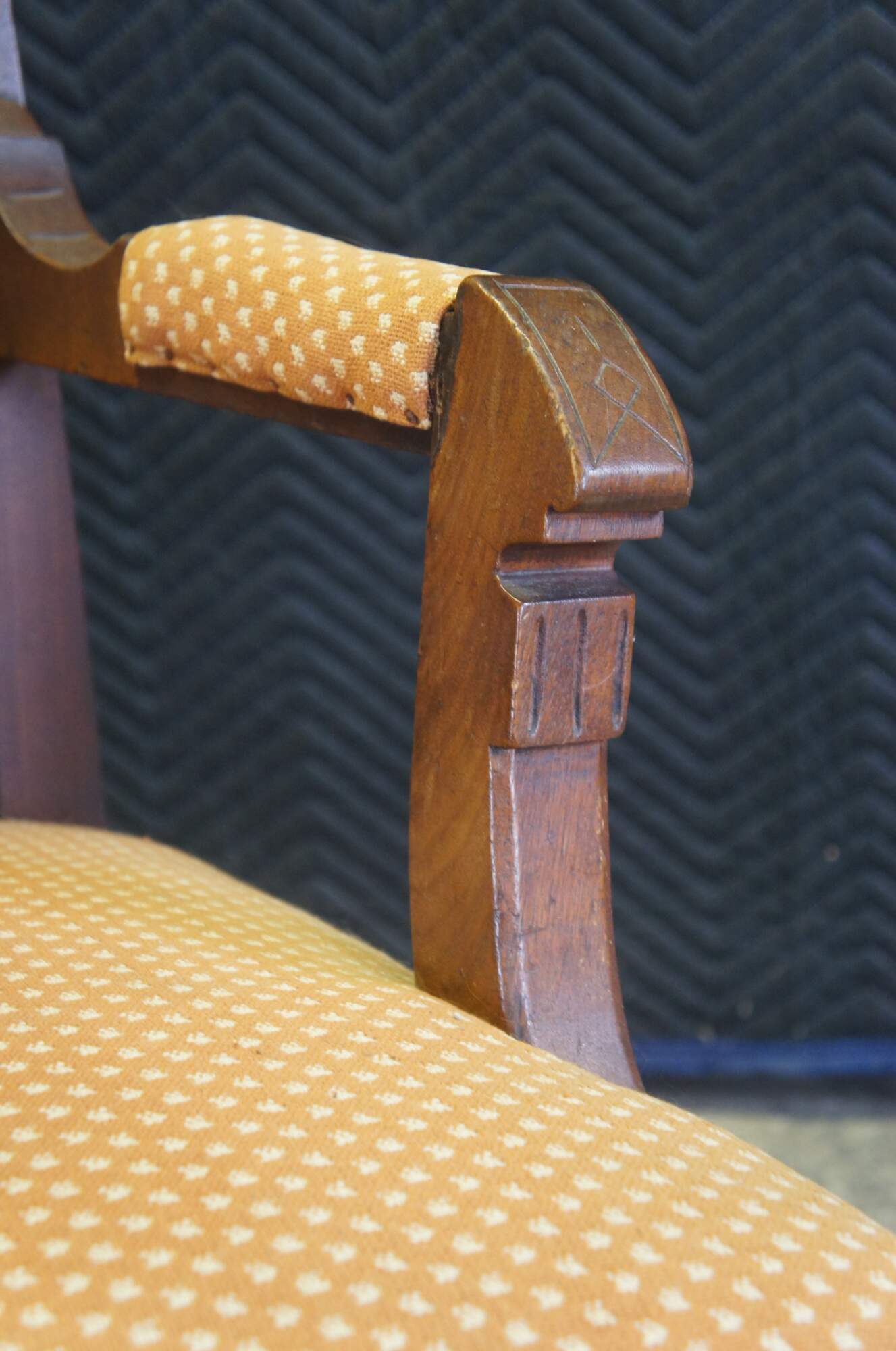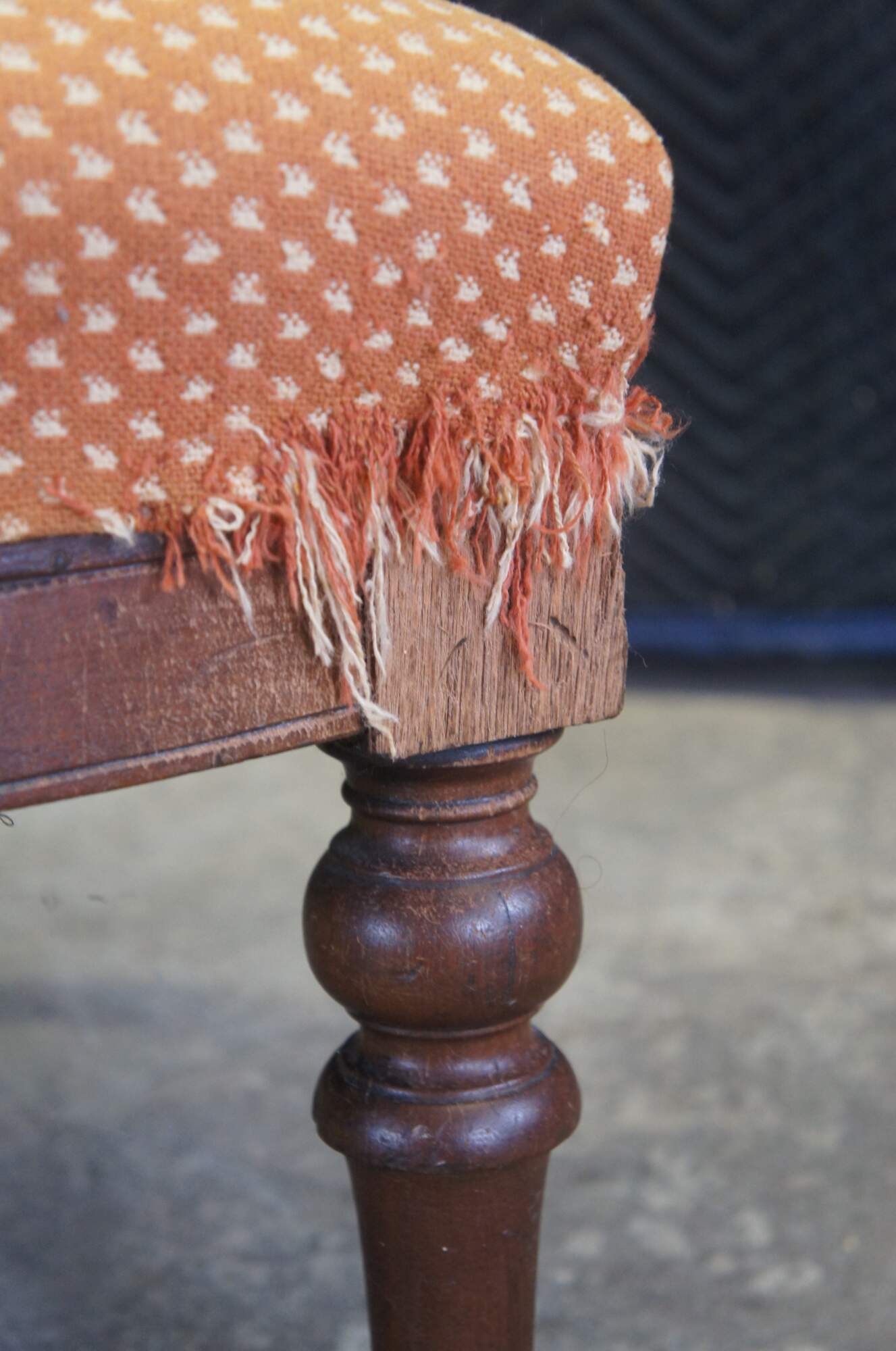 Fair condition, wear and distressing, fraying / tearing to fabric, finish loss, veneer loss, worm holes, separation at front leg.