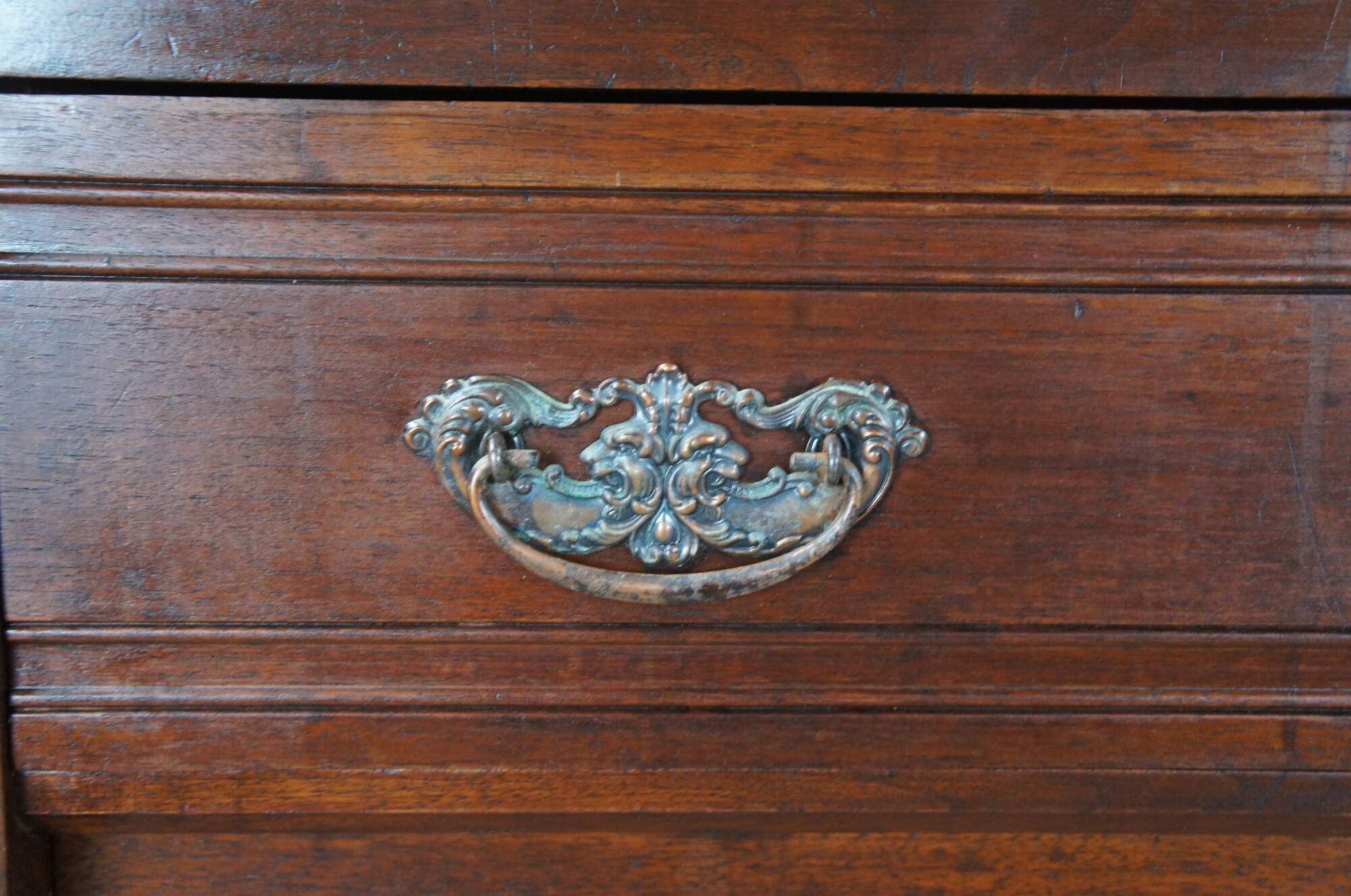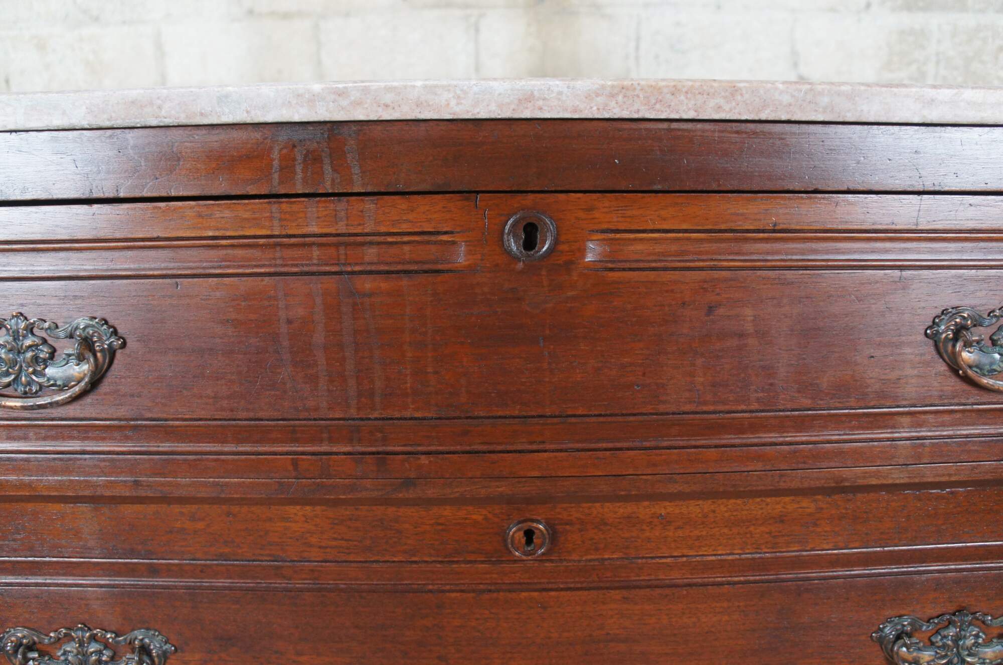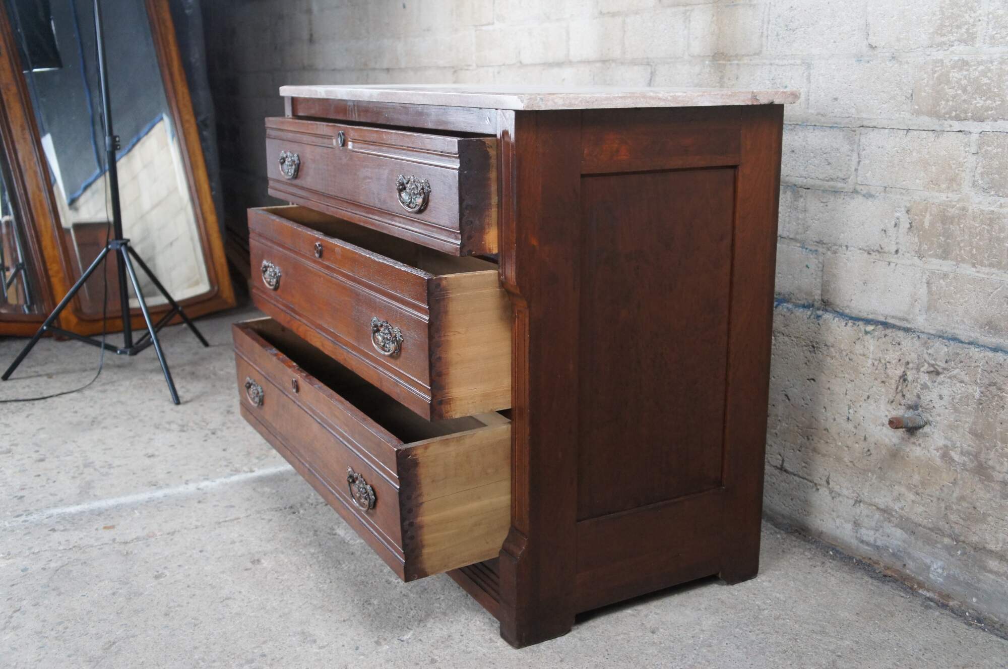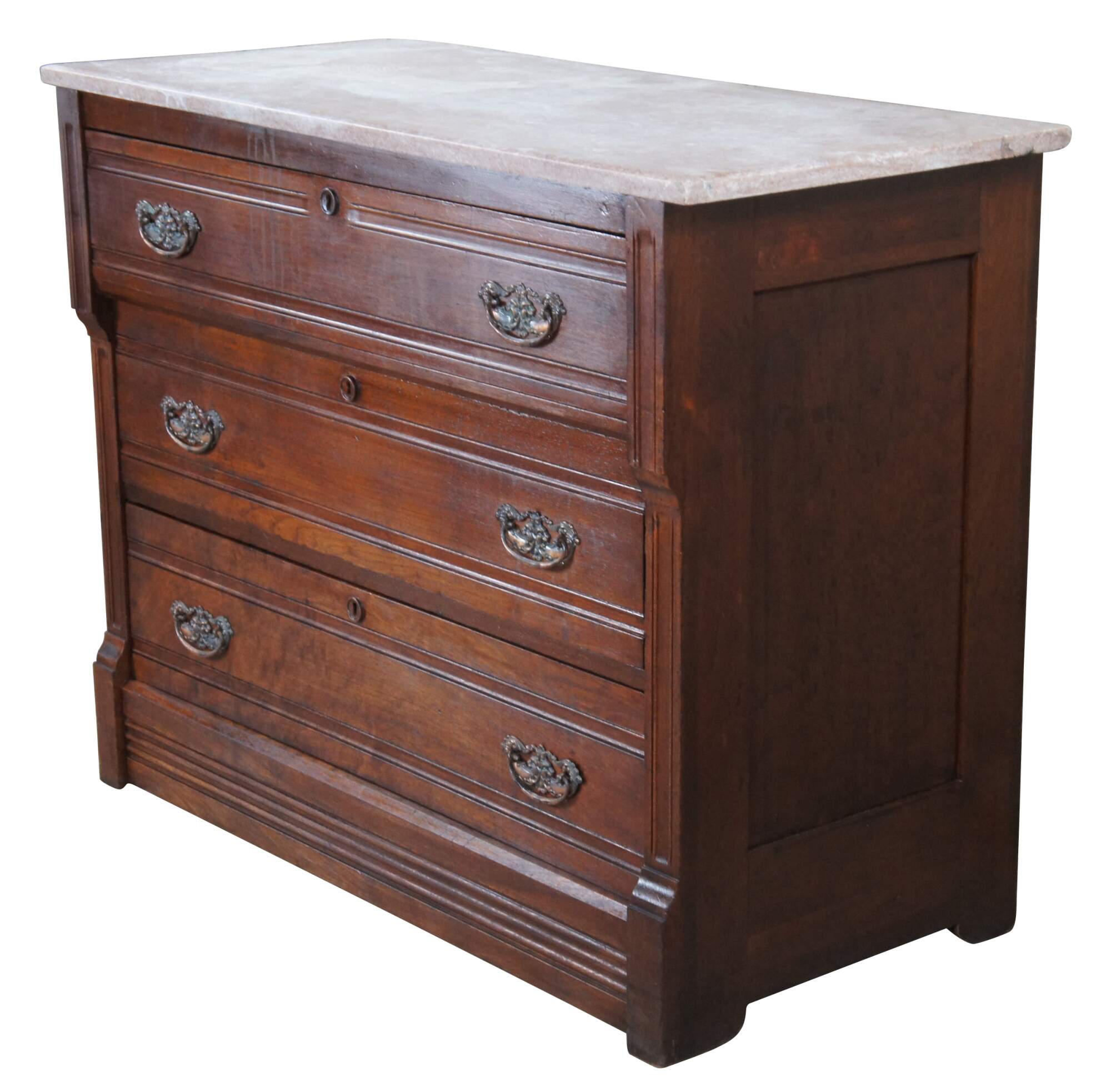 A beautiful American Victorian era dresser, circa 1880s. Made from walnut with three dovetailed drawers, stepped stiles and a marble top. The drawers are dovetailed via the Knapp Joint. Features ornate metal bale pulls featuring apposing lions and ornate floral details