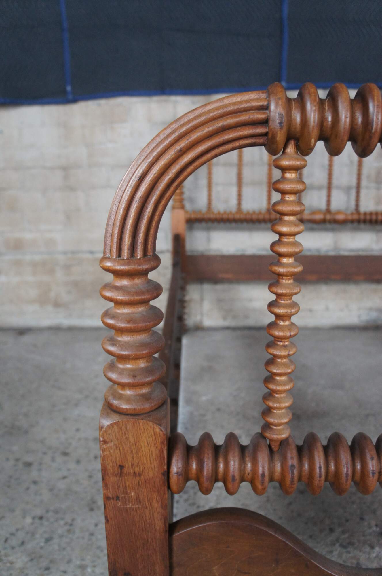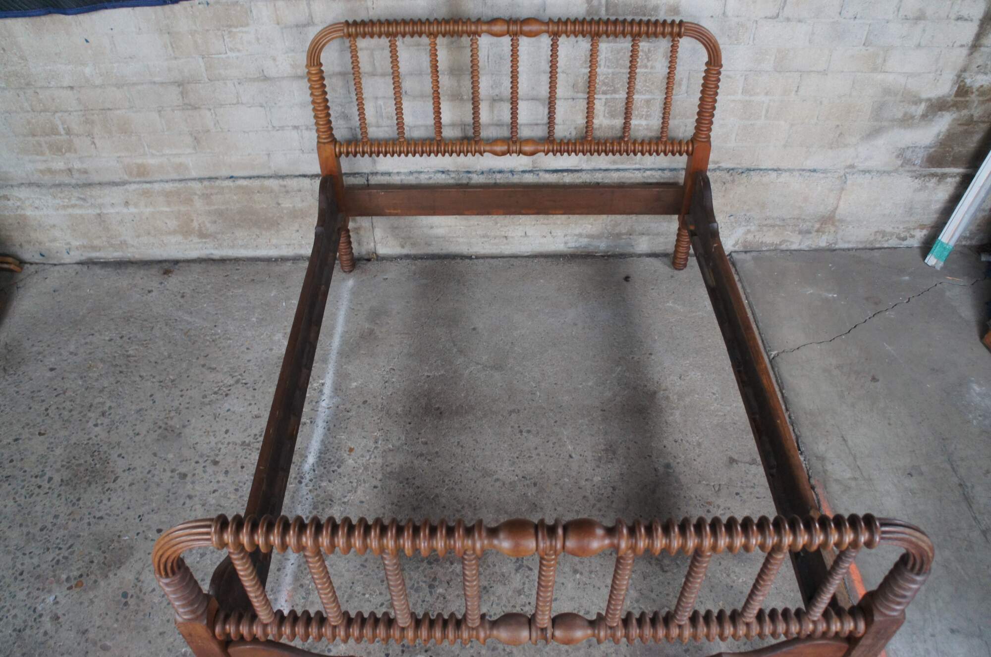 An antique Jenny Lind spool bed. Made from walnut with ribbed and reeded posts. Custom sized interior (mattress 55.5" x 72"). Could be extended to accommodate a full.