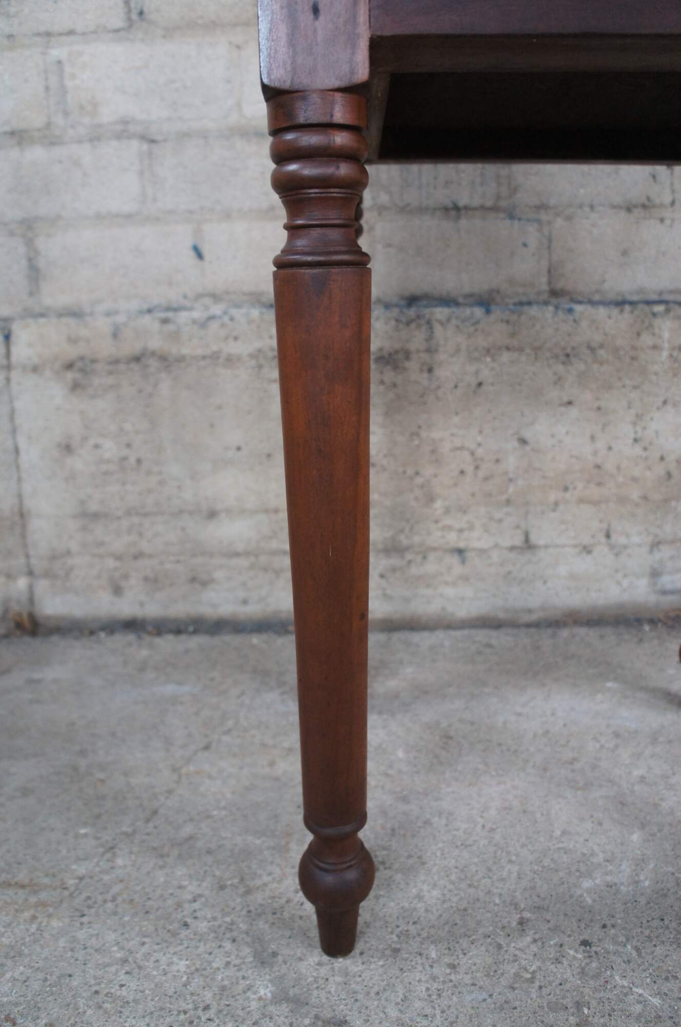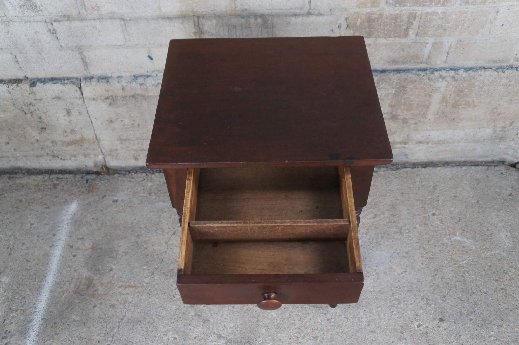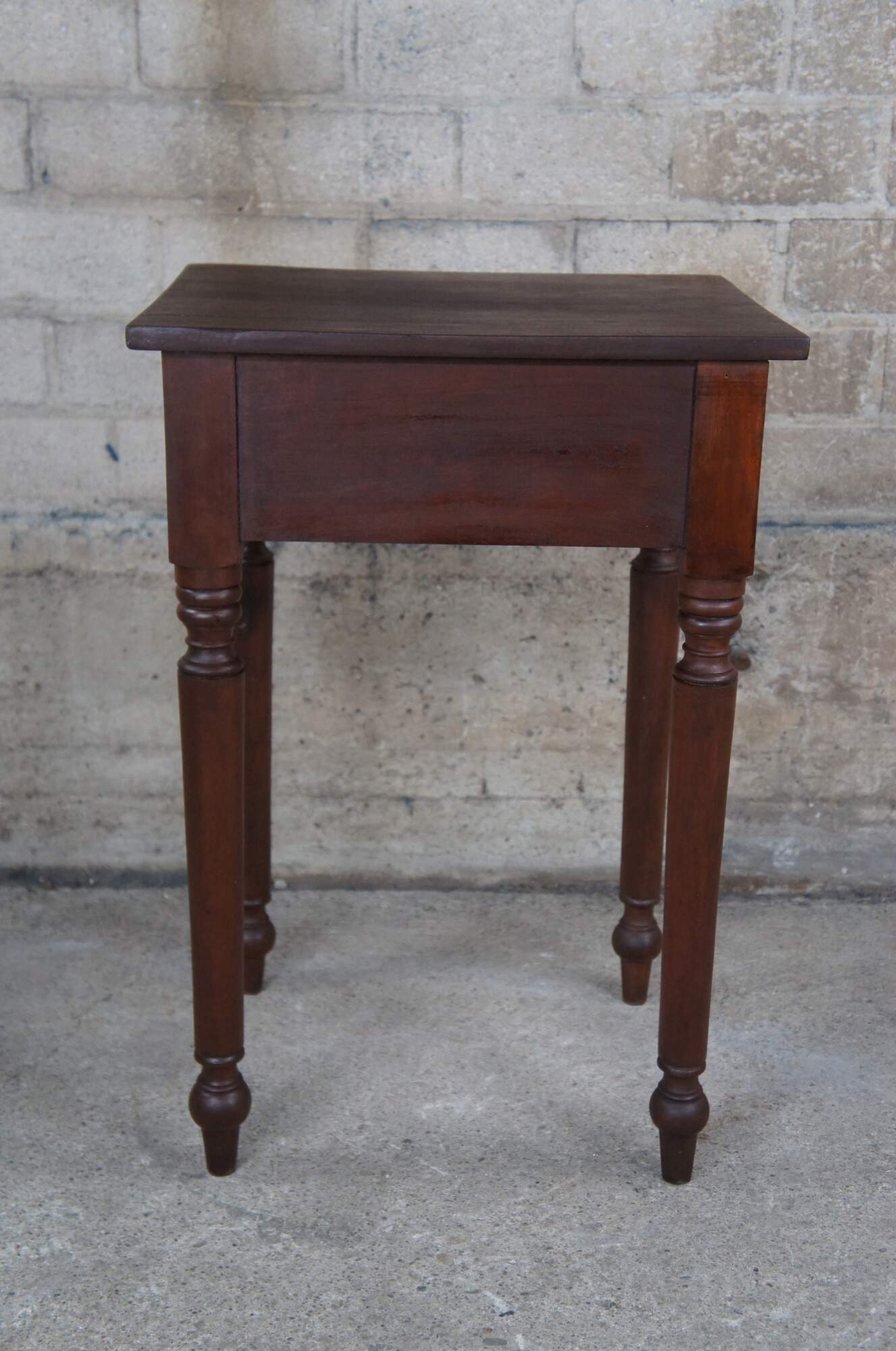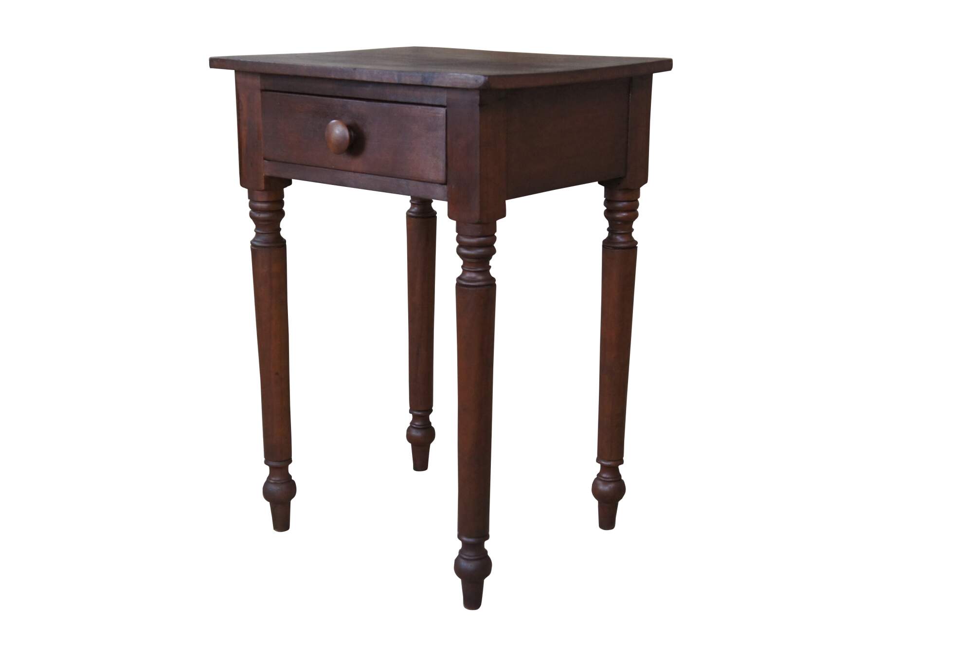 Early American walnut side table with drawer. Features turned ribbed legs leading to arrow foot and hand dovetailed drawer with wooden knob. The interior drawer has a divided drawer.