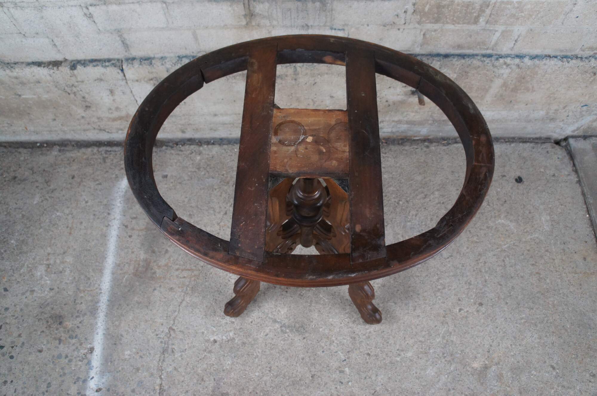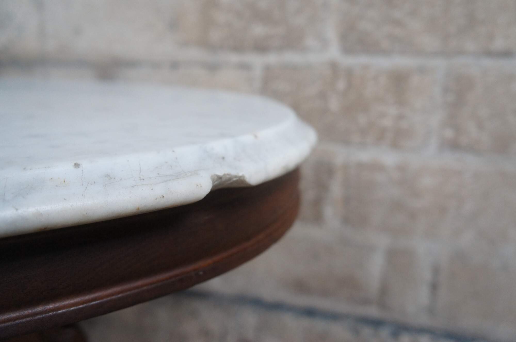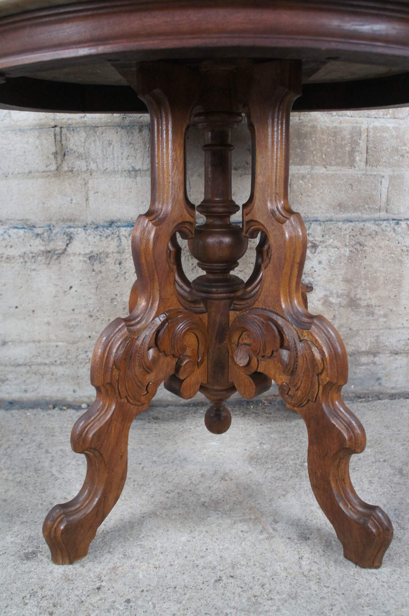 Antique Victorian Eastlake parlor table, circa 1880s. Made from walnut with an oval white marble top. Base features a turned center support surrounded by four serpentine carved legs with floral applied carvings and round down finial.