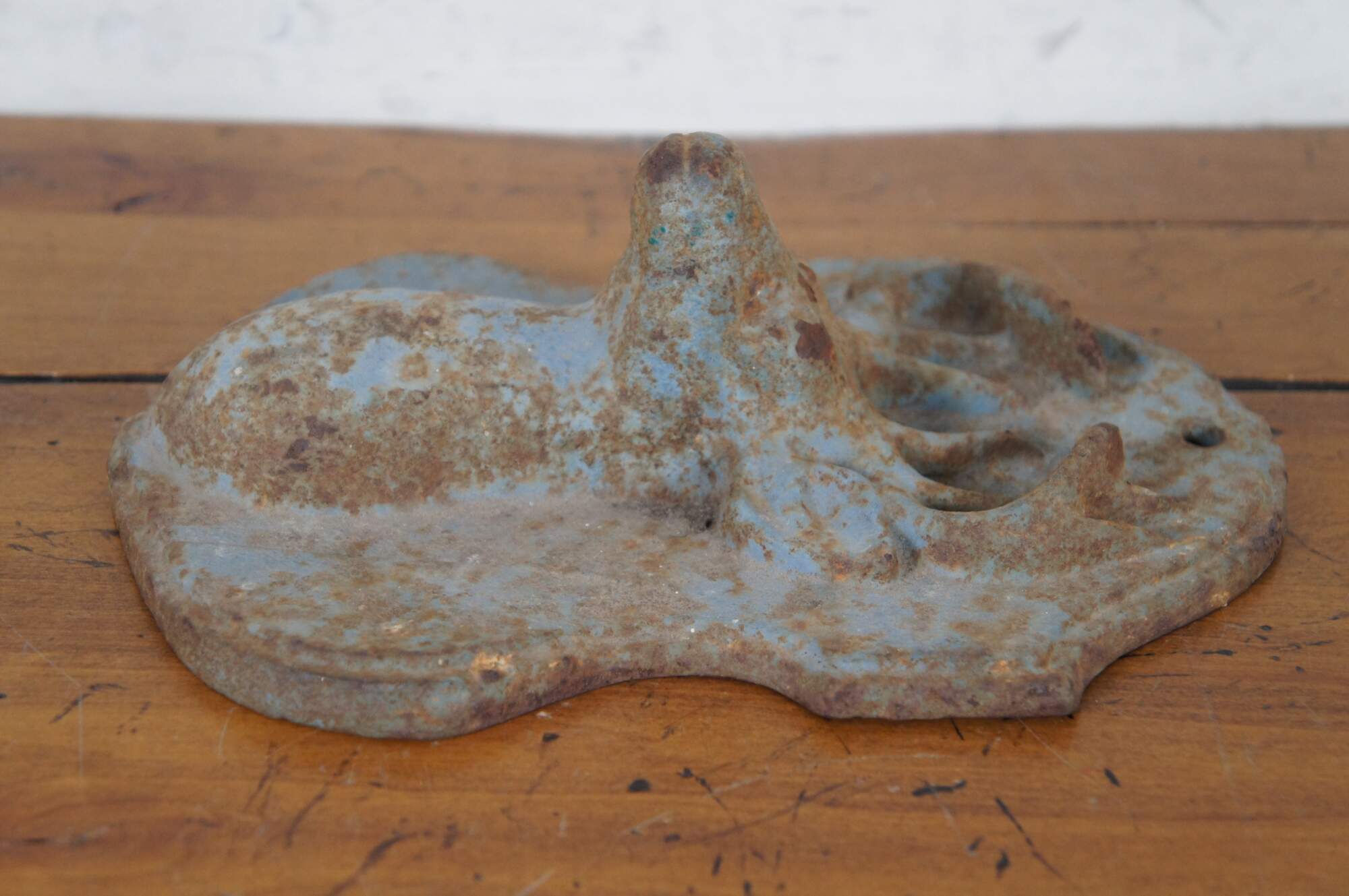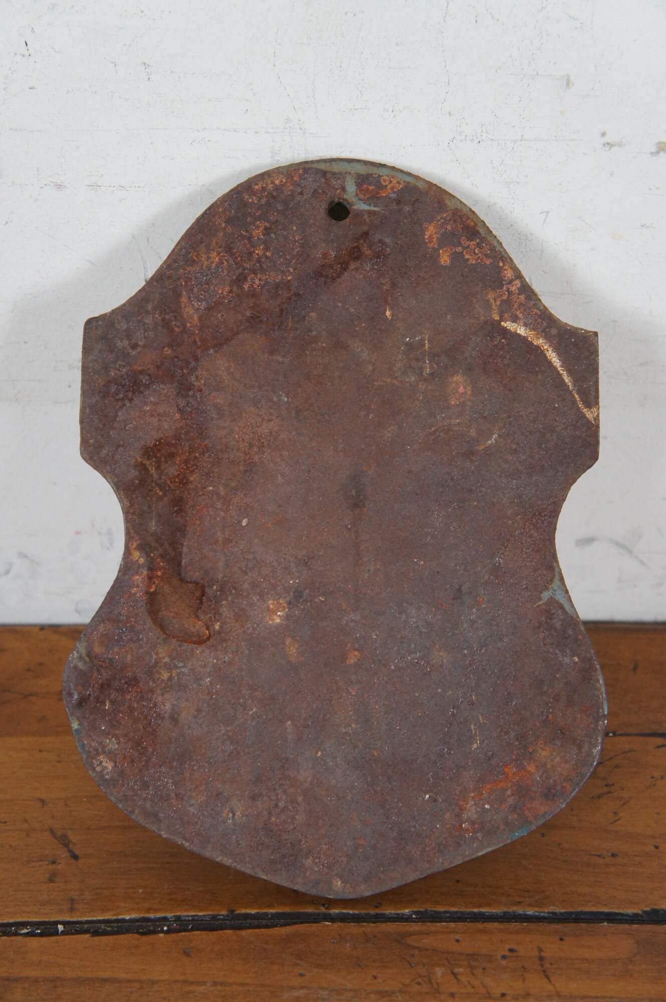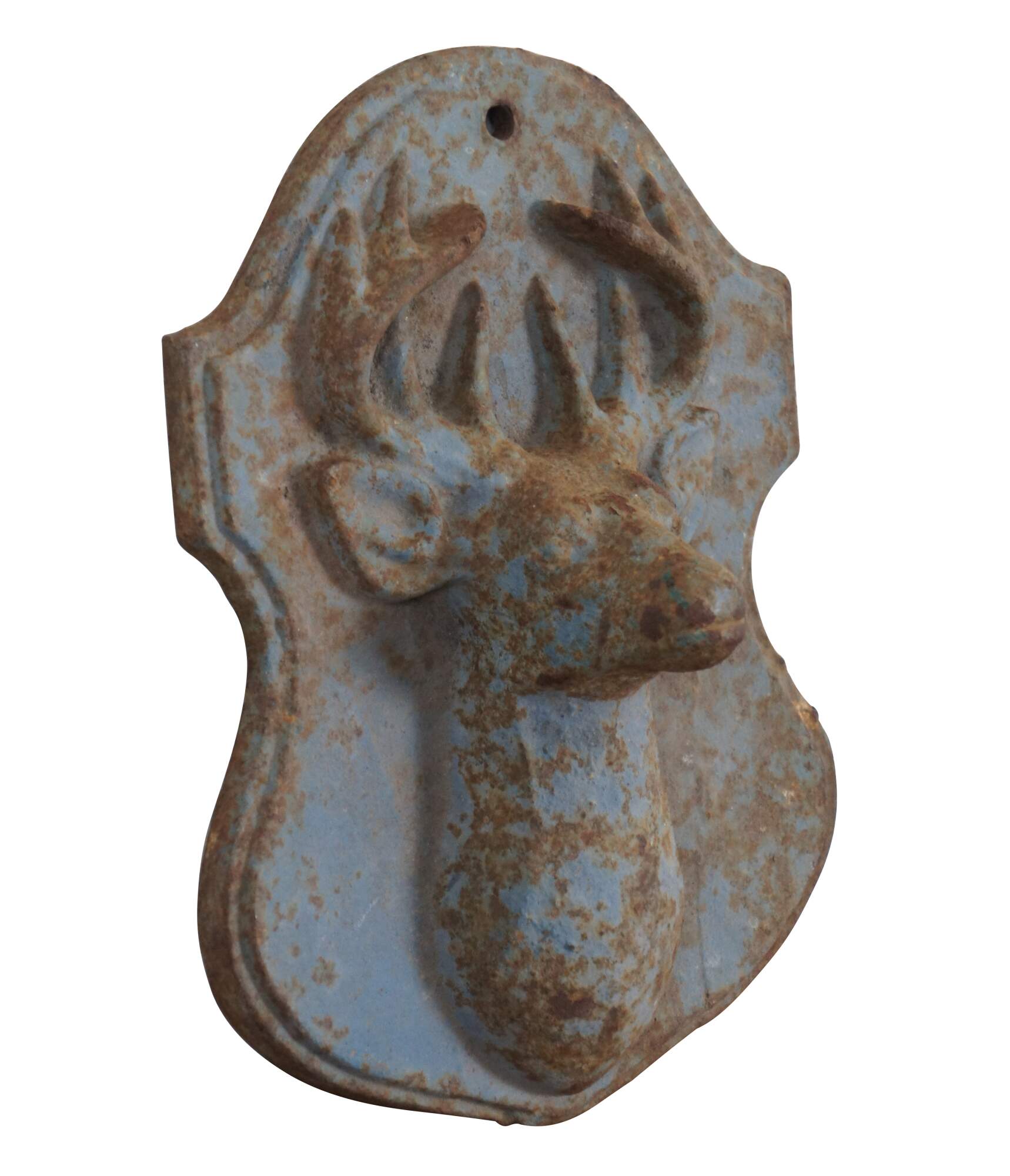 Heavy vintage cast iron wall hanging plaque in the shape of a shield with a rounded top, mounted with the head of a buck / deer. Painted light blue.