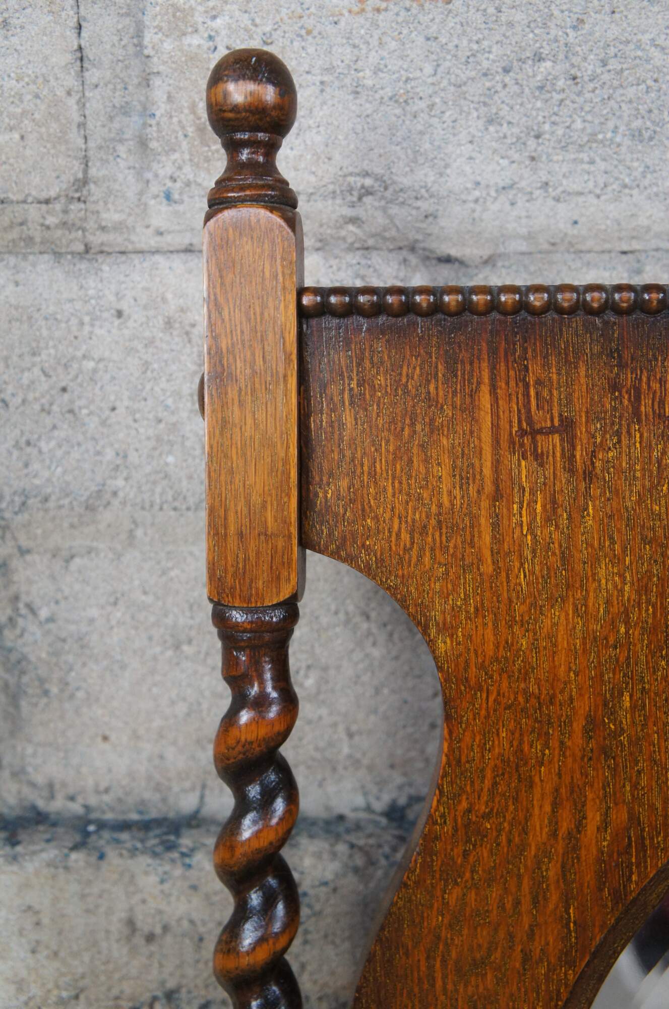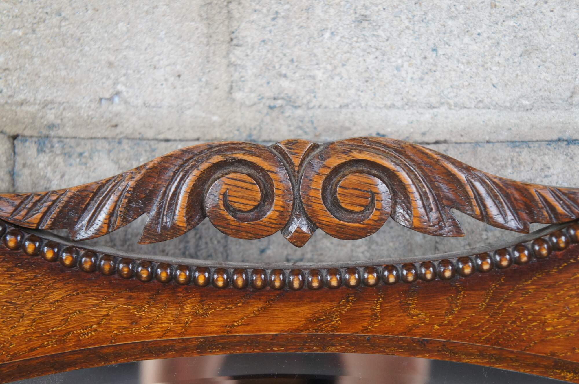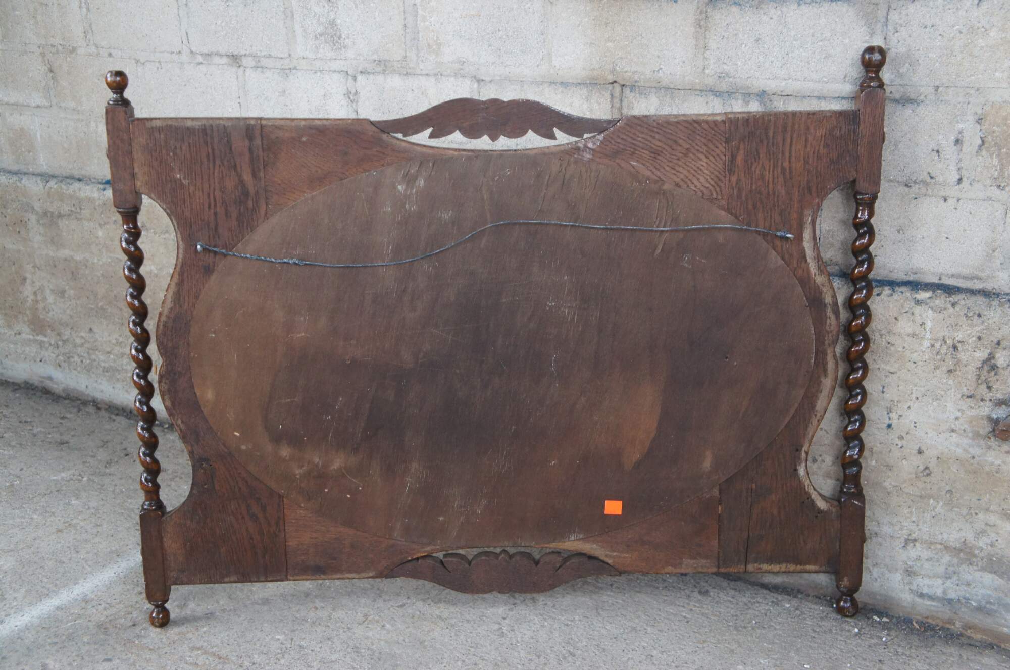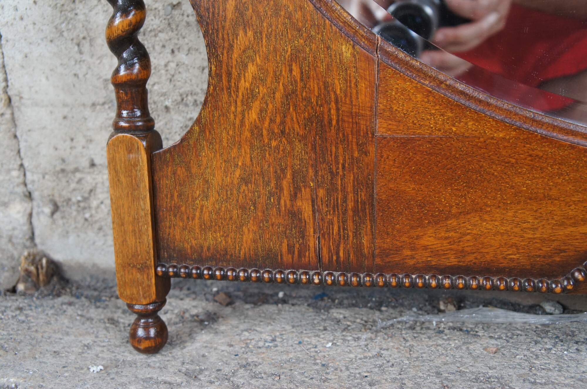 Antique Victorian parlor vanity mirror. Made of quartersawn oak featuring ornate accents with gadrooned edge, ornate carvings, barley twisted supports and beveled oval mirror.