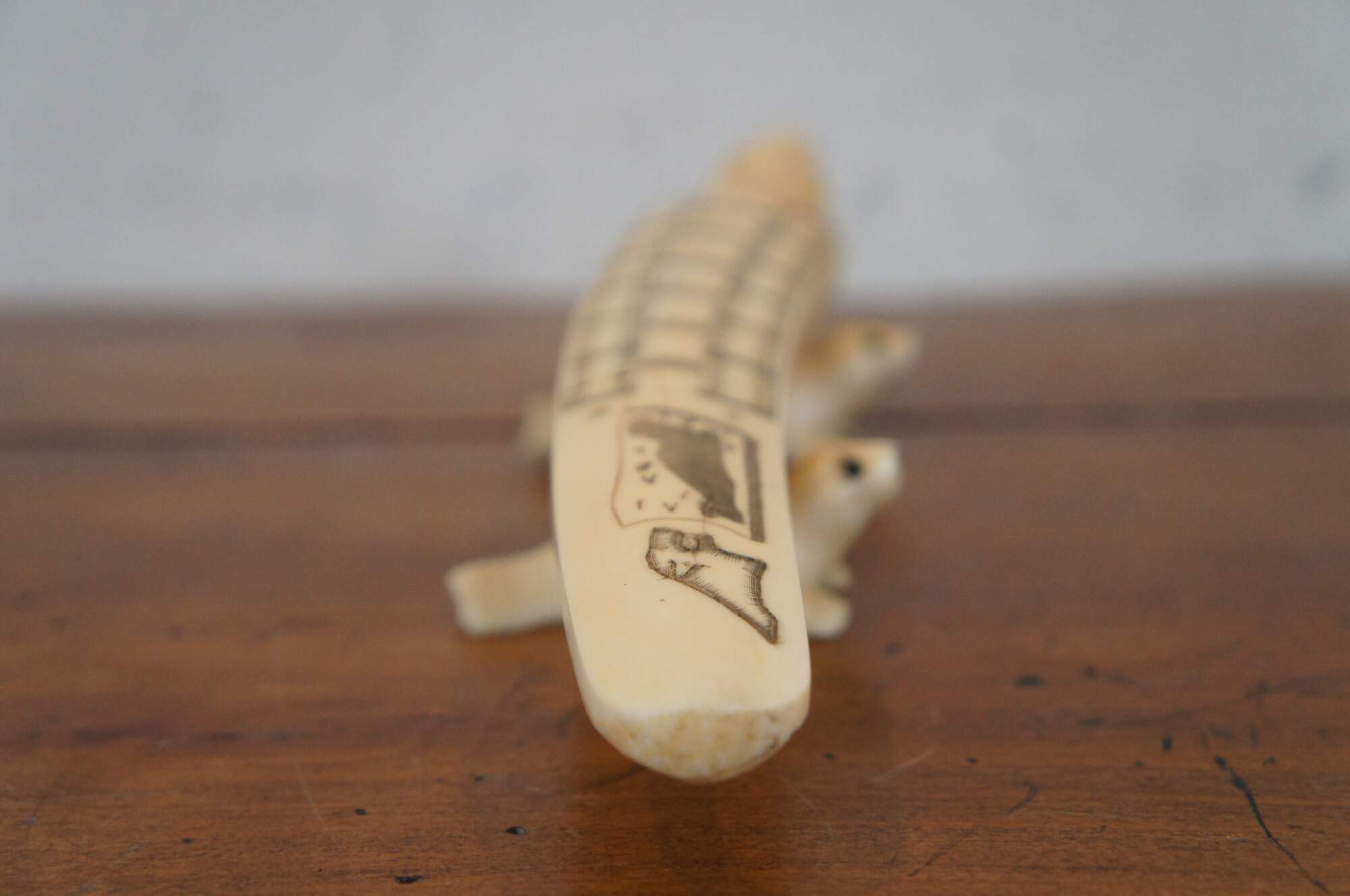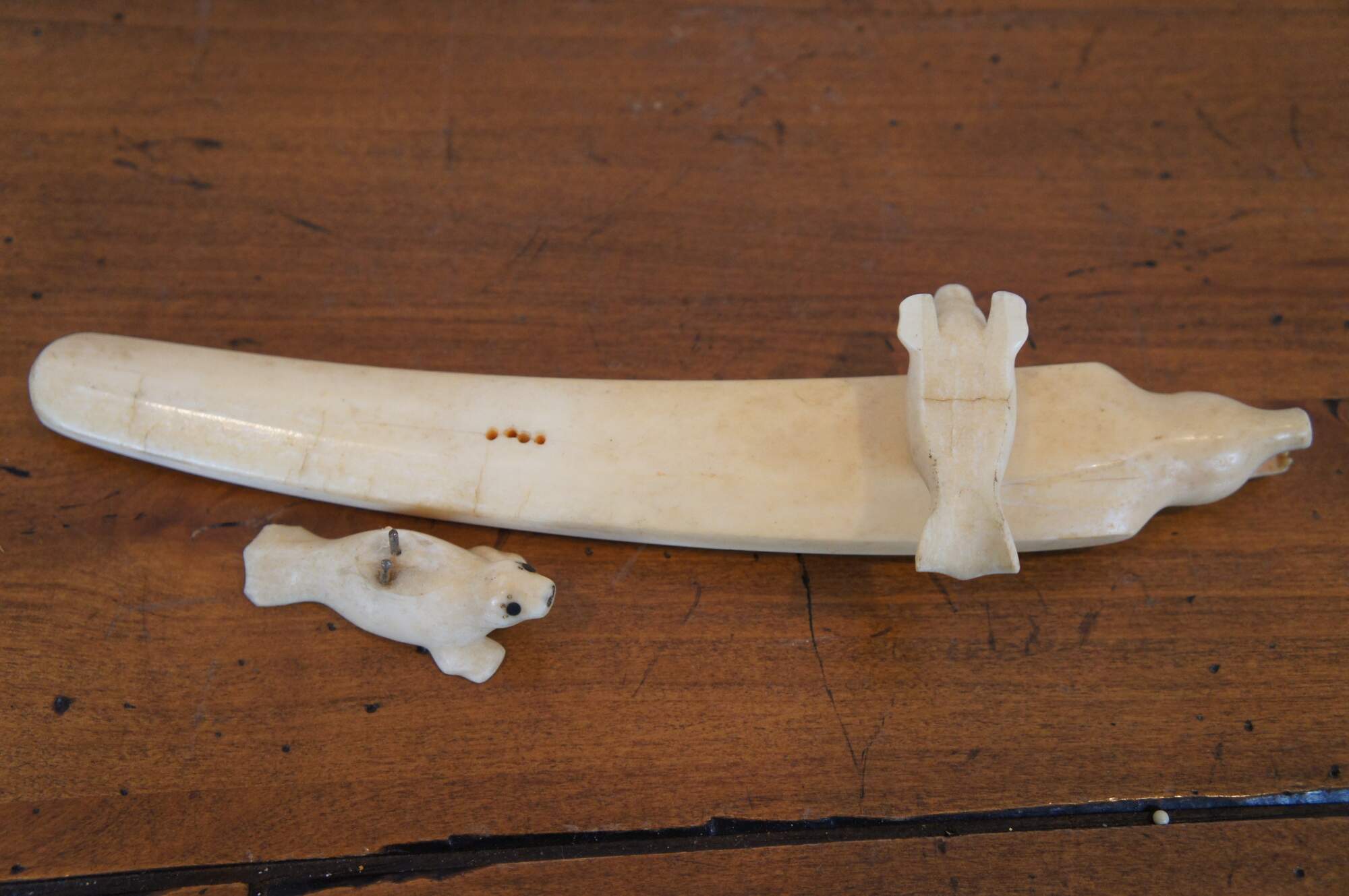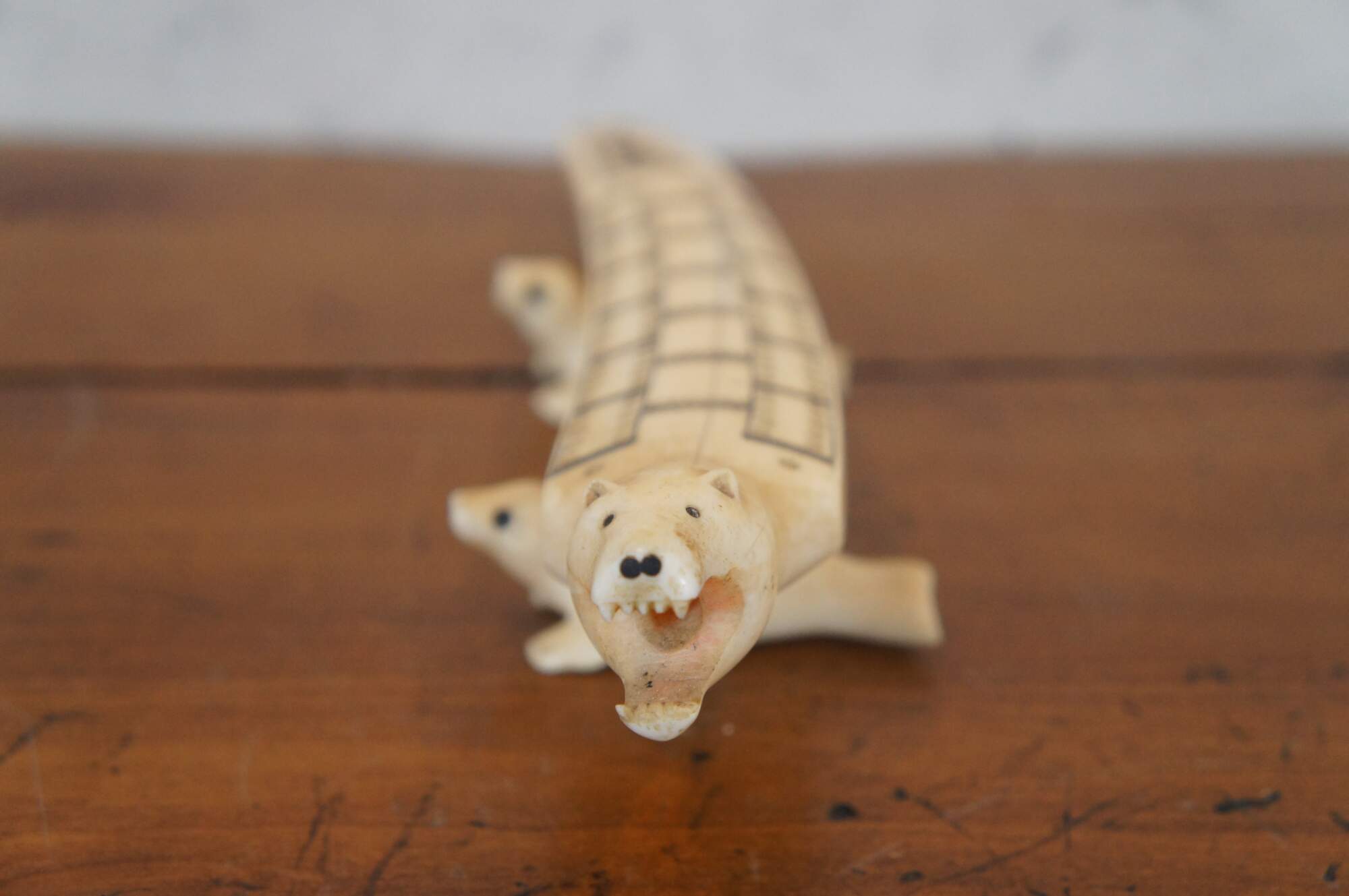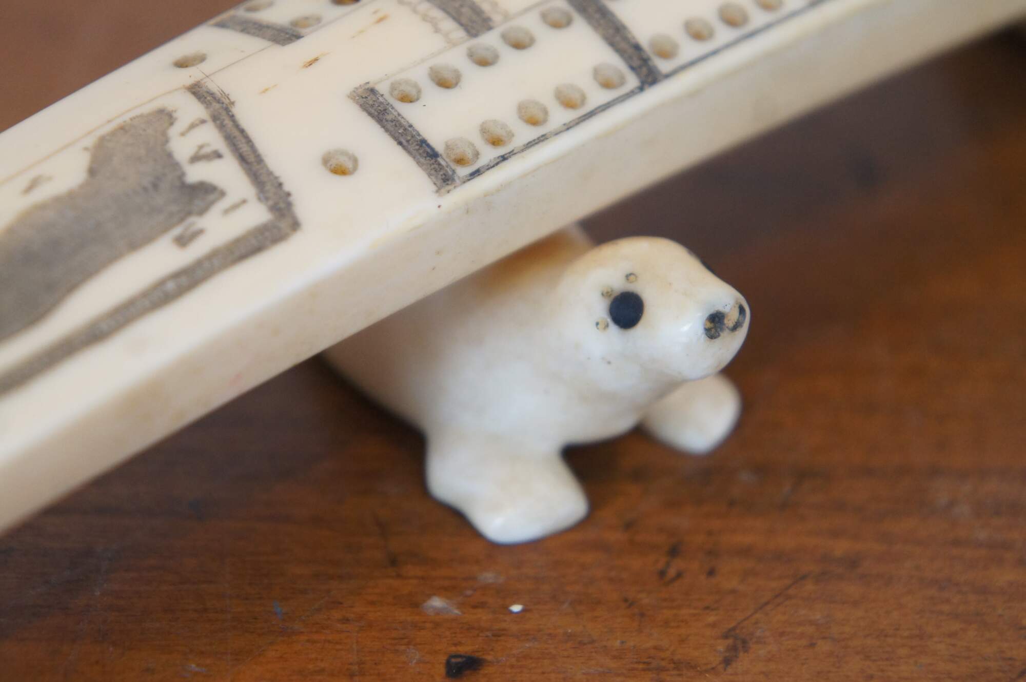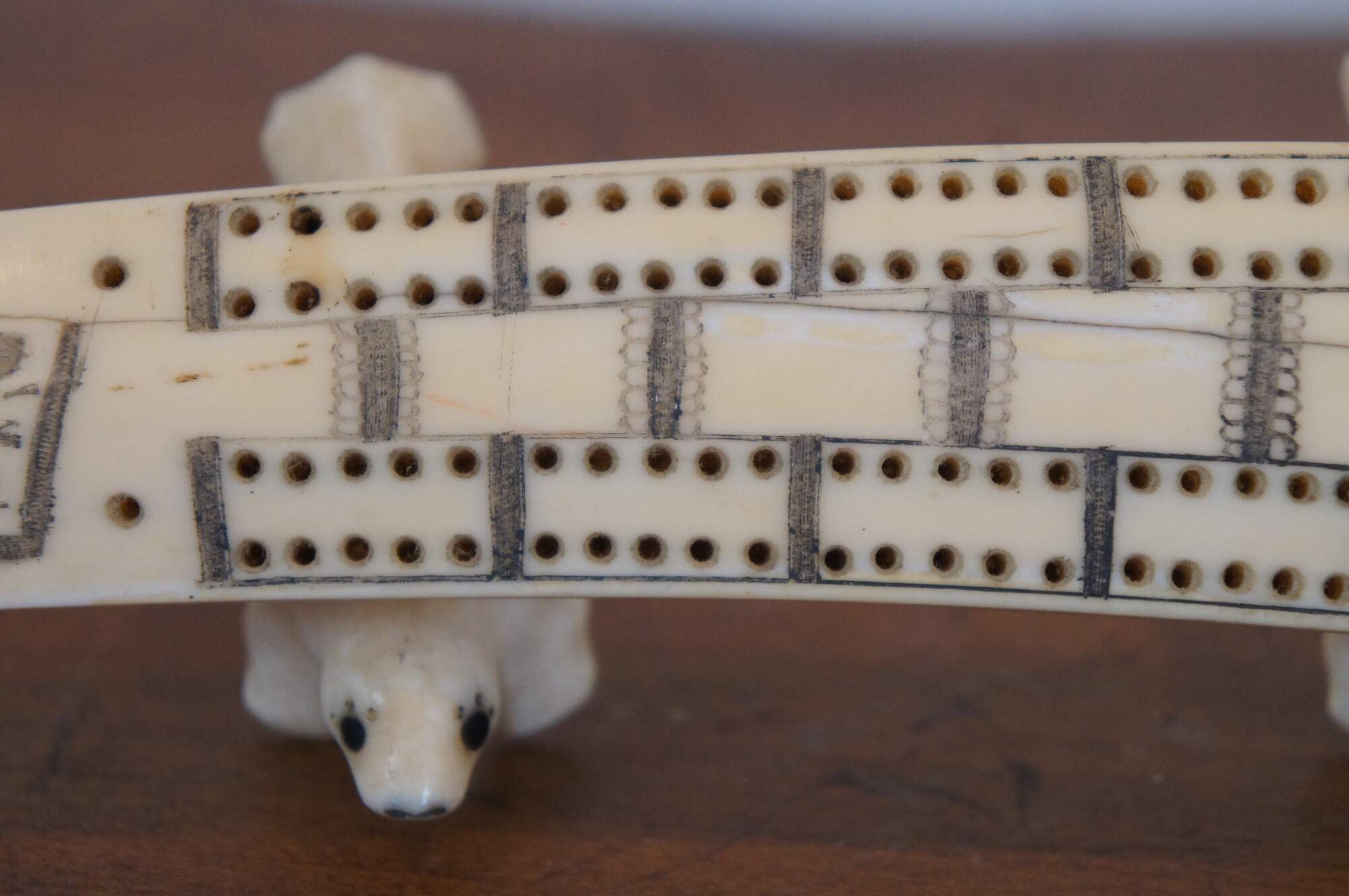 Antique Inuit folk art carved bone cribbage board featuring a Polar Bear propped up by Seals.