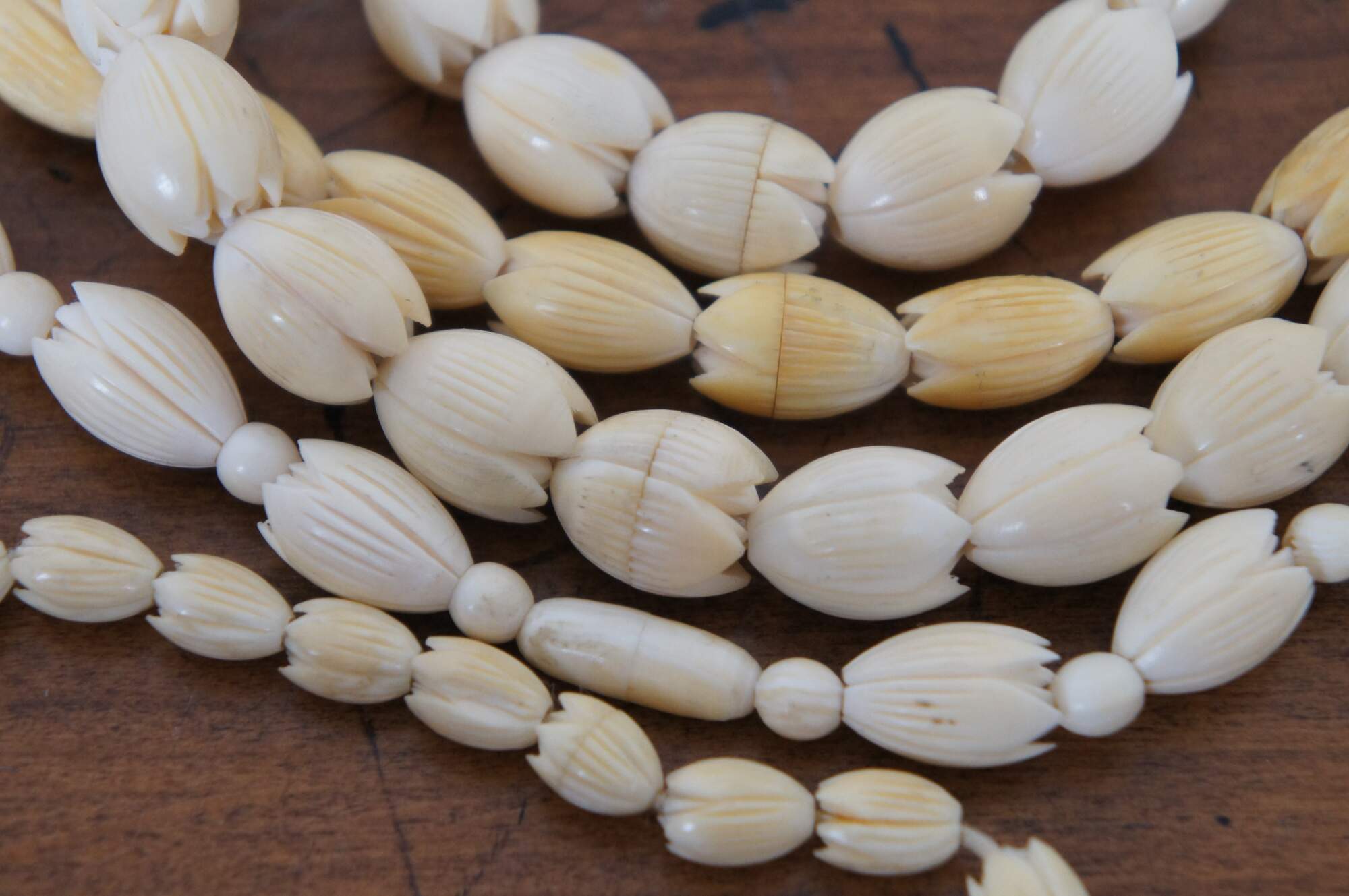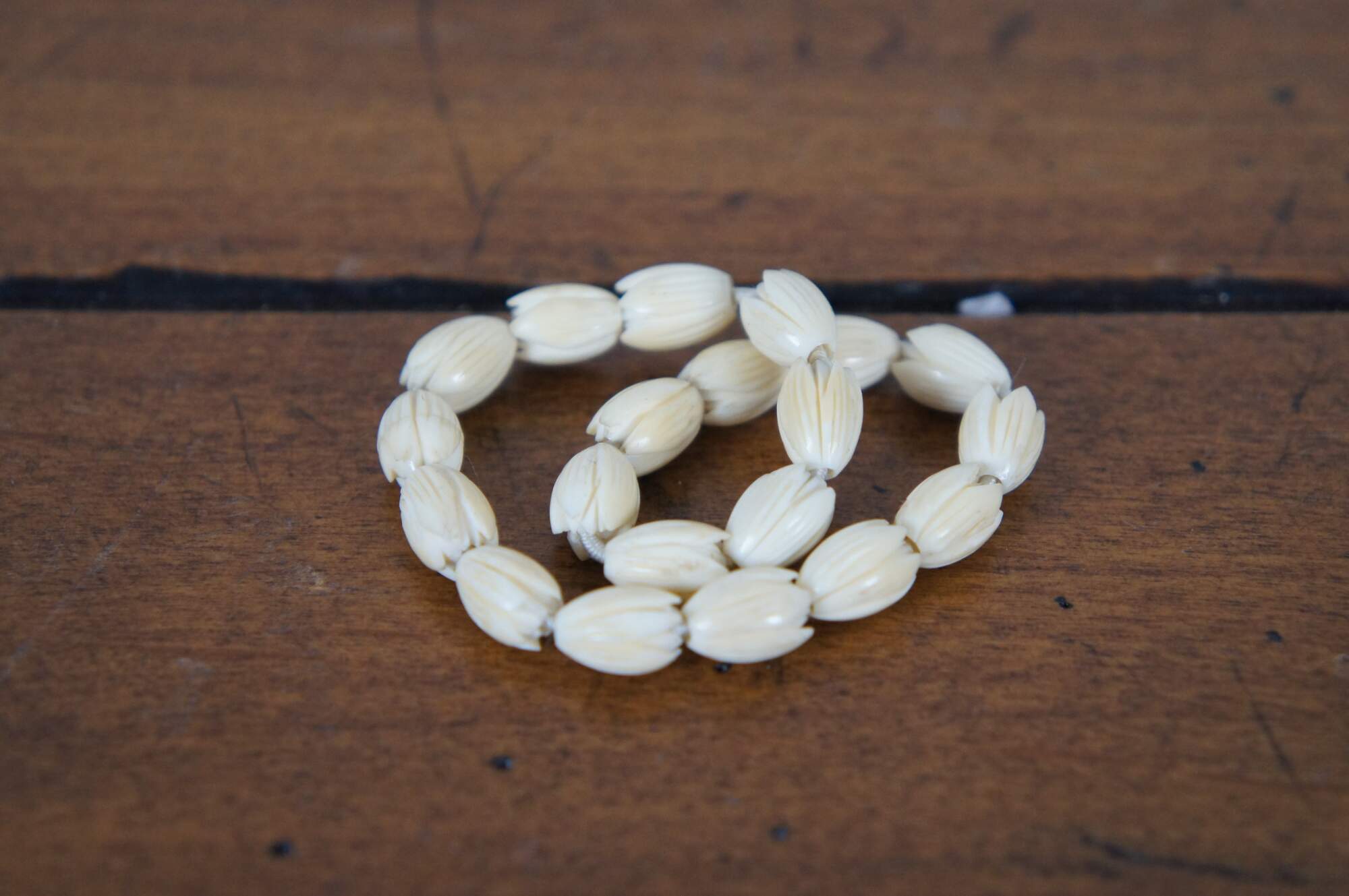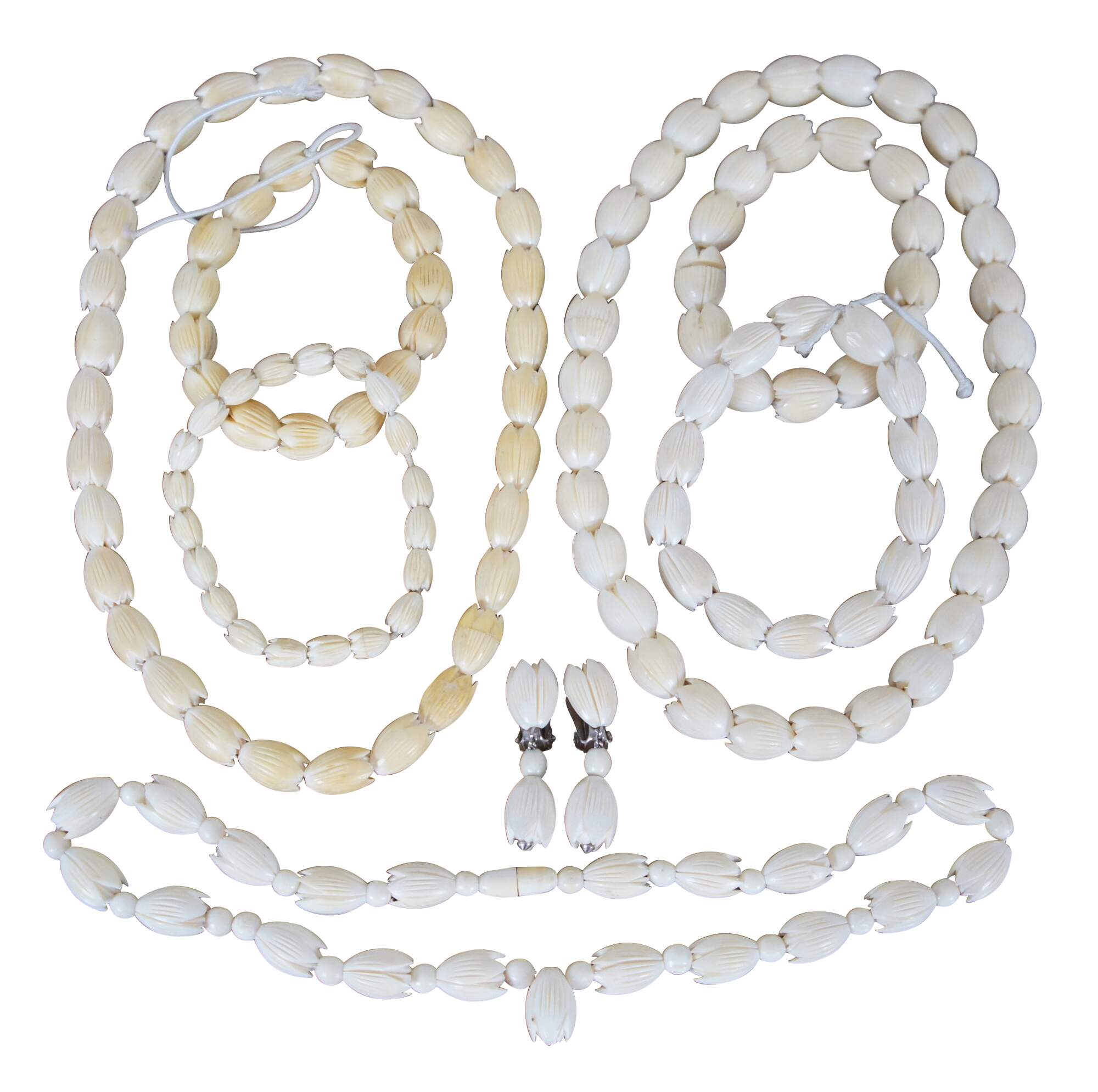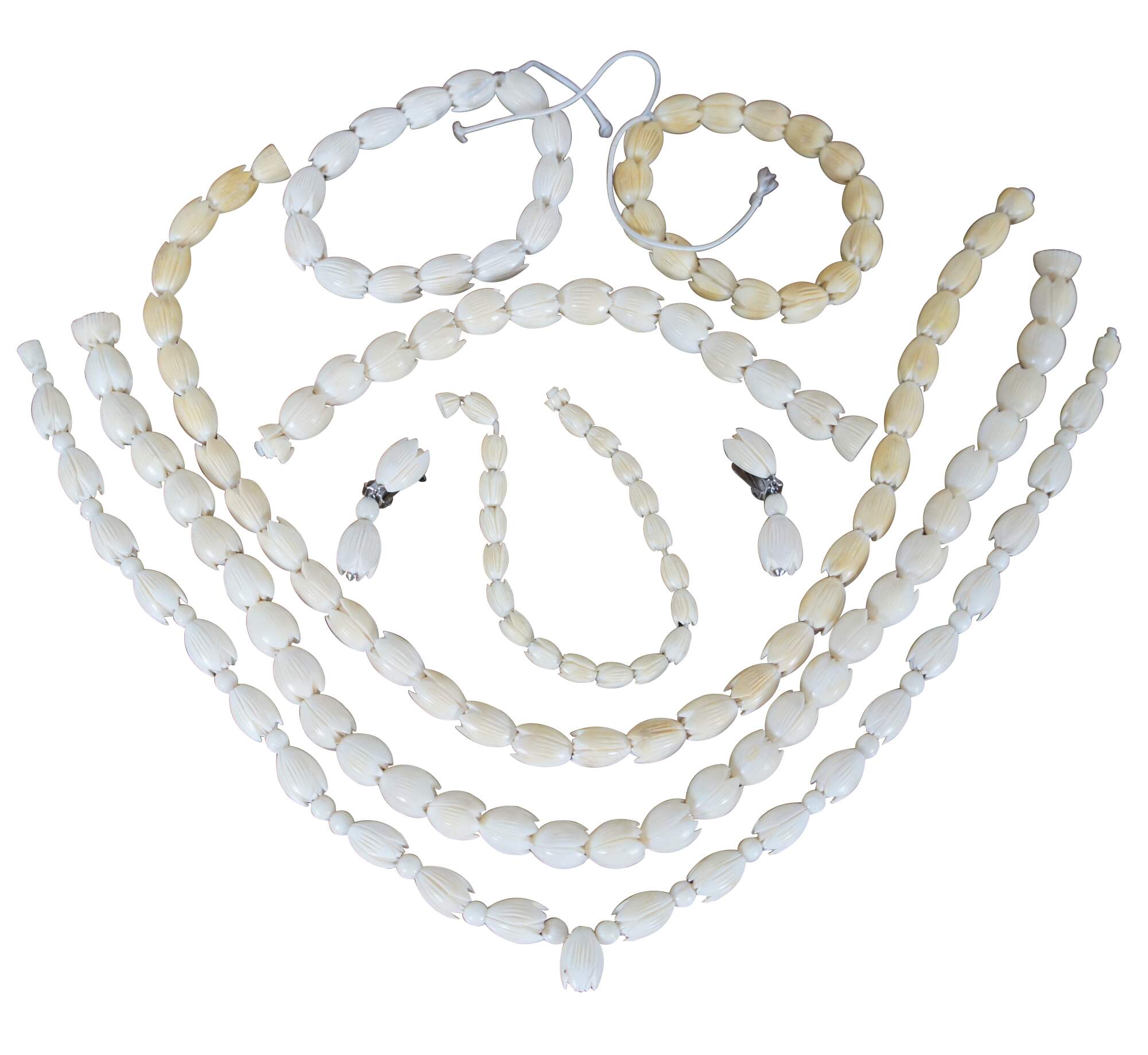 Vintage carved bone jewelry featuring Hawaiian pikake flowers; including three necklaces, four bracelets, and one set of clip-on earrings; feature hidden carved barrel clasps.