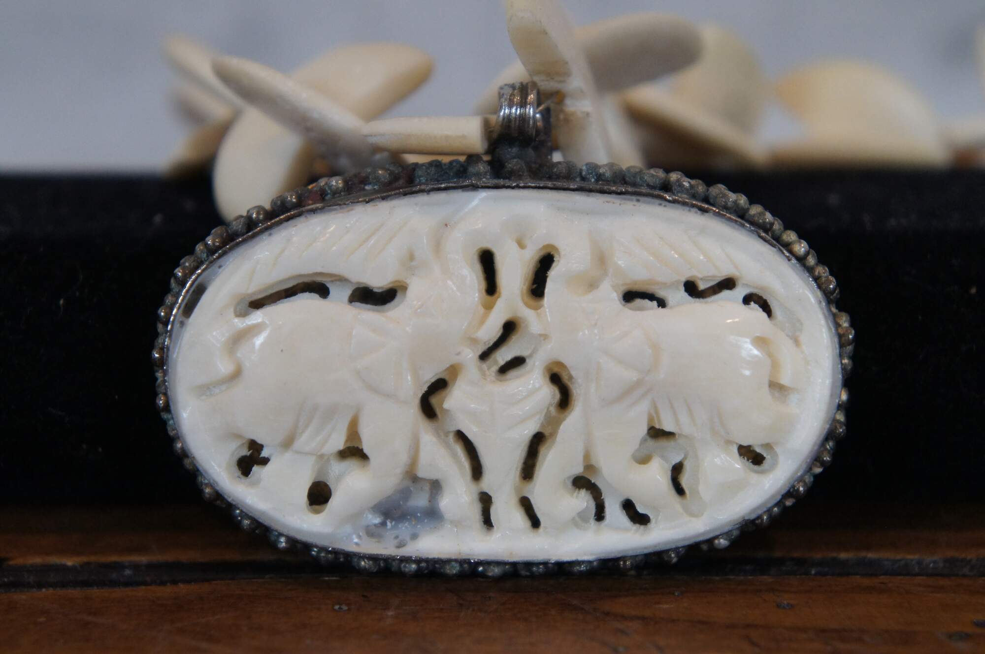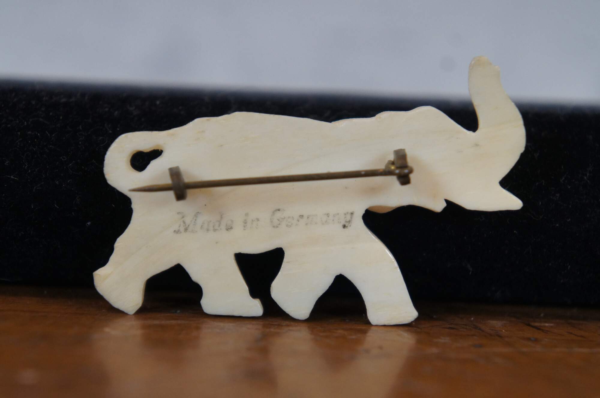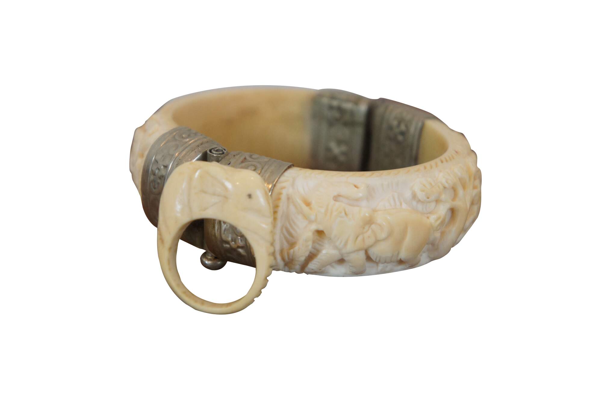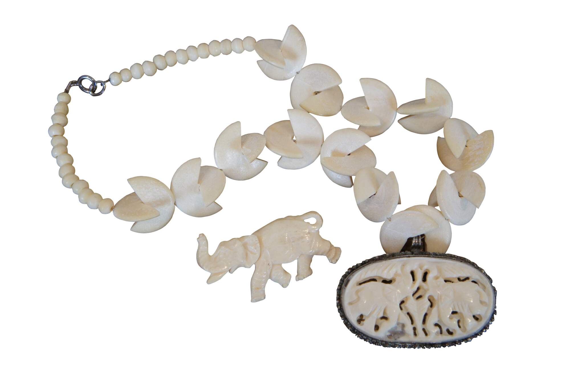 Four vintage pieces of carved bone jewelry including a beaded necklace of half discs and metal trimmed oval pendant, hinged bangle bracelet, pin / brooch, and ring, all featuring an elephant motif. Pin stamped Made in Germany.