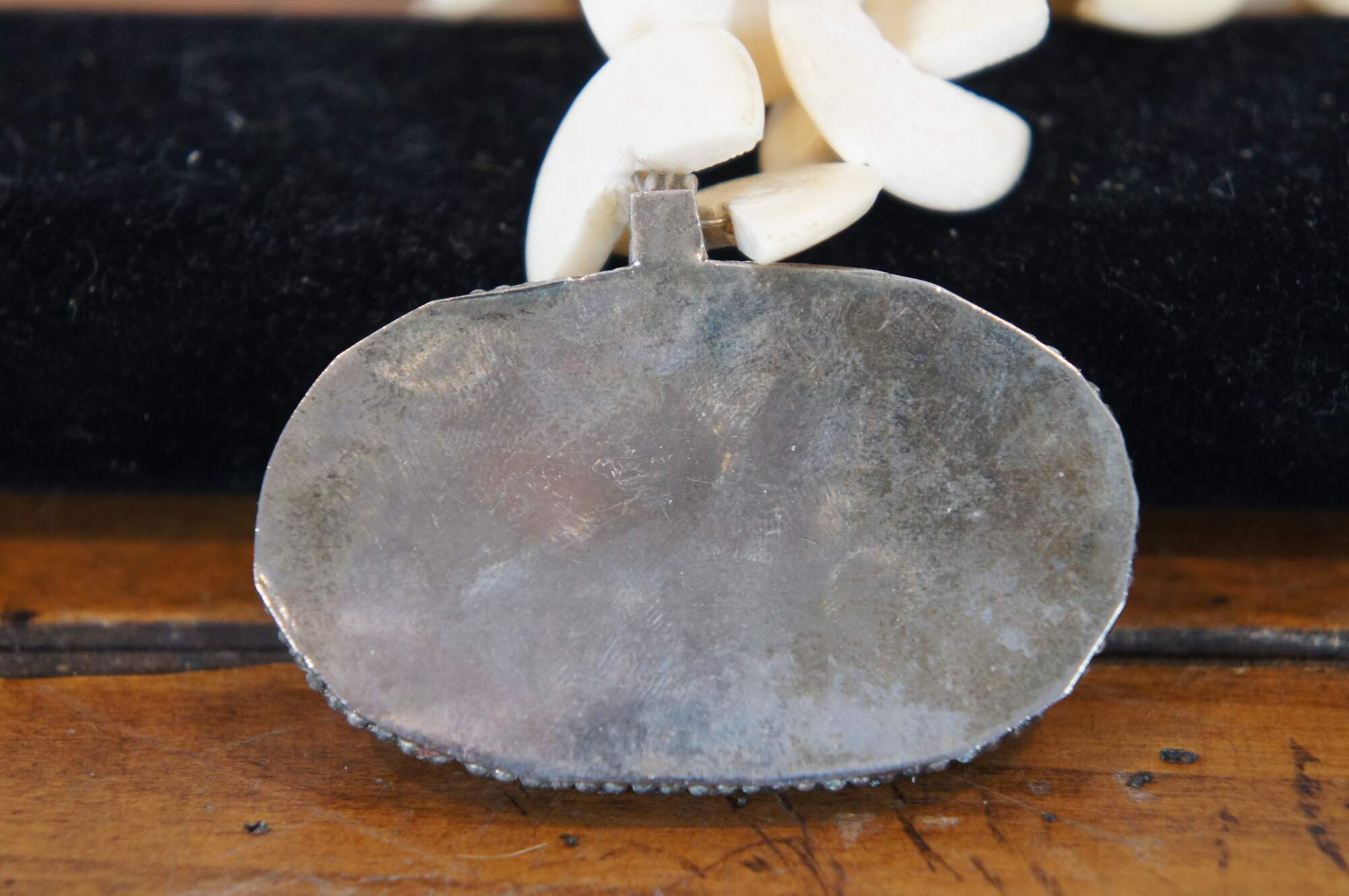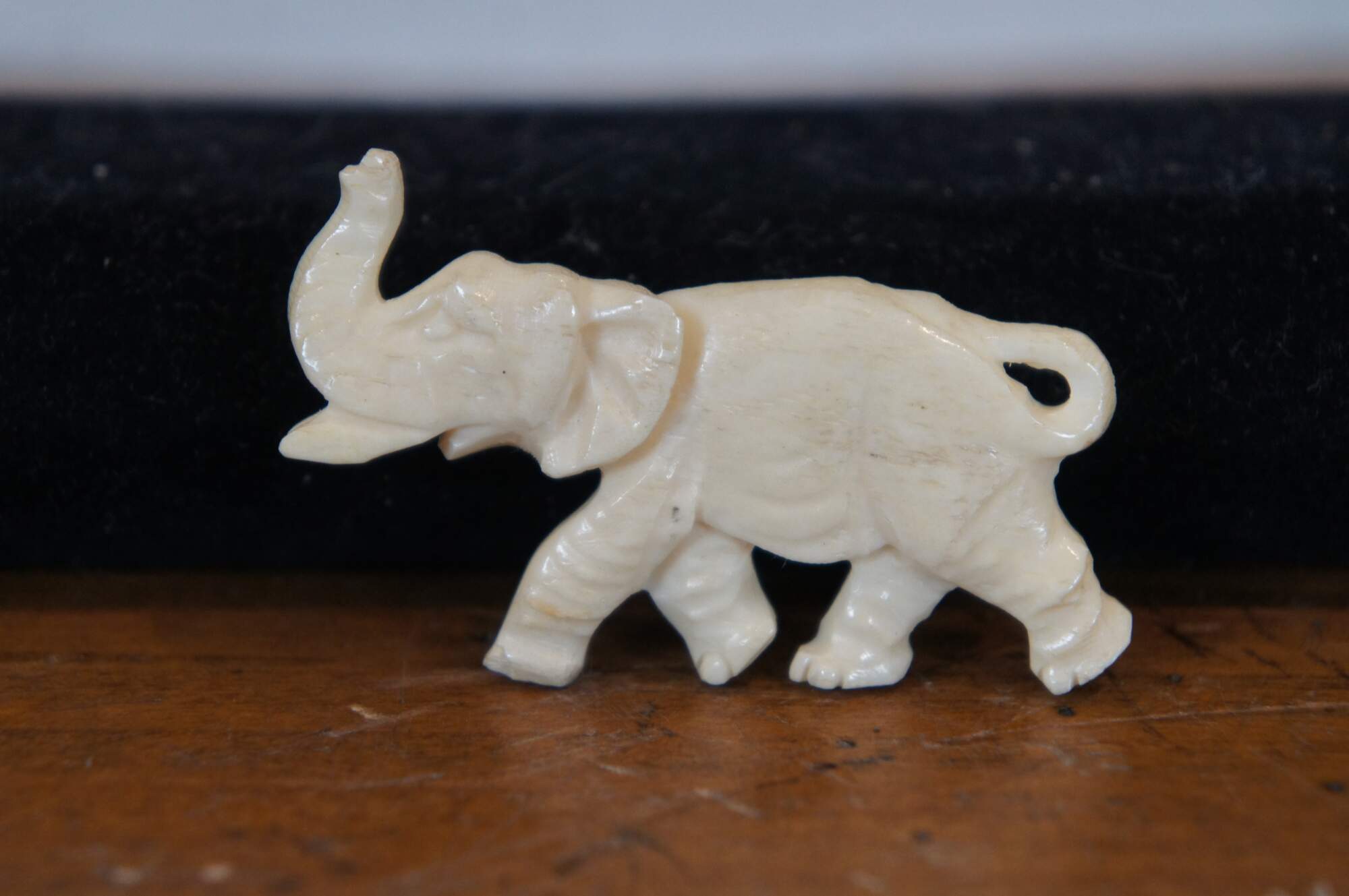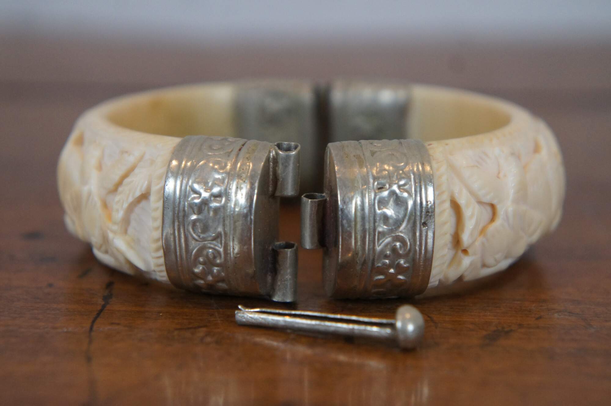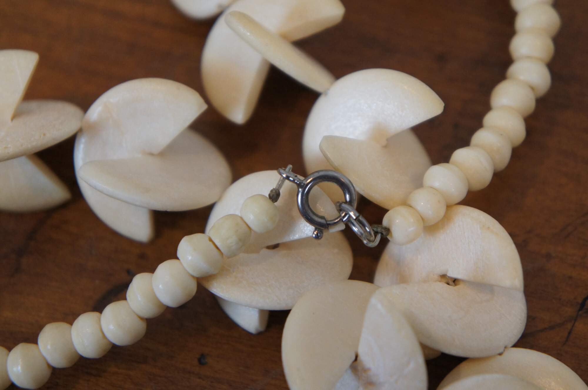 Four vintage pieces of carved bone jewelry including a beaded necklace of half discs and metal trimmed oval pendant, hinged bangle bracelet, pin / brooch, and ring, all featuring an elephant motif. Pin stamped Made in Germany.